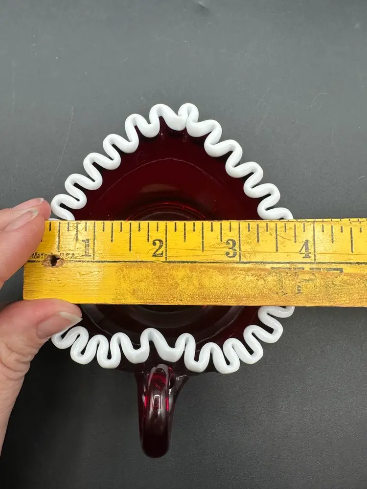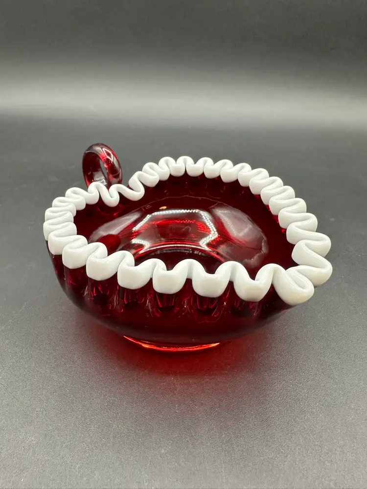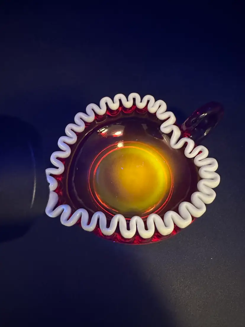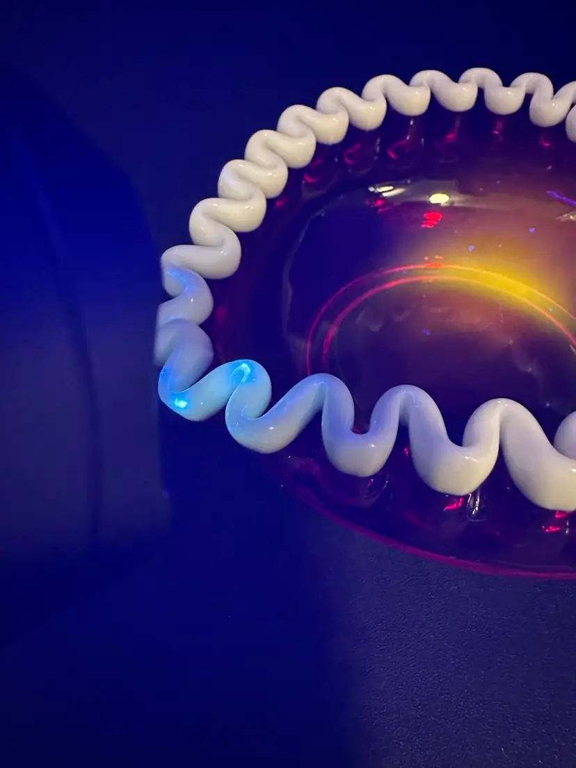 Absolutely gorgeous! The most festive Fenton piece I have had the pleasure of finding! No chips or cracks, glows in UV light. Stamped Fenton on the base!