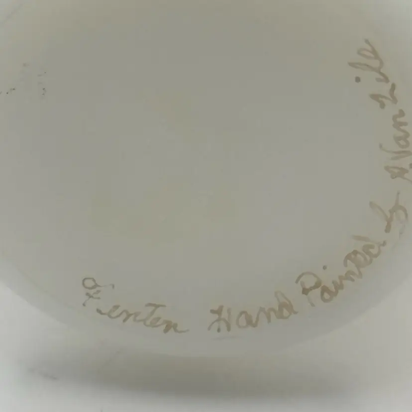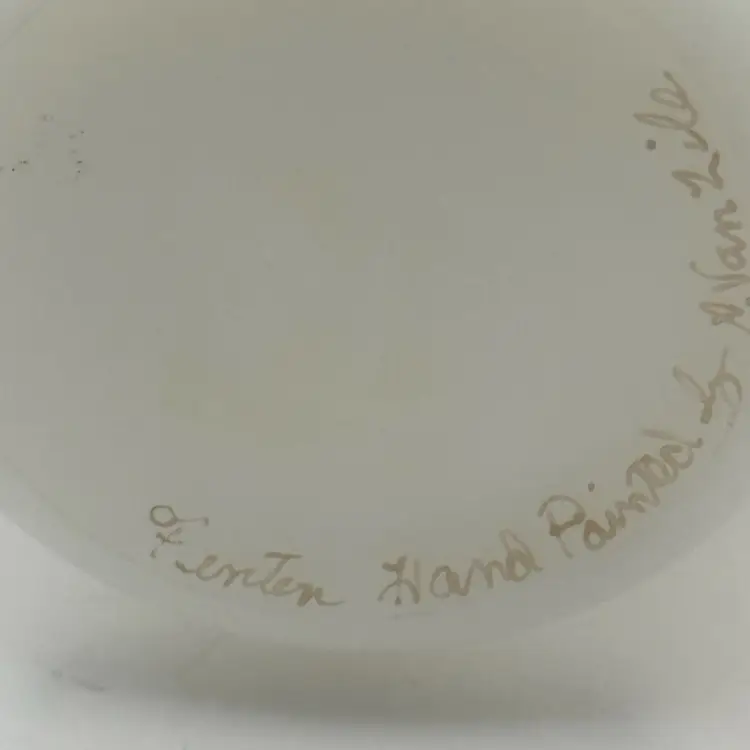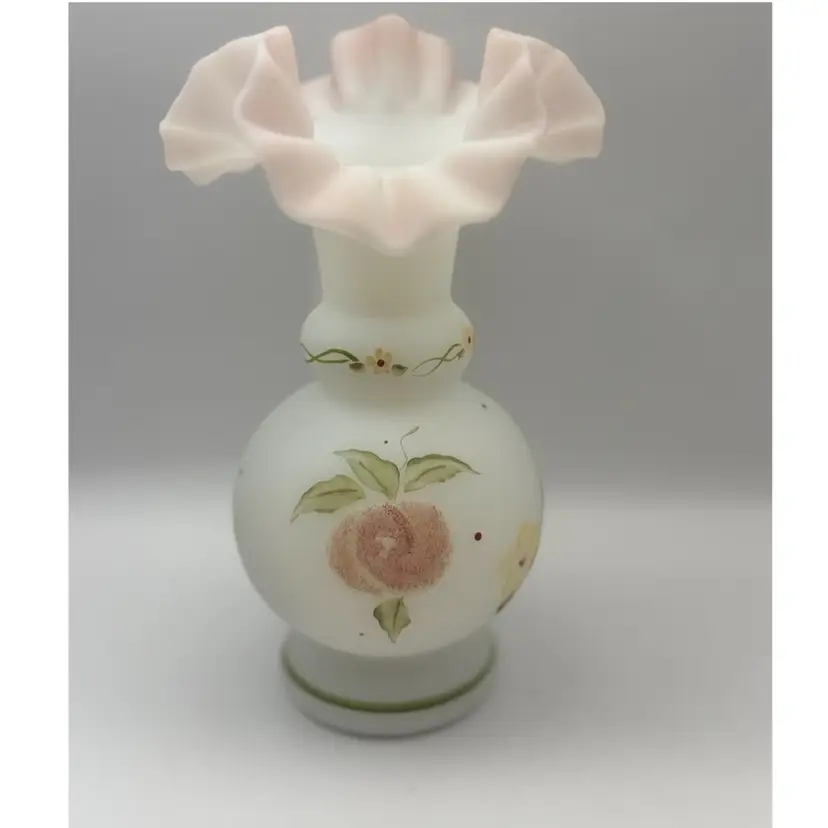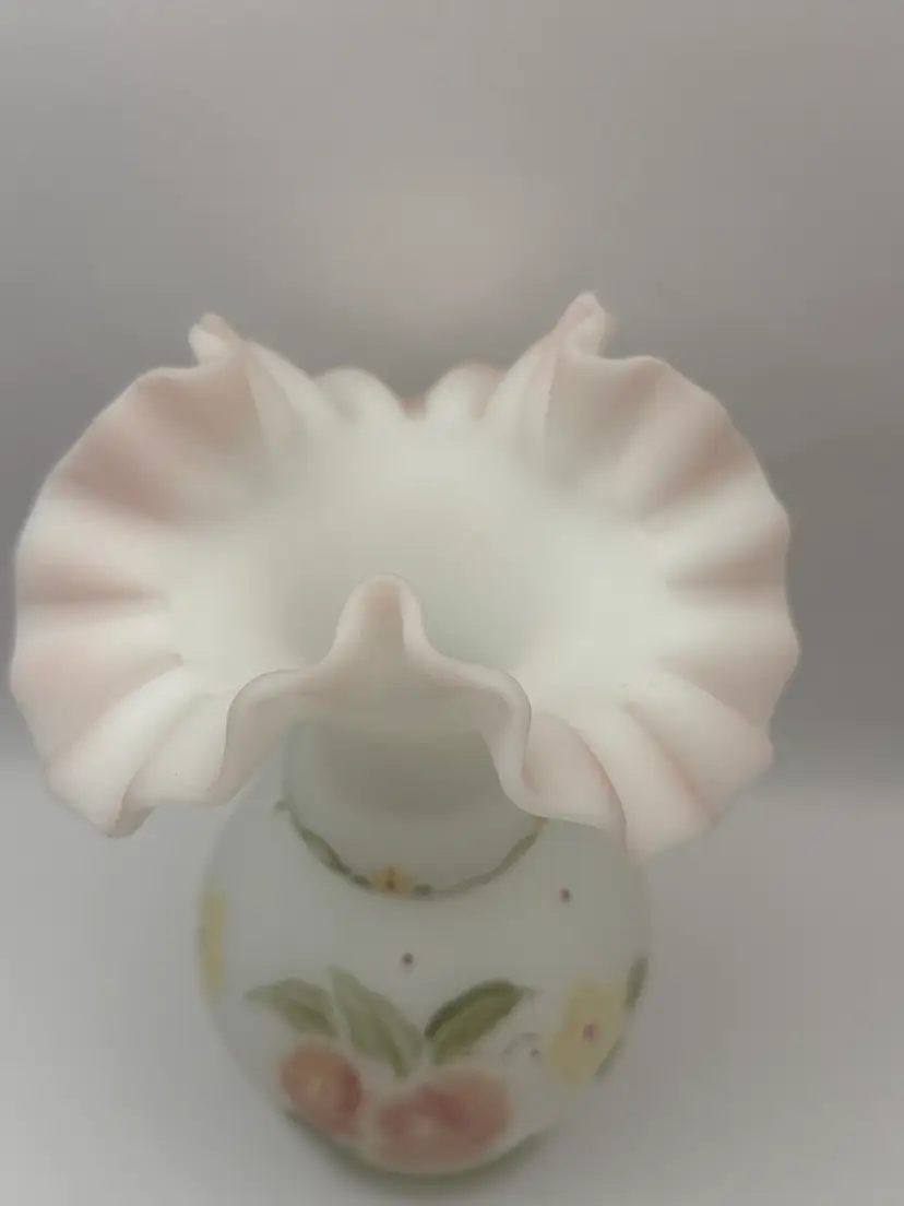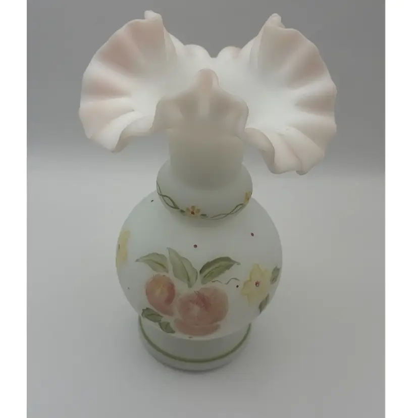 Victorian style ruffle top satin glass vase hand painted and signed by Fenton artist Angela Van Zile . Peaches and blossoms are a rare design which makes it extra special. No chips or cracks 8” tall