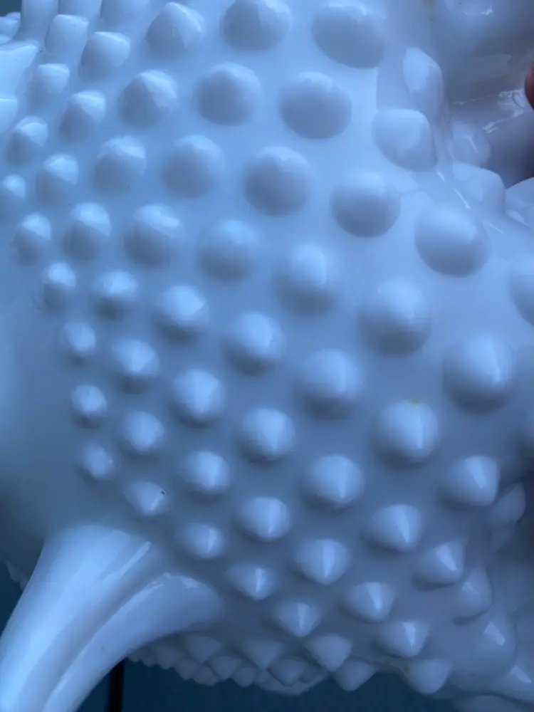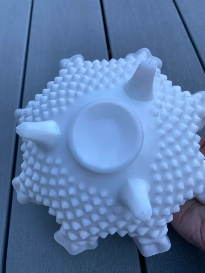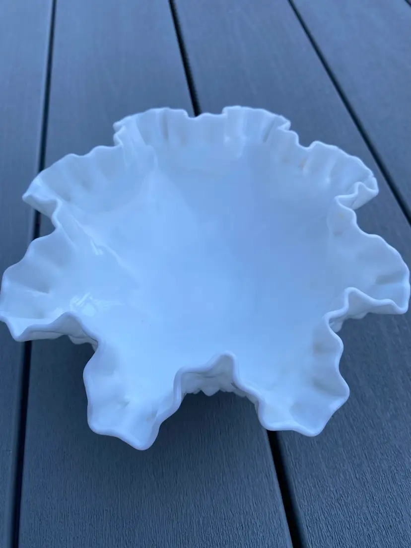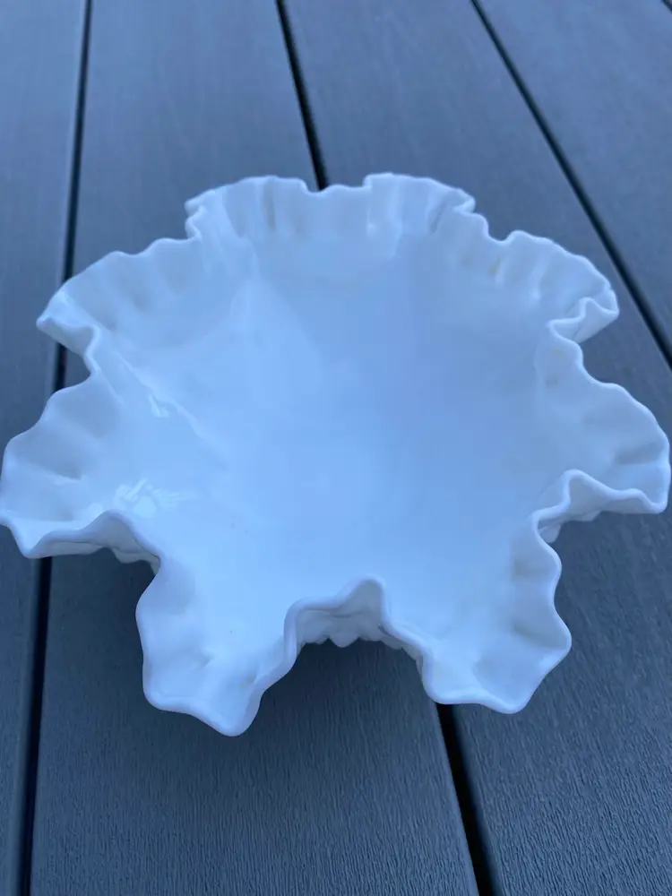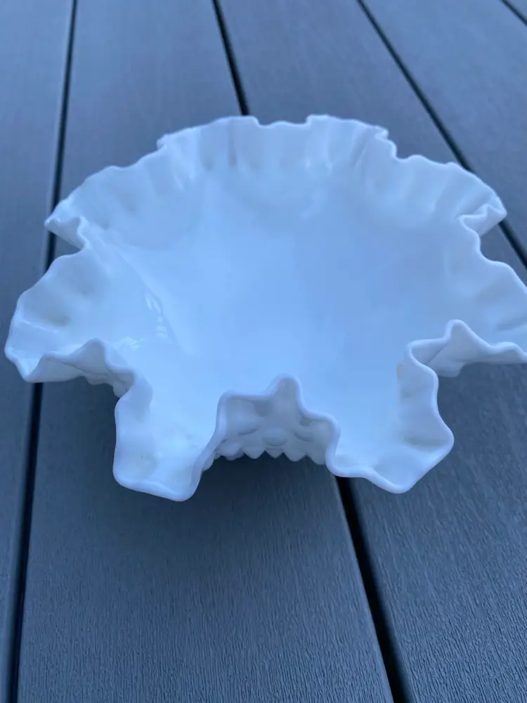 Fenton Art Glass is known for stunning collectible glassware - and this WHITE FENTON HOBNAIL RUFFLED MILK GLASS BON BON OR CANDY BOWL truly showcases their unparalleled quality and beauty! This bon bon or candy bowl has a rounded shape and measures approximately eight inches across. The gorgeous white milk glass is showcased by a hobnail design that covers the exterior of this piece. Its ruffled edges are a truly special detail that gives this bowl a wavy, fluid look. The interior of the glass is smooth, allowing you to fully appreciate the simple beauty of the white milk glass. This candy dish is in excellent condition with no chips or scratches.