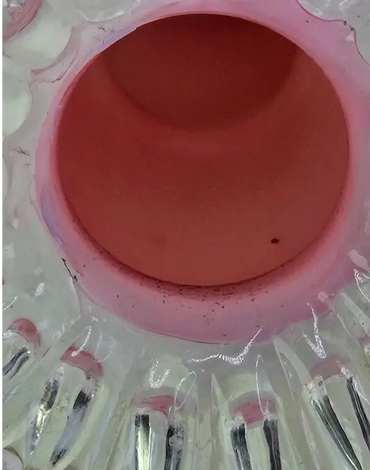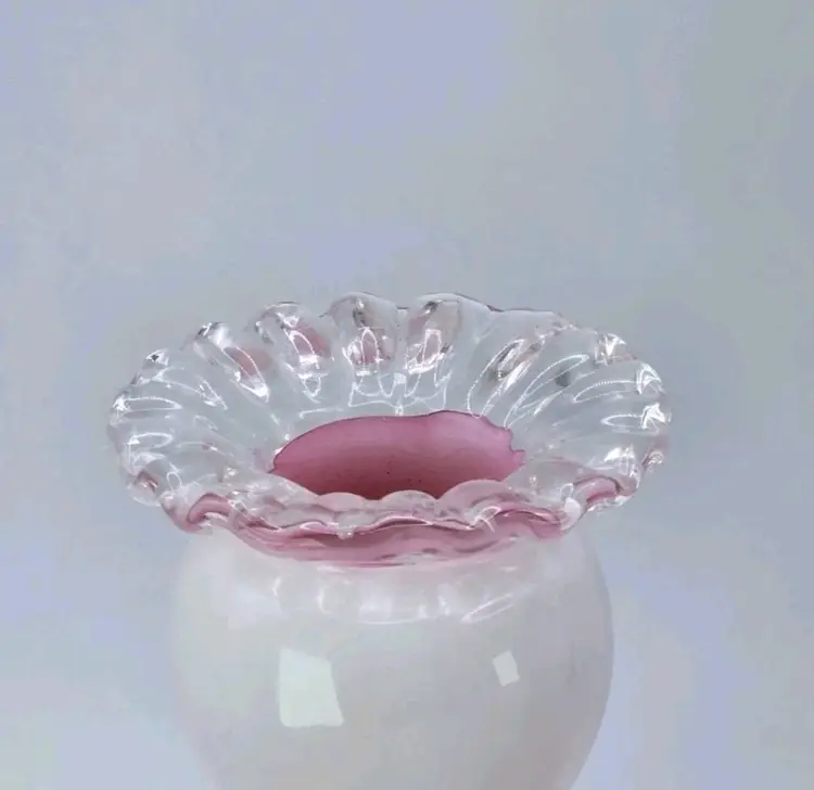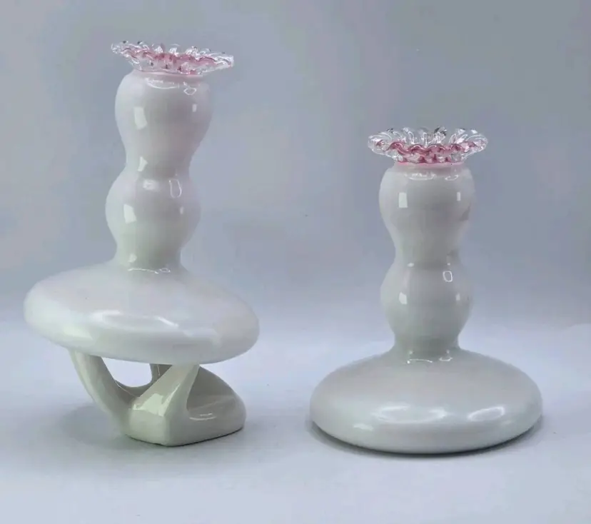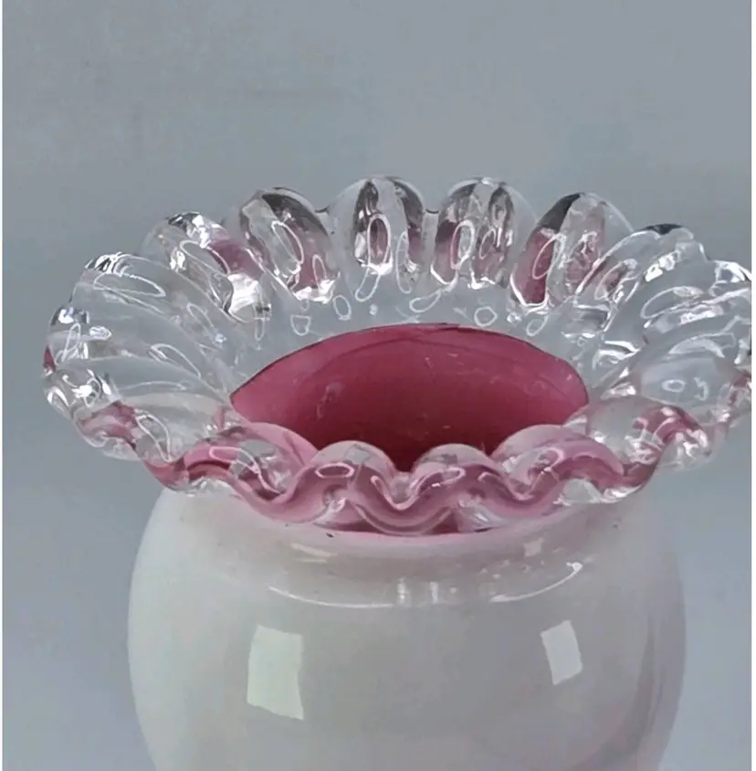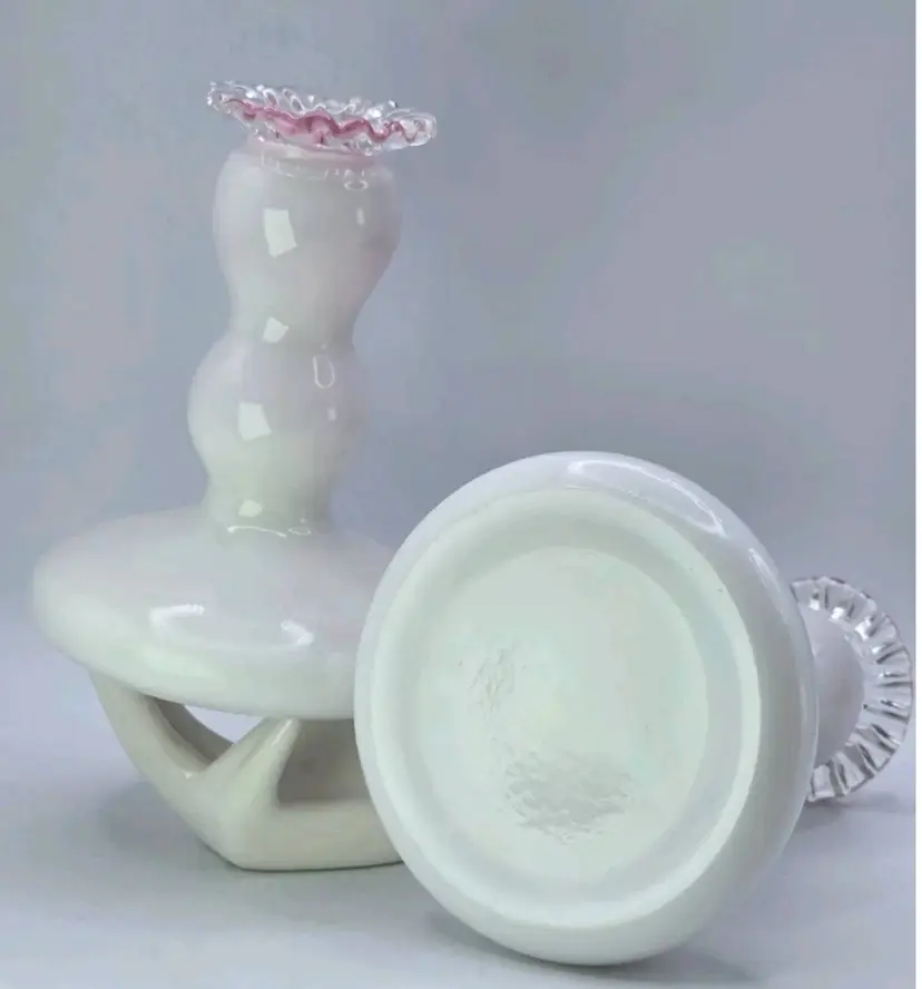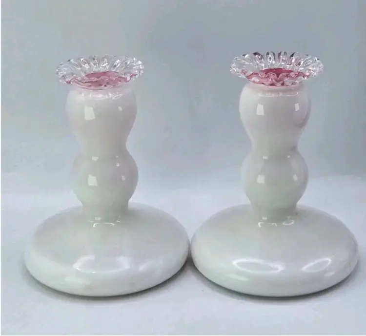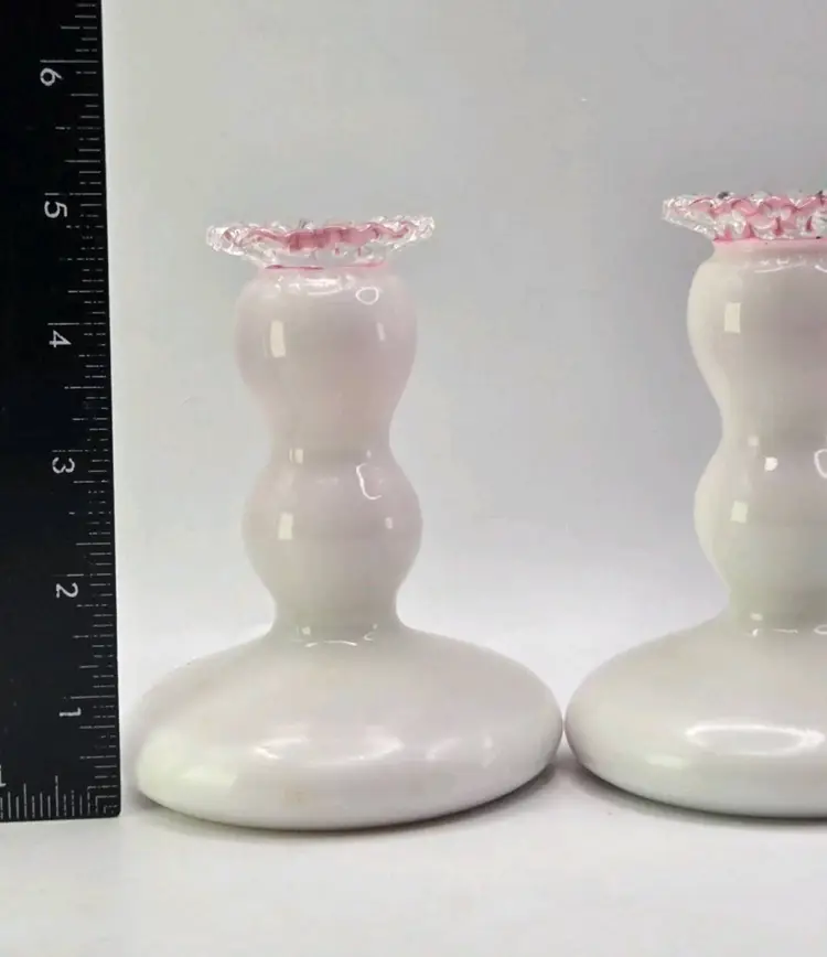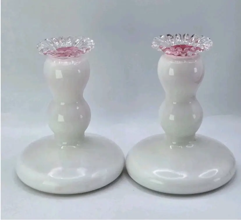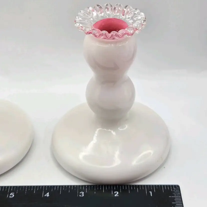 Fenton S/2 Rose (Pink) Cased Silver Crest Candlesticks • Crimped Rim 4-3/4"H Fenton Pair of Candlestick Holders, 1940s Fenton Pink/Milkglass Ruffle Glassware Approx 4.75" H X " W X 3.5" Length Very good condition. No chips, cracks, or breaks. Areas of minimal wear are possible due to age, handling, and storage. See pictures.