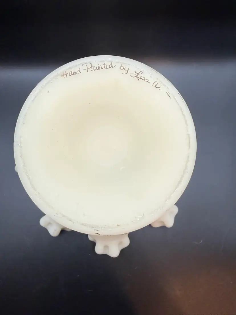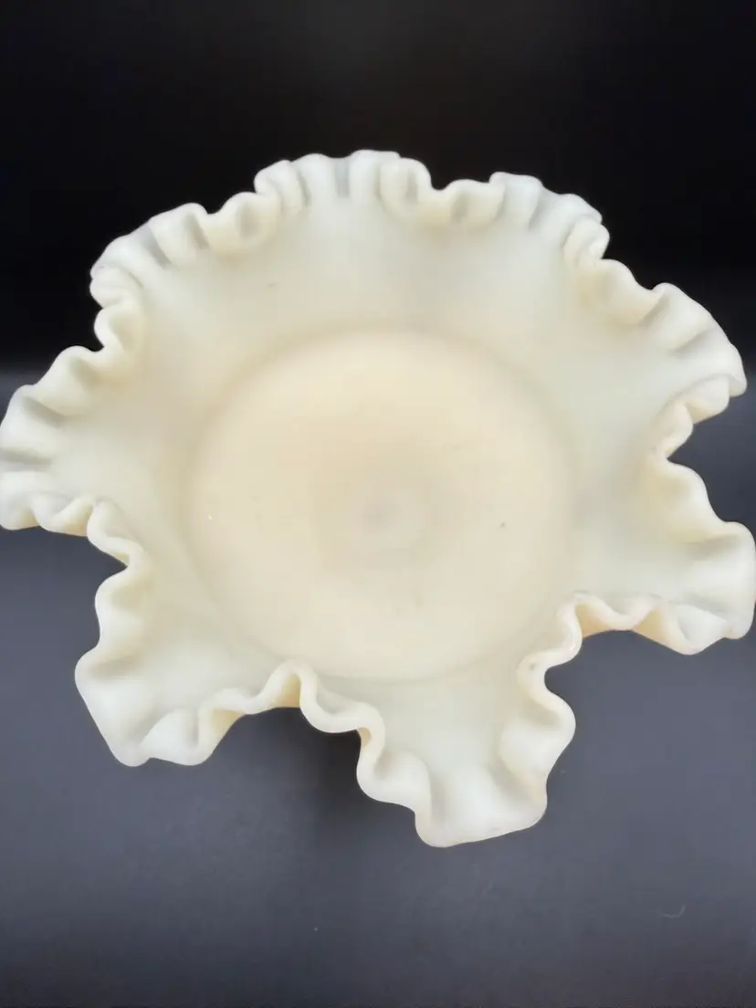 This particular piece is likely from the mid-20th century, a period when Fenton excelled in producing satin glass with delicate hand-painted motifs like the yellow roses seen here. The ruffled rim and pedestal base are classic design elements.