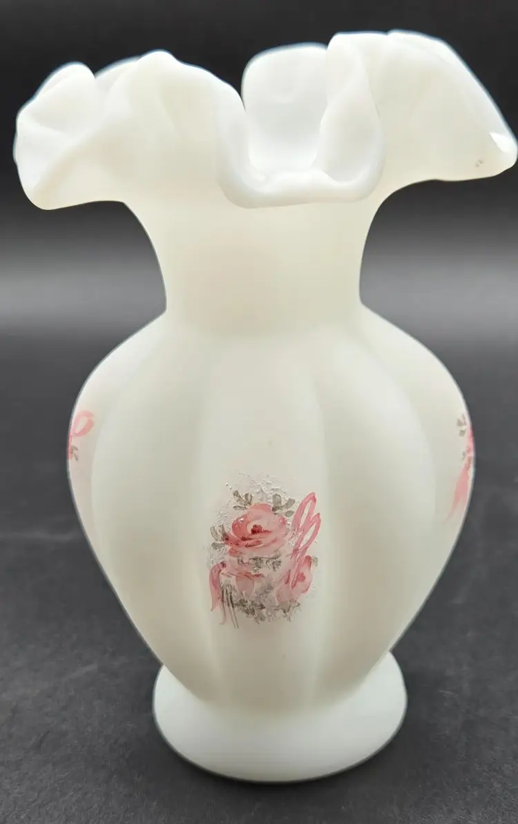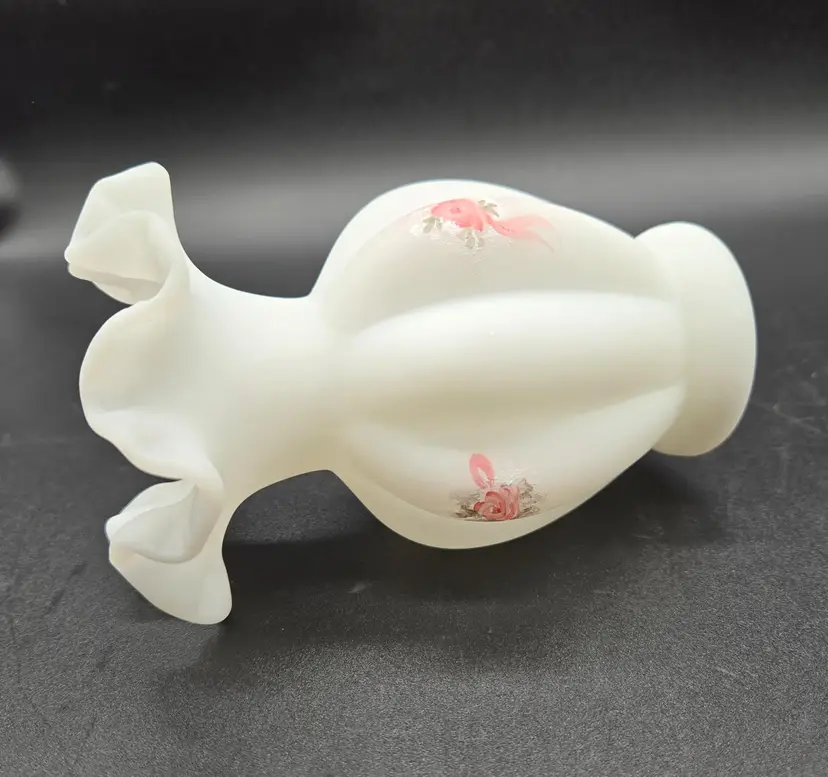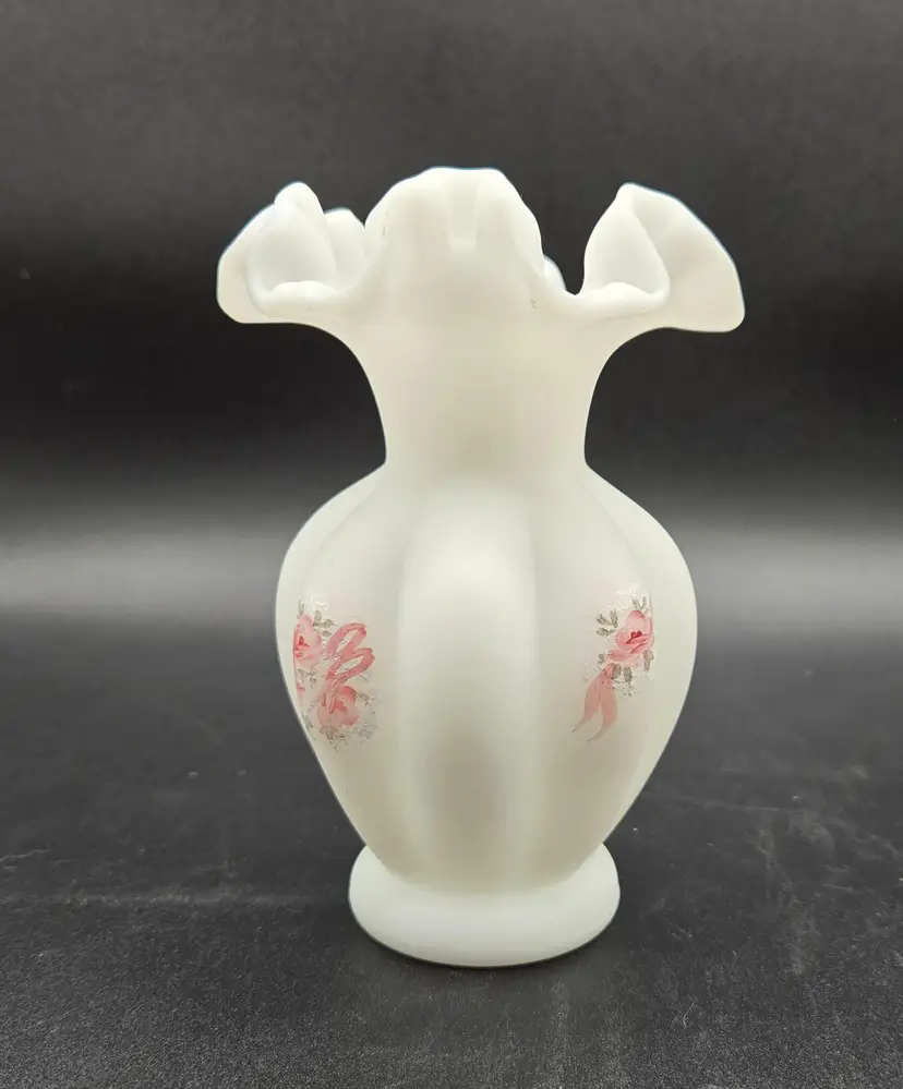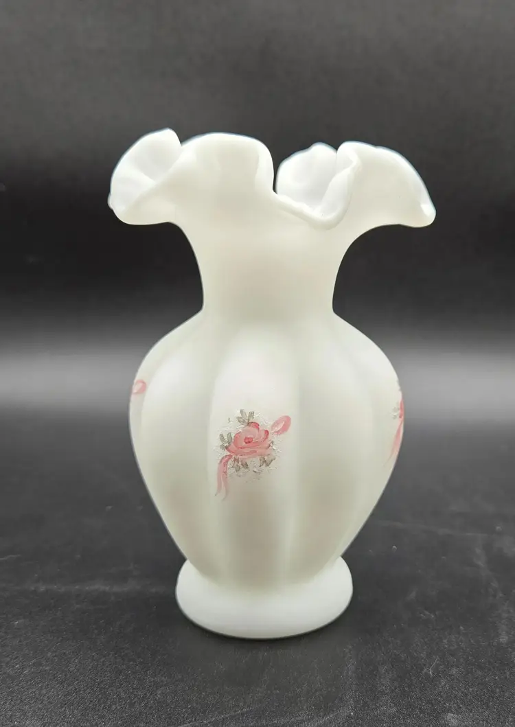 Fenton Satin Glass Handpainted Vase. Beautiful Painted Roses. Signed A. Farley. 5.5" × 4". Excellent Vintage condition. Please see photos as they are part of the description. Item will be well wrapped before shipping.