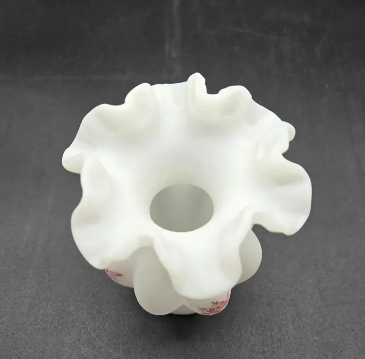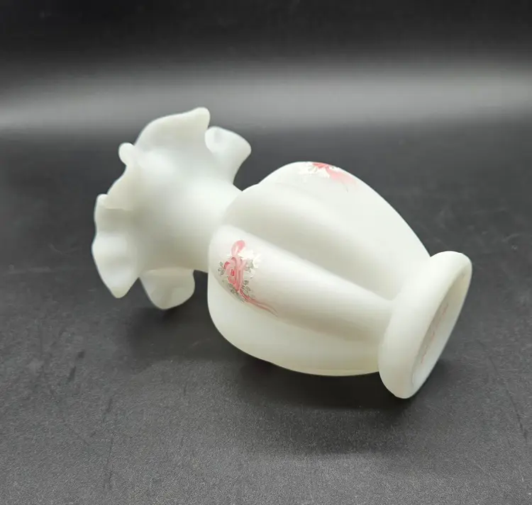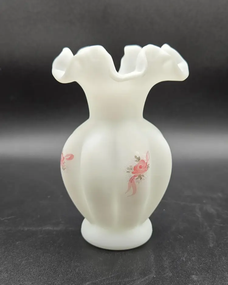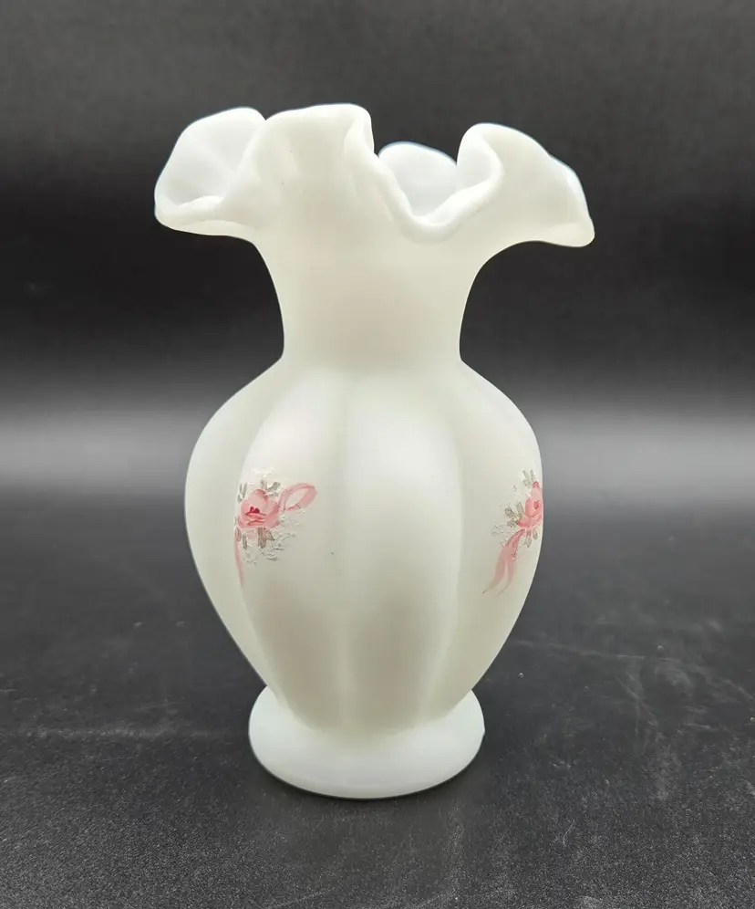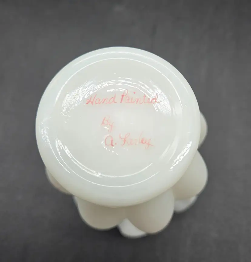 Fenton Satin Glass Handpainted Vase. Beautiful Painted Roses. Signed A. Farley. 5.5" × 4". Excellent Vintage condition. Please see photos as they are part of the description. Item will be well wrapped before shipping.