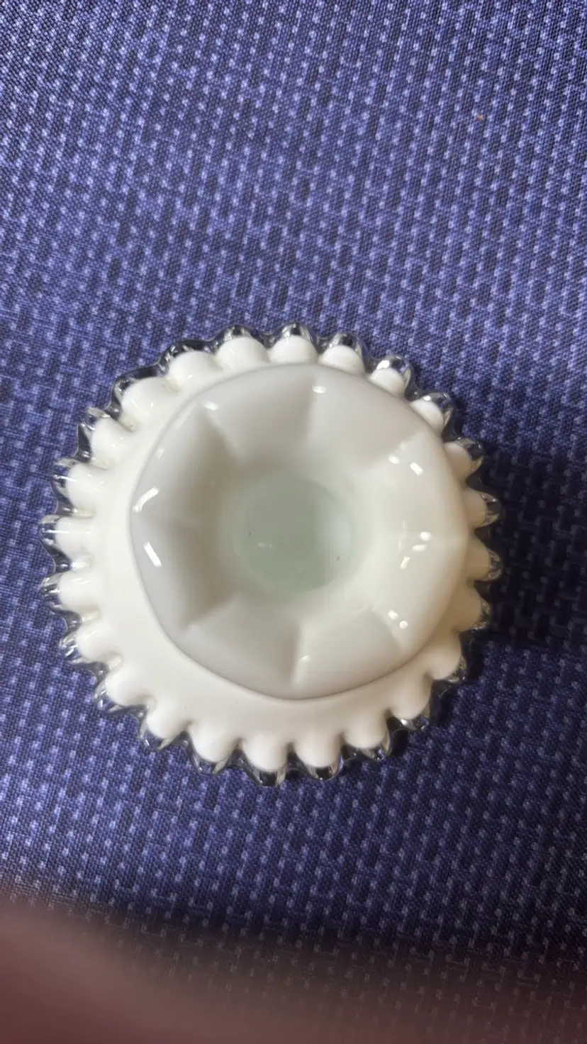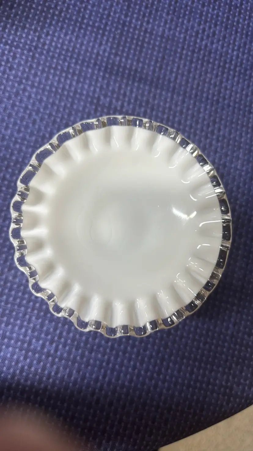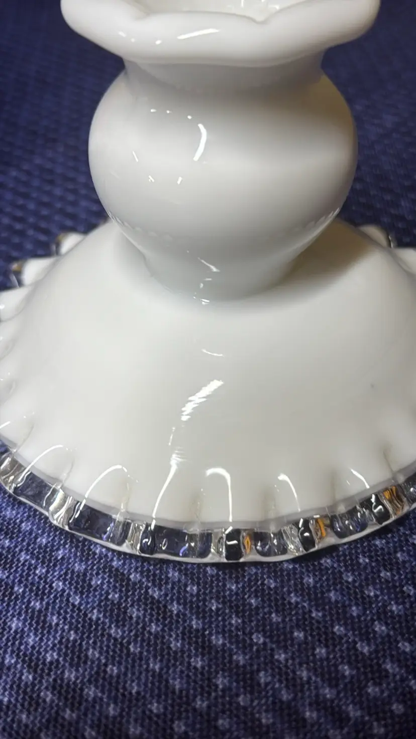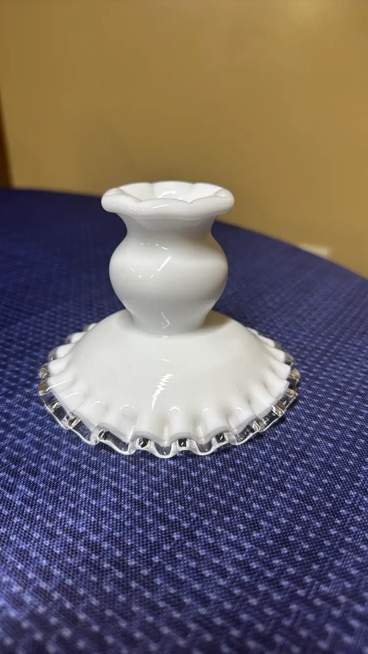 Fenton Silver Crest Candleholder Low Ruffeld # 7271 3.5” tall 4.5” diameter across the bottom 2” diameter on the top Beautiful candle holder in perfect condition with no breaks or chips (916821255w2121)