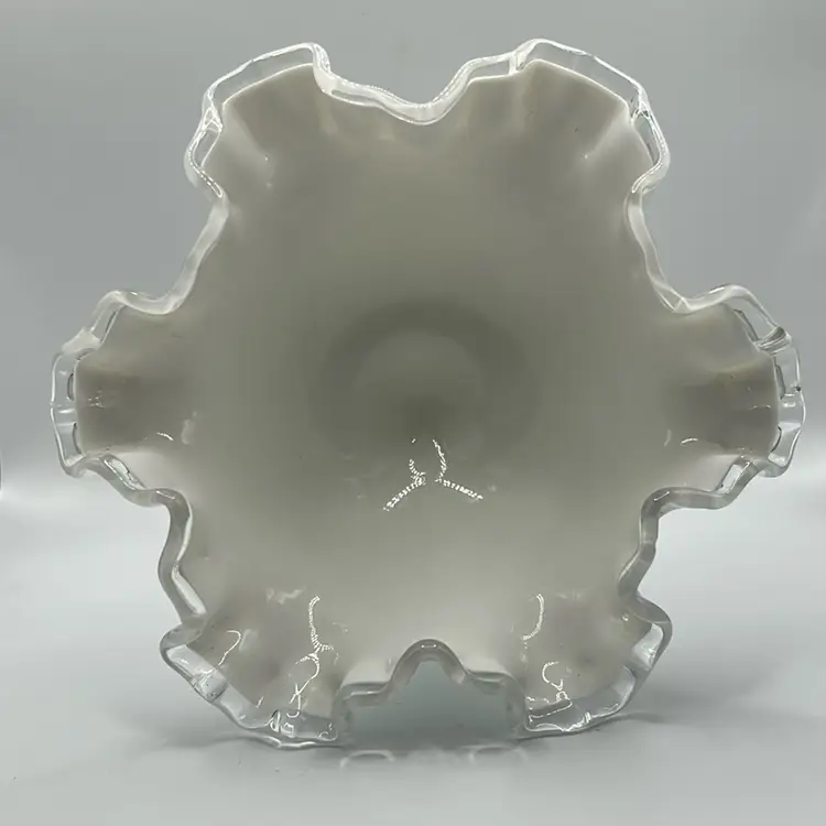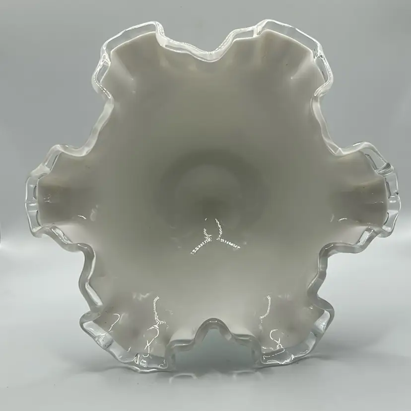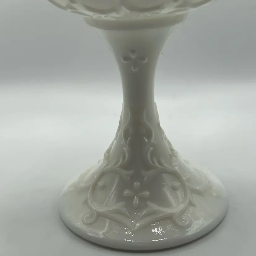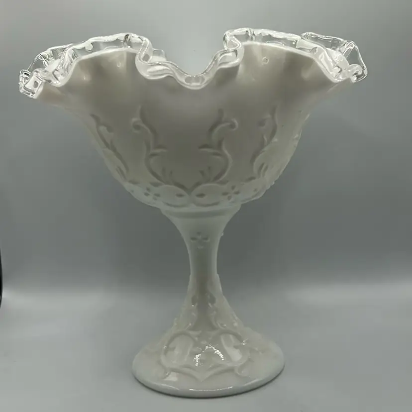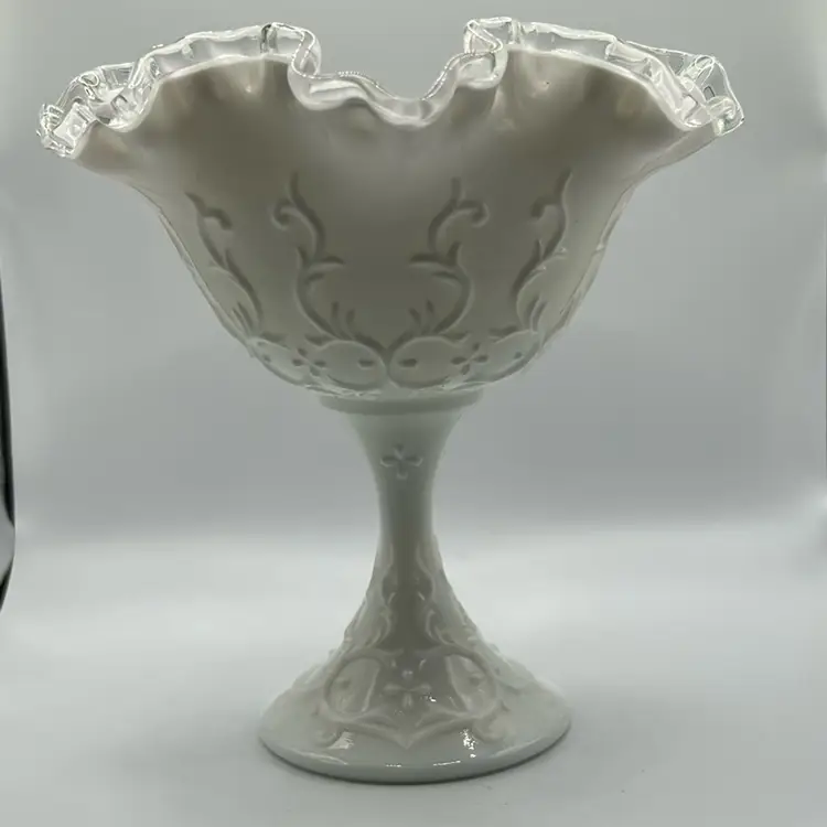 This is a Fenton, silver crest, white milk, glass pedestal dish. It is from the Spanish lace collection. It stands 7 inches tall 6 1/2 inches wide no condition issues.