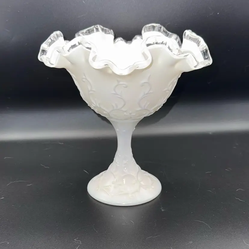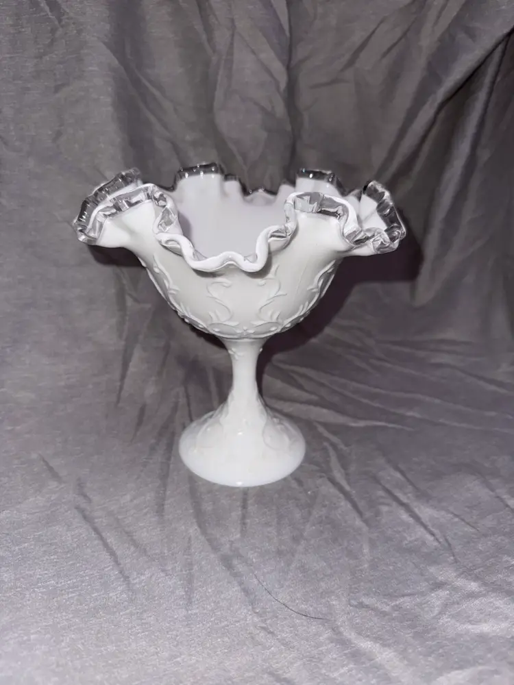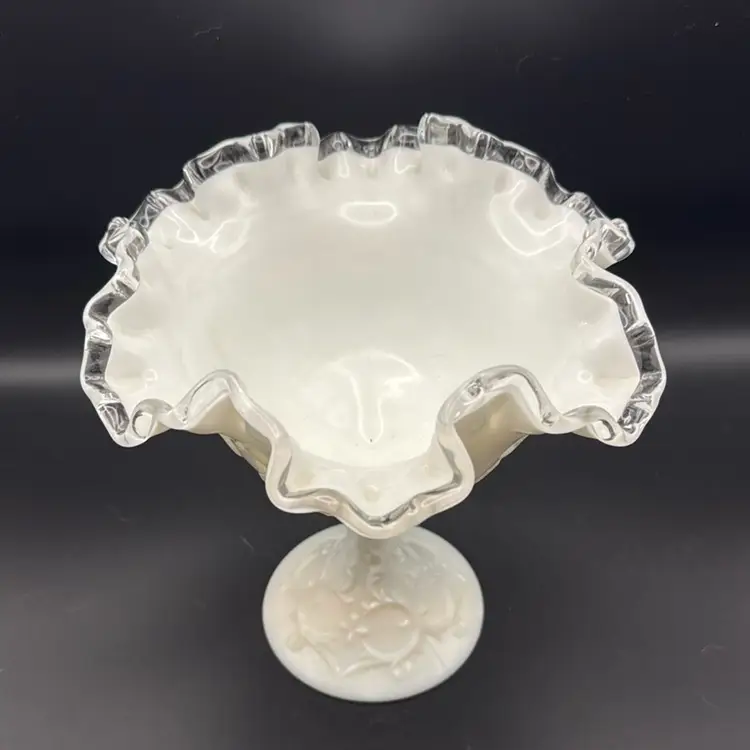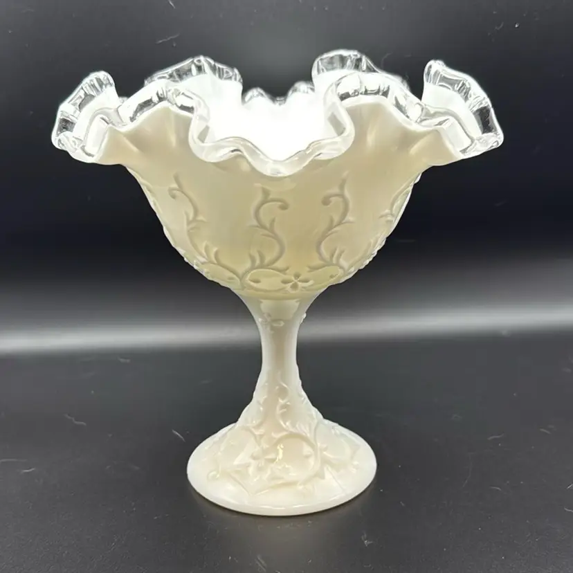 Gorgeous milky white with a clear ruffle. Lovely Spanish lace around the bowl and stem.