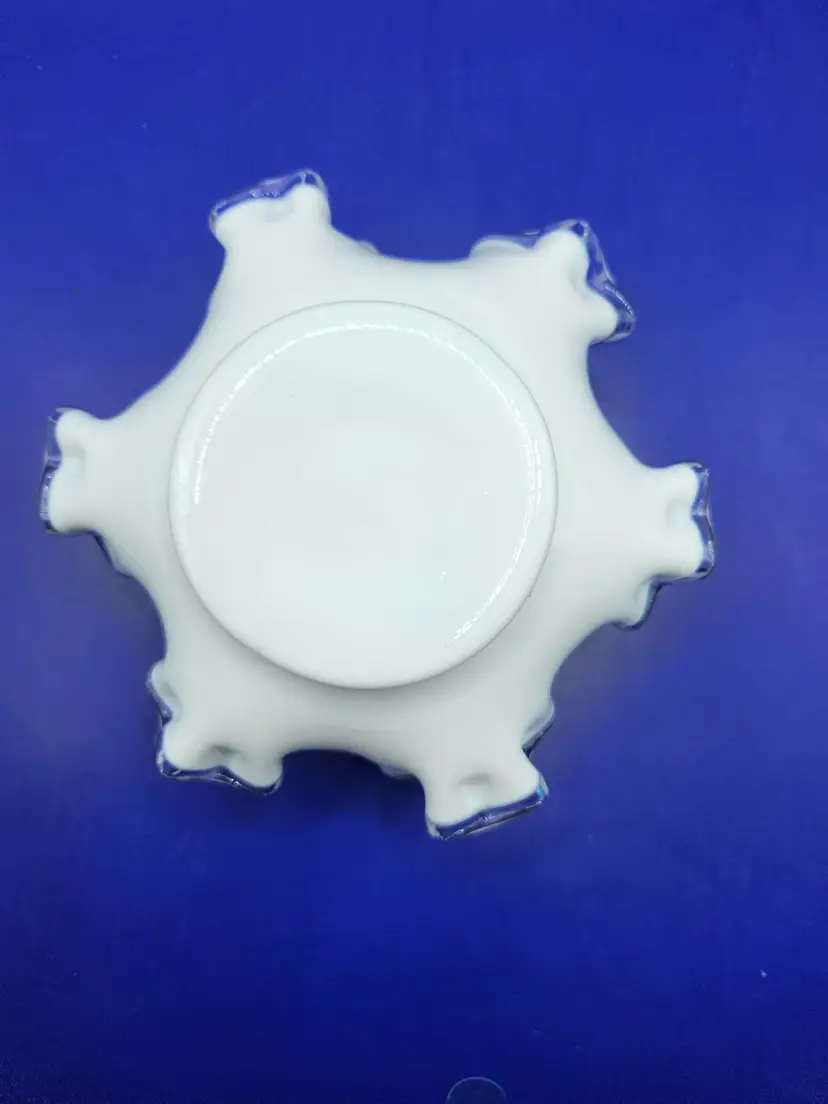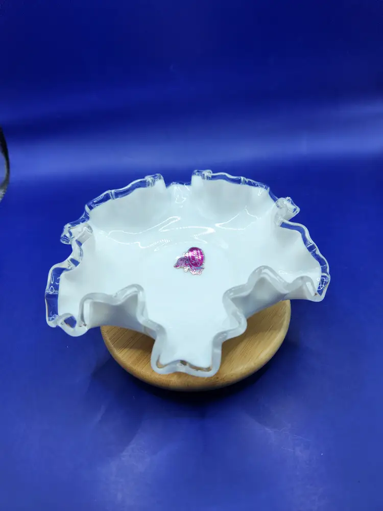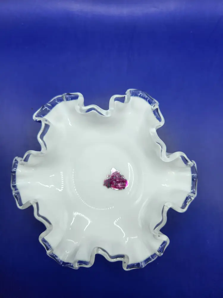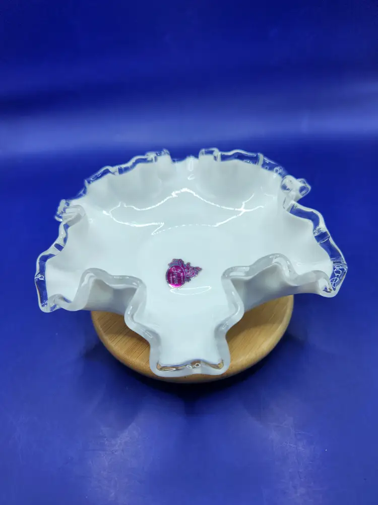 Fenton Silver Crest White Milk Glass Dish Ruffled Edge Measures 6 inches round Original sticker No chips or cracks