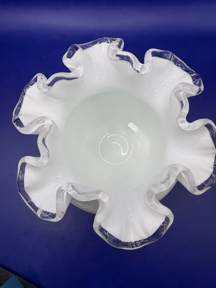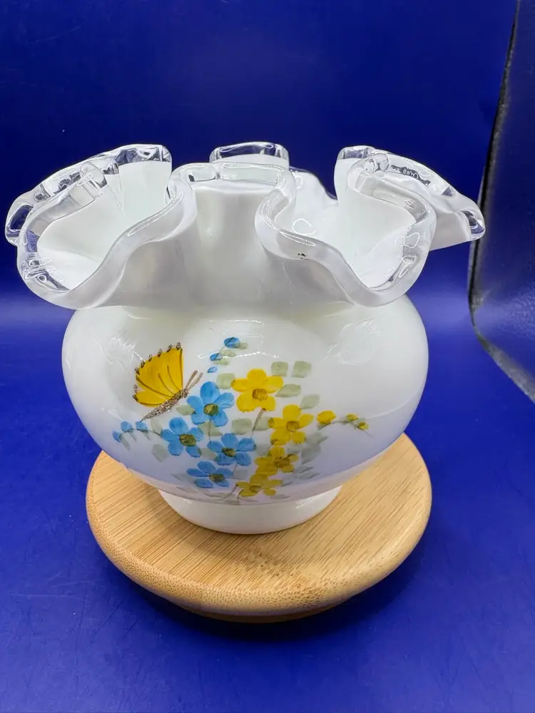 Fenton silver crest, ruffled edge rose bowl Hand painted design of butterflies and flowers Signed by B Nash Measures 4 1/2 inches wide by 3 1/2 inches tall In excellent condition