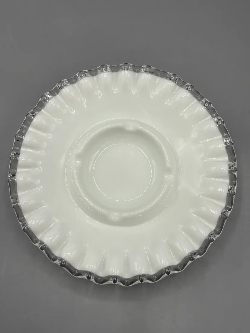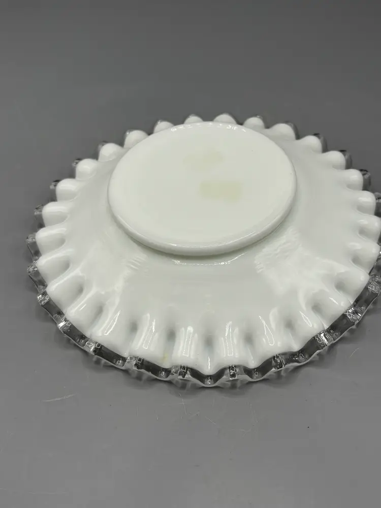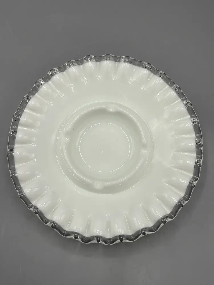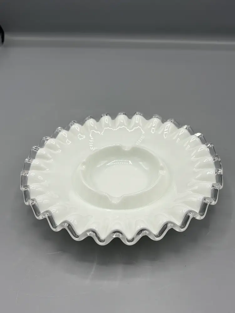 This elegant Fenton Silvercrest milk glass ashtray showcases the brand's signature hobnail pattern with a refined rim detail. Standing 1 1/8 inches tall and spanning 7 inches across, it's a compact yet striking piece ideal for collectors or vintage décor enthusiasts. The opaque white milk glass finish captures light beautifully, making it a versatile accent for any room. A timeless example of mid-century glassware craftsmanship.