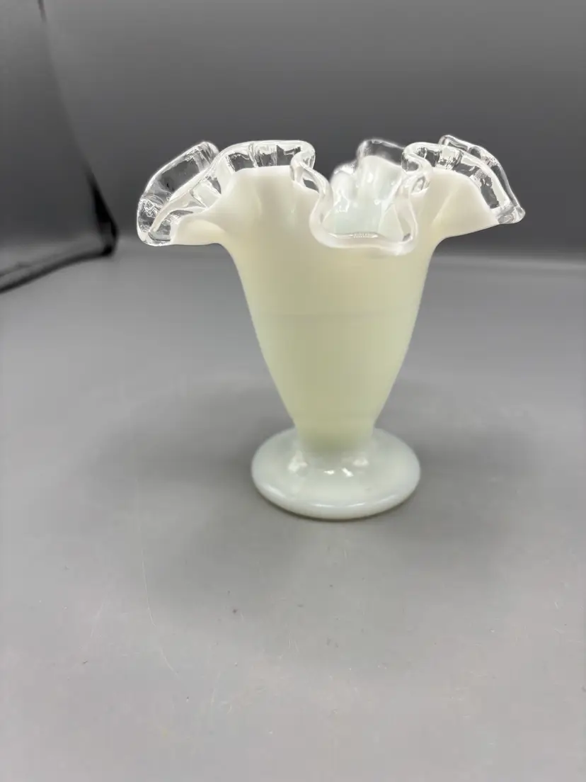 This elegant Fenton Silvercrest piece showcases iridescent opalescent glass crowned with a distinctive clear ruffled rim. Standing at 4 1/4 inches tall with a 4-inch diameter, this vintage-inspired vase captures the luminous quality Fenton is renowned for. The interplay of opalescent tones creates a mesmerizing visual effect, while the delicate ruffled edge adds refined sophistication. Perfect for displaying fresh flowers or as a standalone decorative accent.