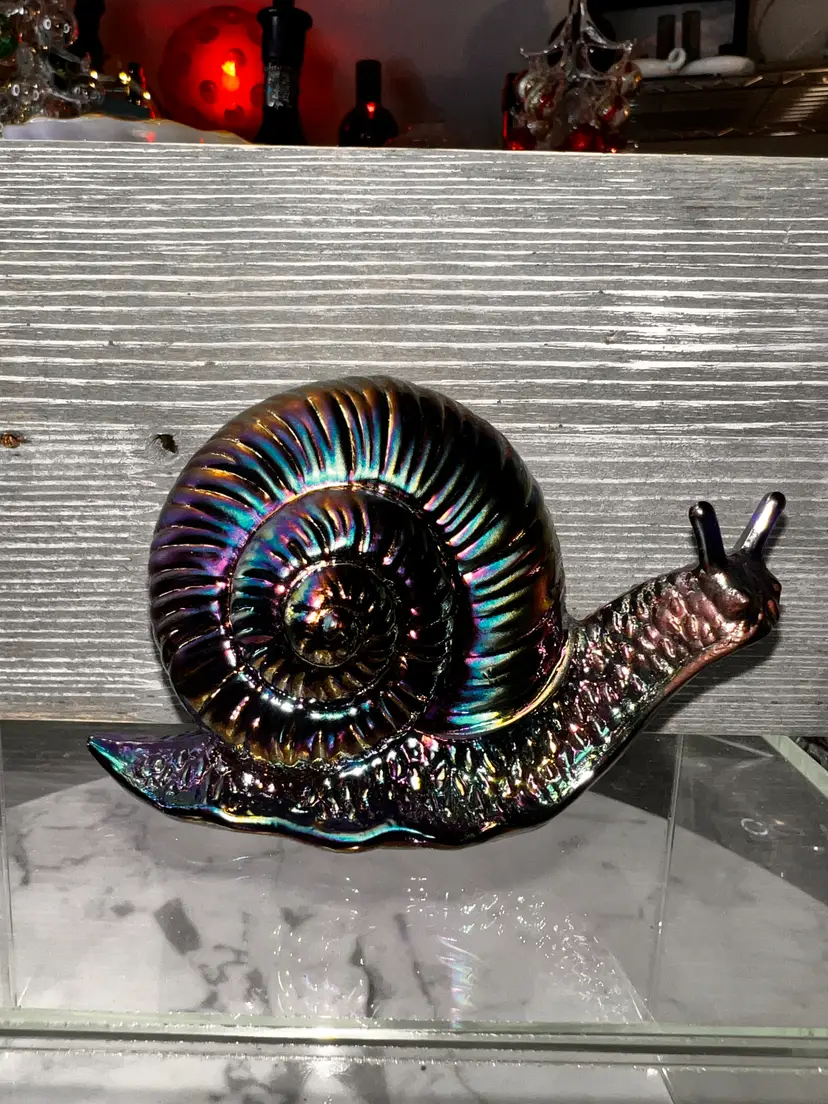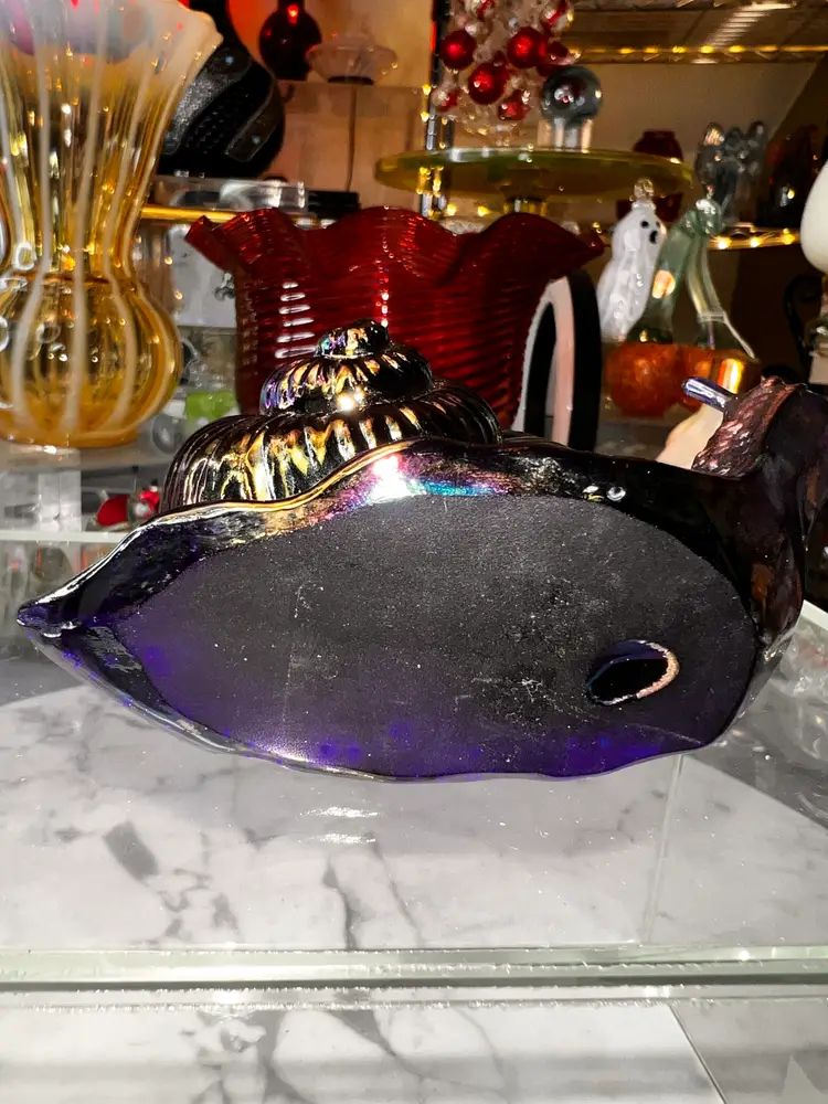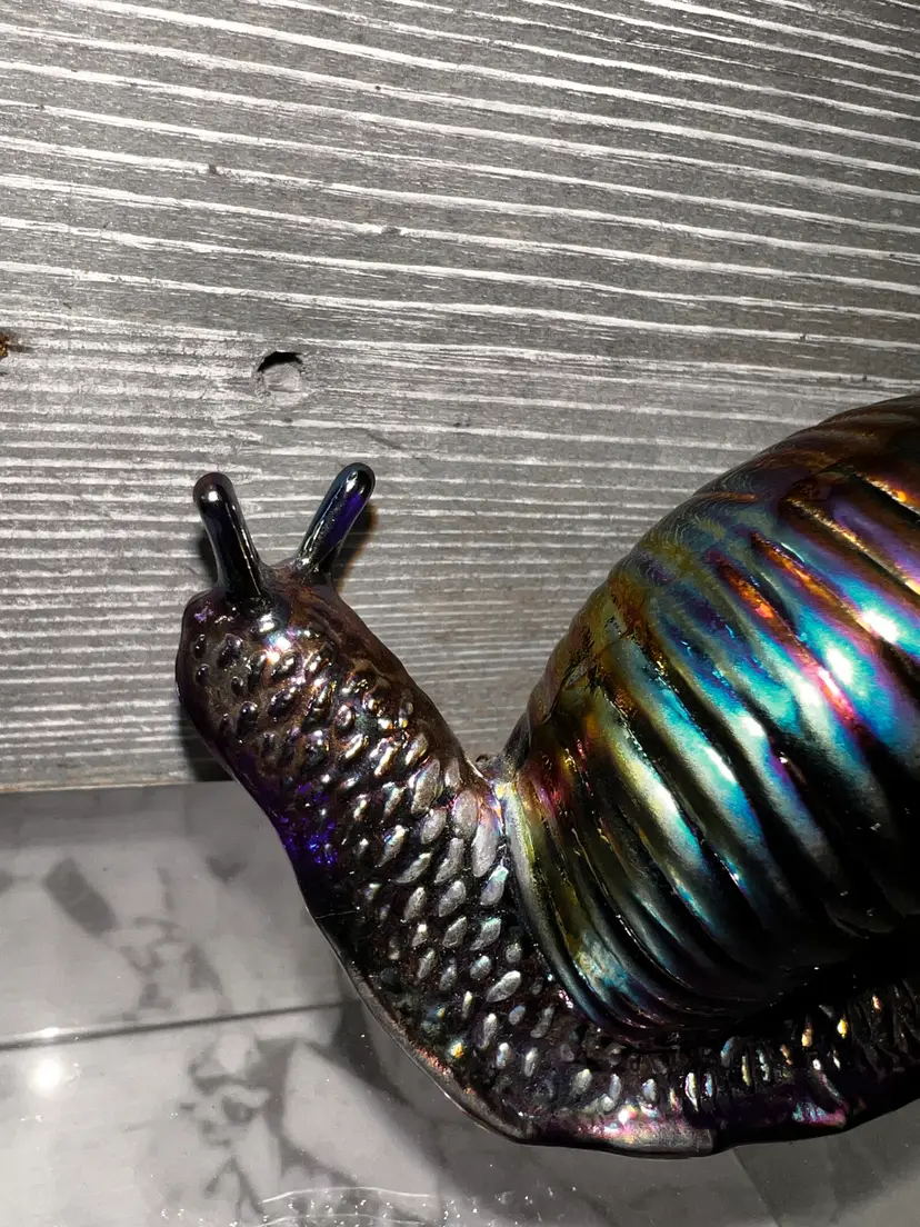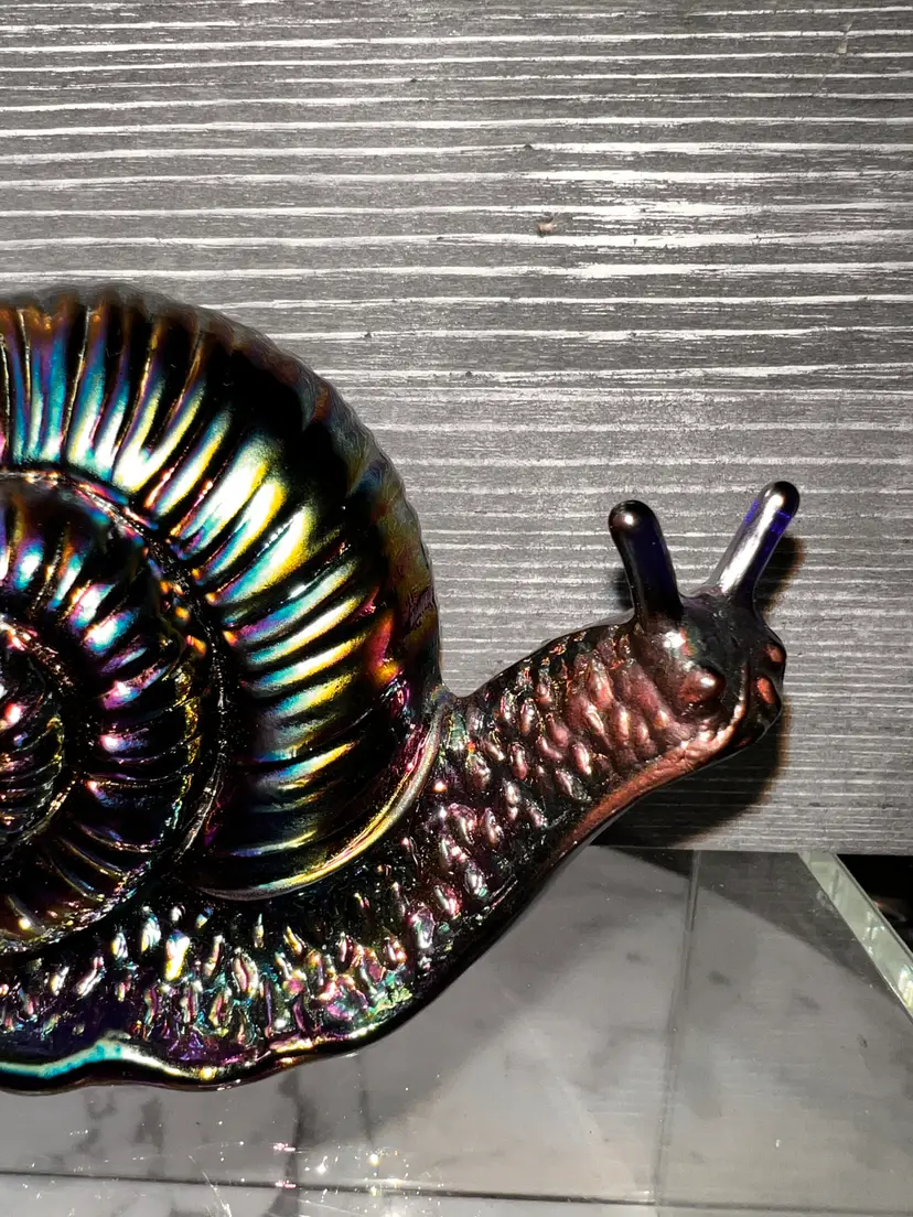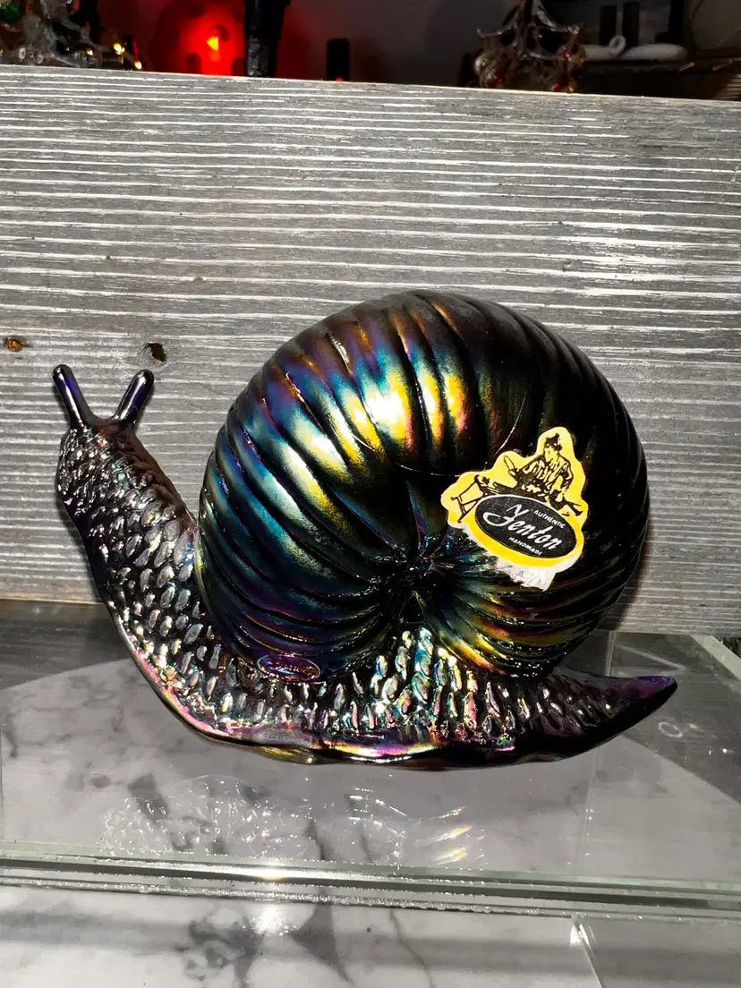 The Fenton Snail Figurine in purple iridescent amethyst is a vintage piece of art glass from the United States. This figurine features intricate craftsmanship and a unique design of a snail, making it a charming and decorative addition to any collection. Made of glass with a beautiful purple hue, this Fenton figurine embodies the elegance and charm of vintage decor.