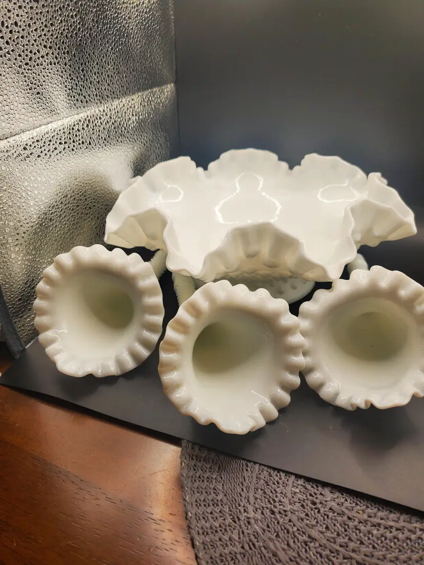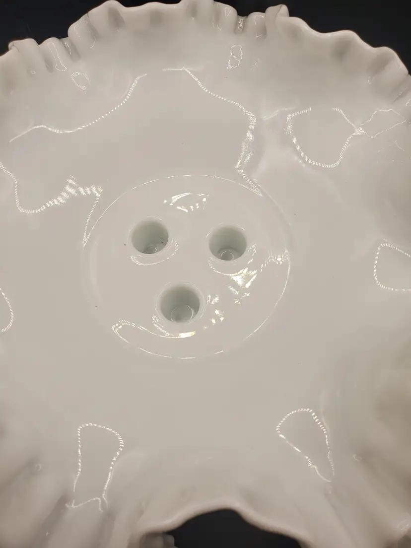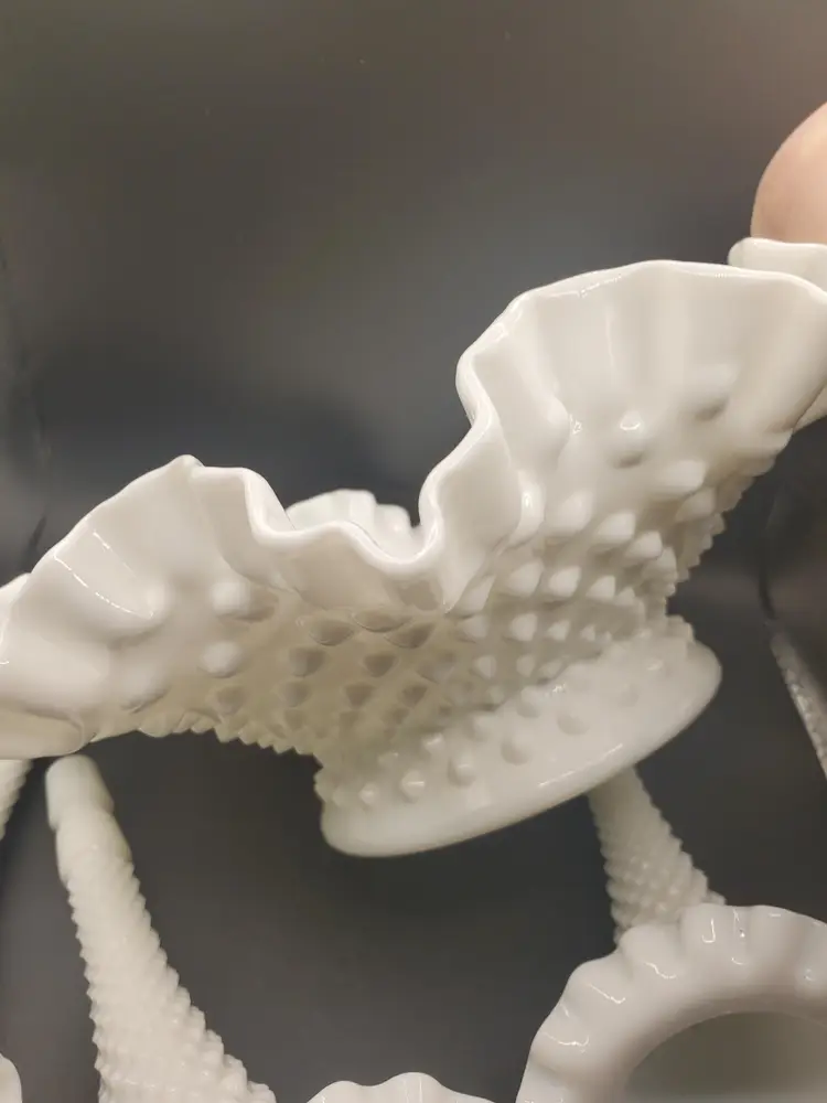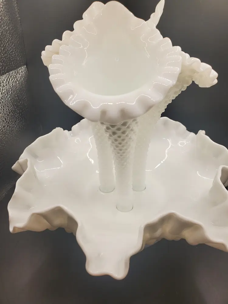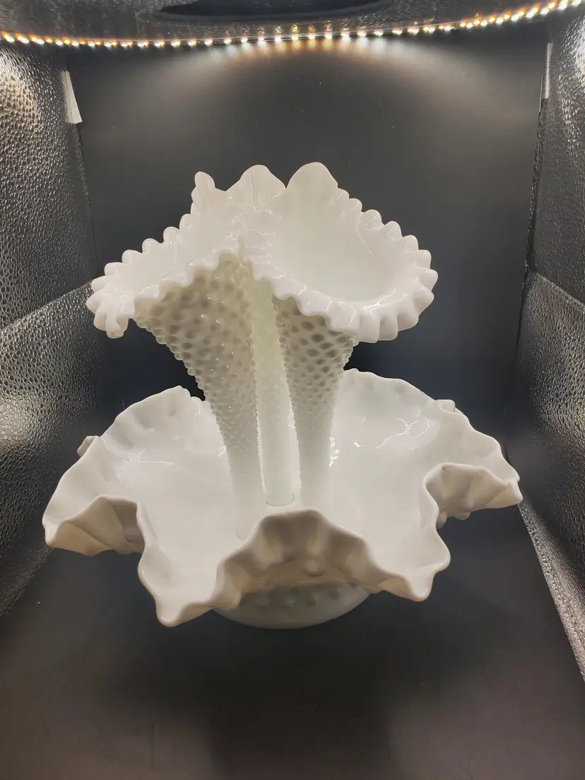 Nice hobnail milk glass epergne by Fenton. No chips or cracks. Three horns. Bowl is about 8" round.