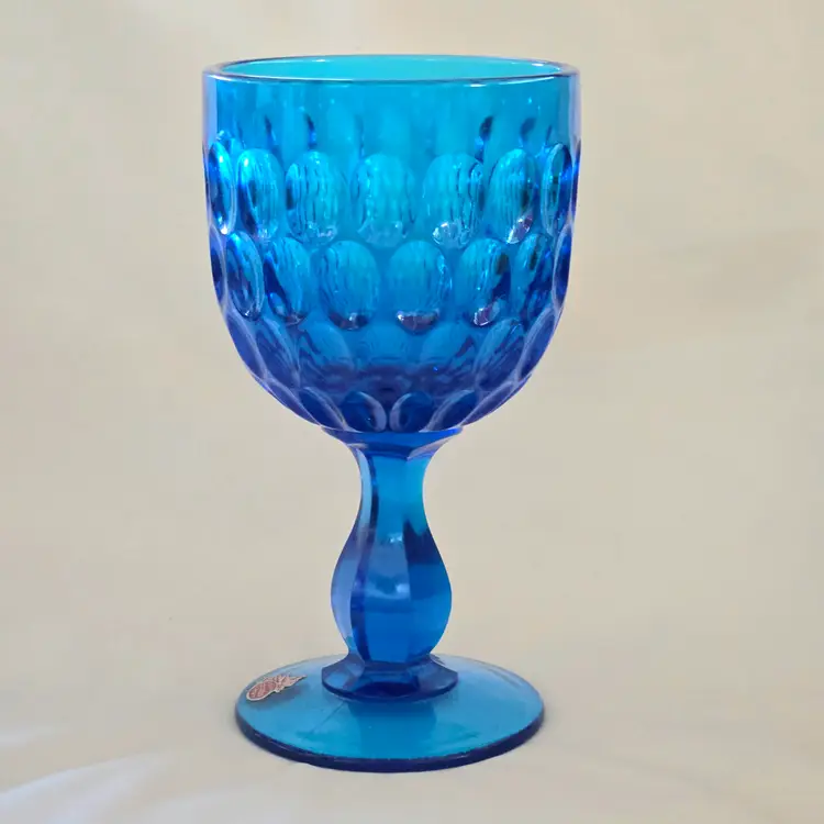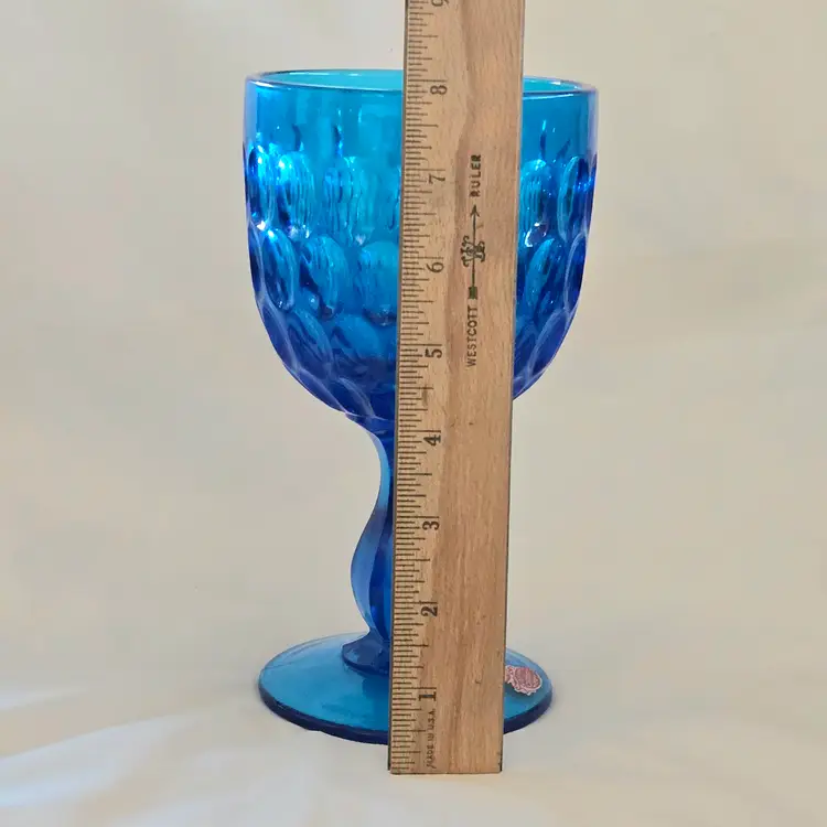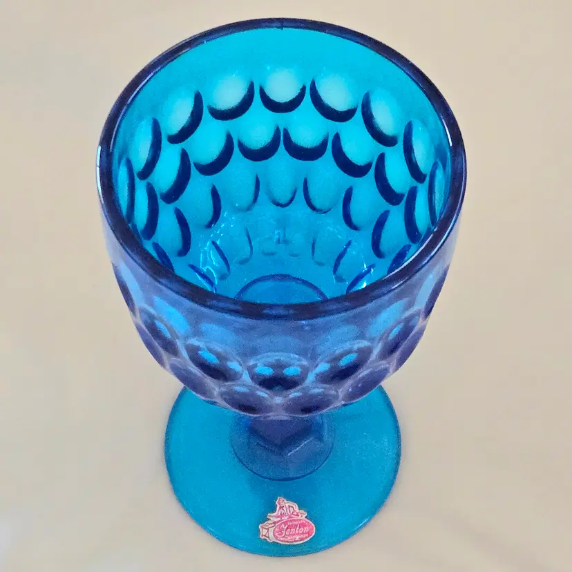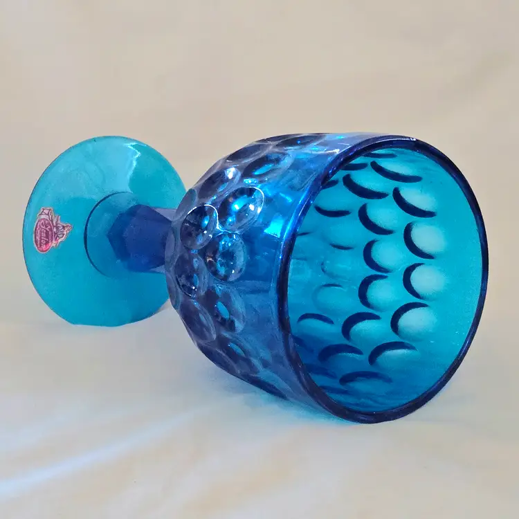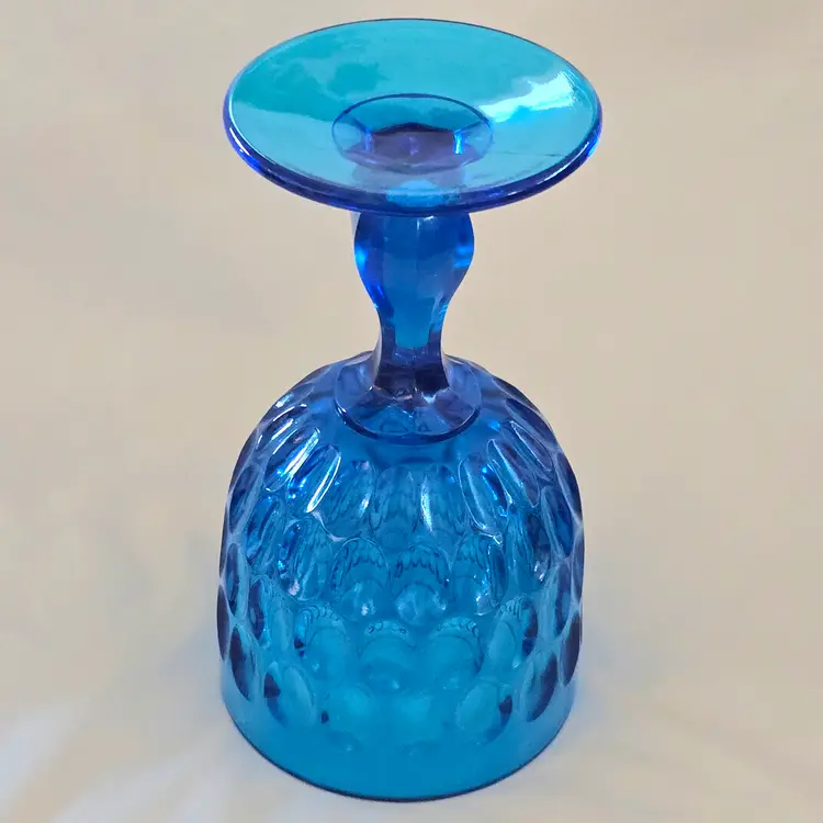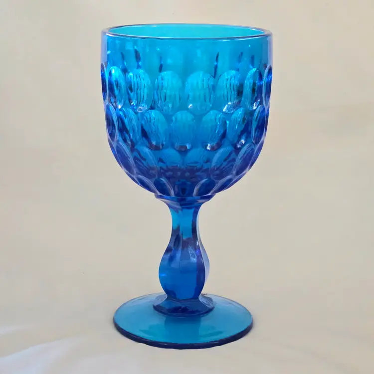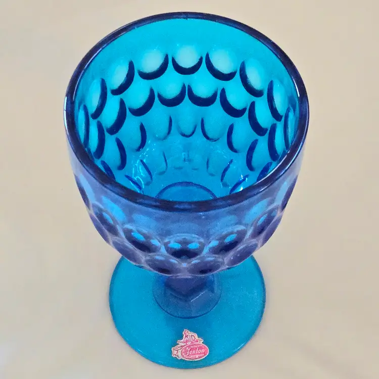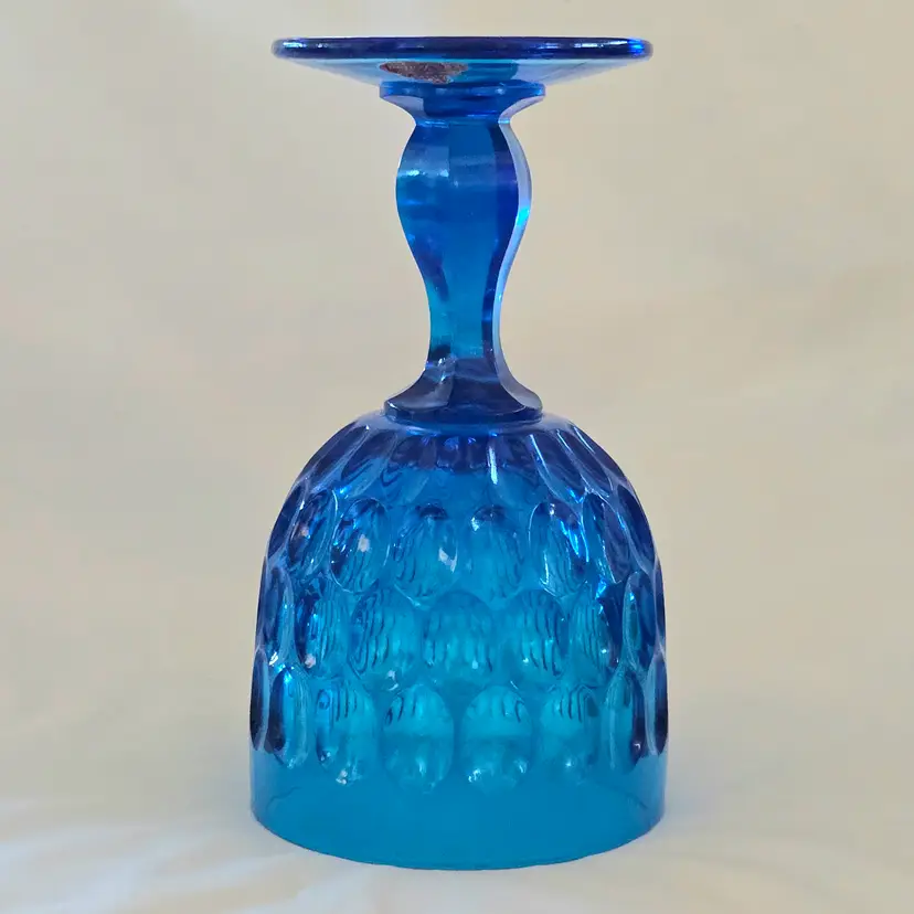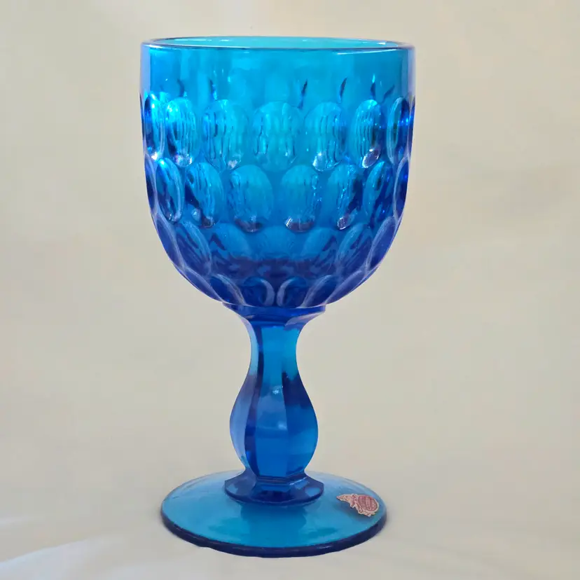 Vintage Fenton Thumbprint Chalice Colonial Blue Jumbo Goblet 8¼" tall w ith Original Foil Sticker holds 20 ounces approximately. Used condition with some dust, fingerprints from handling, thought I felt a very tiny fleabite but can Not now find it. Please view all the photos and please ask any questions prior to purchase when possible.