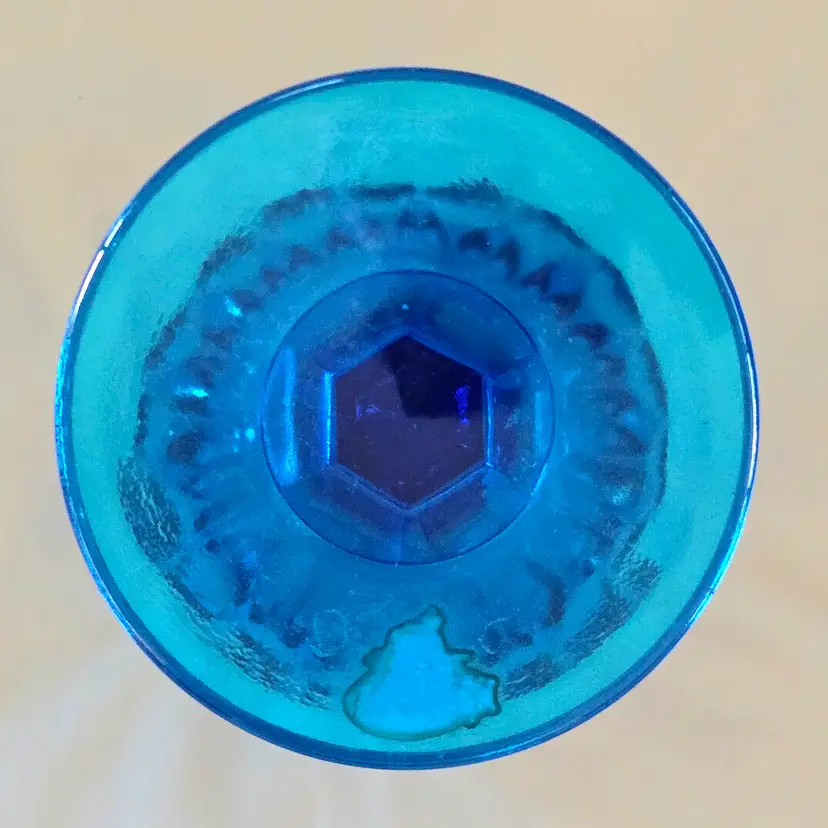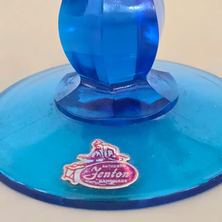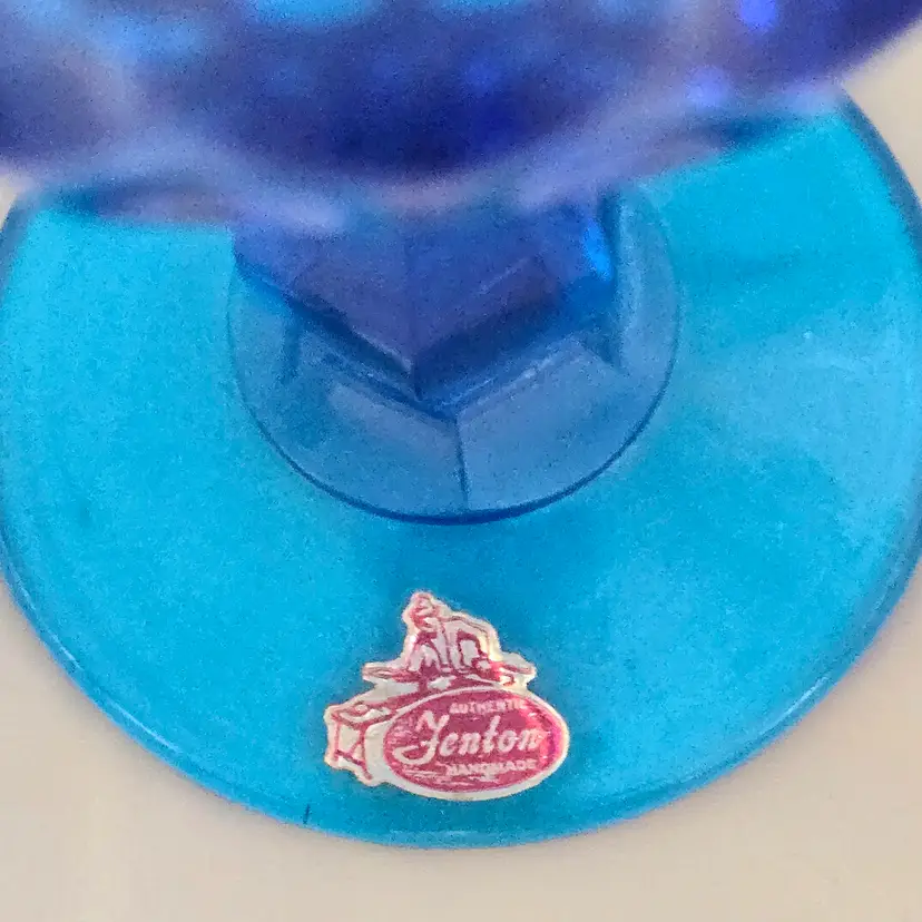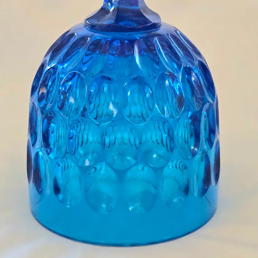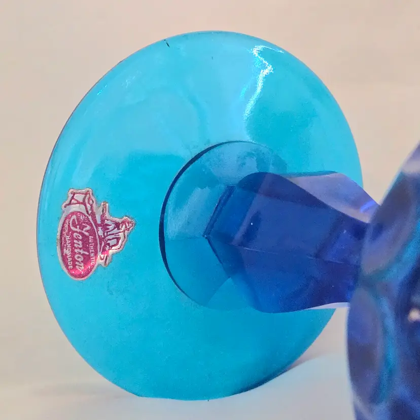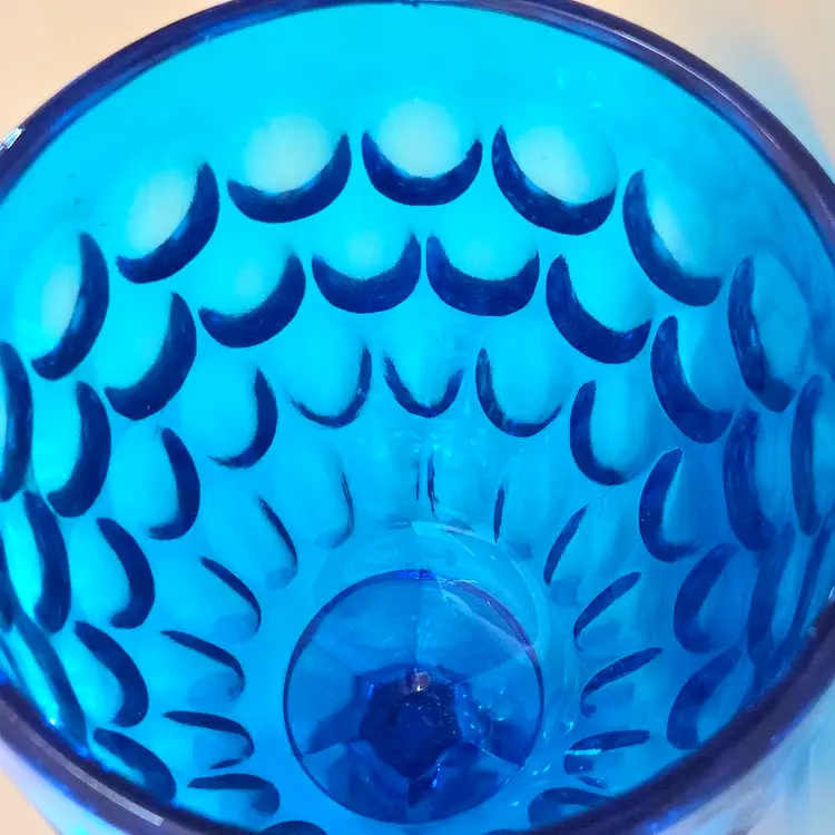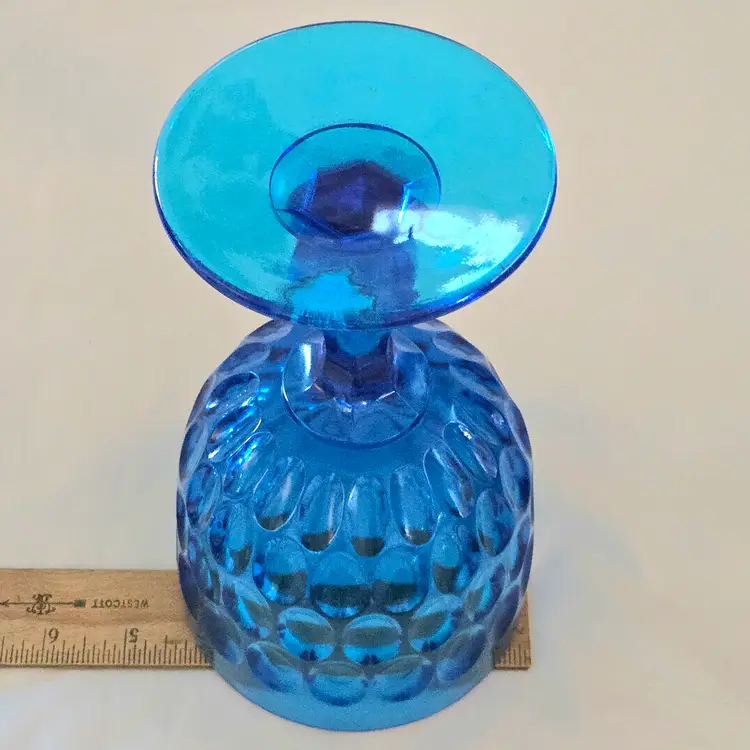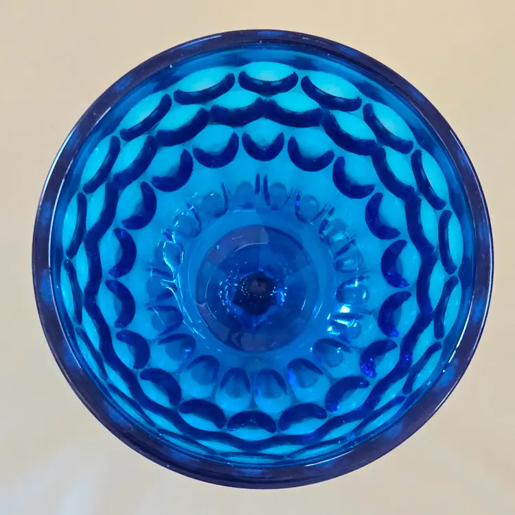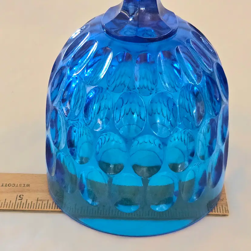 Vintage Fenton Thumbprint Chalice Colonial Blue Jumbo Goblet 8¼" tall w ith Original Foil Sticker holds 20 ounces approximately. Used condition with some dust, fingerprints from handling, thought I felt a very tiny fleabite but can Not now find it. Please view all the photos and please ask any questions prior to purchase when possible.
