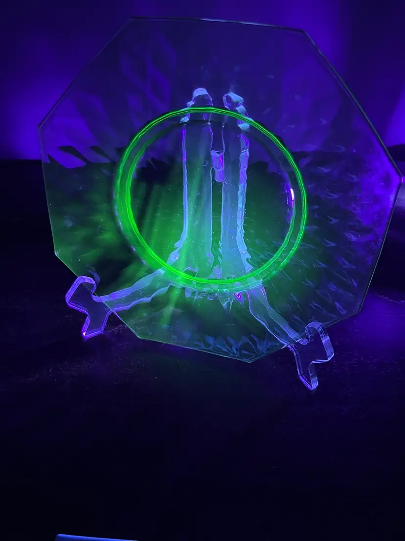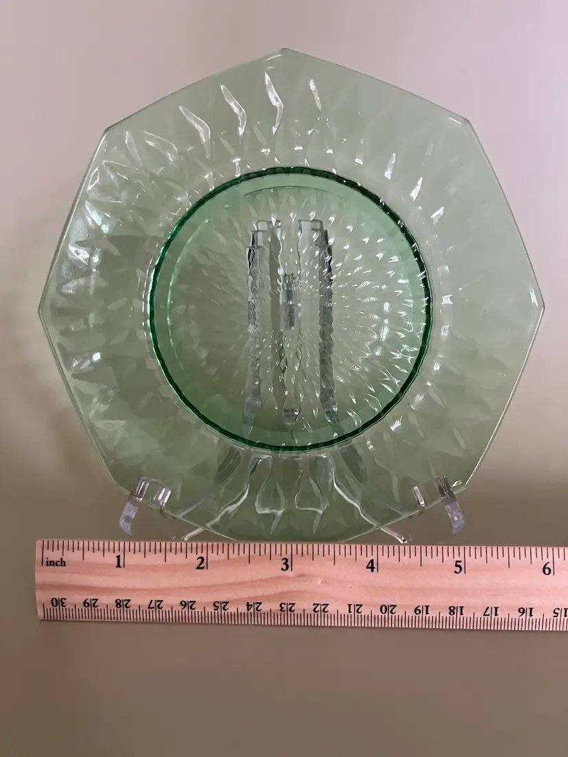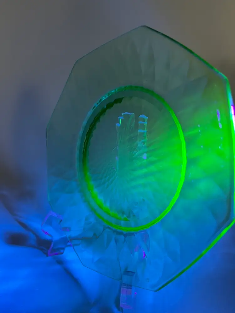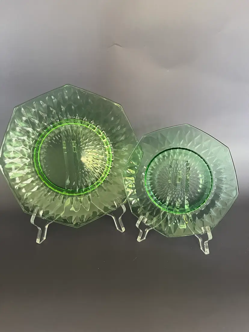 Elevate your dining experience with the vintage charm of Fenton Art Glass's Uranium Glass Diamond Optic salad plates. This two-piece set, originating from West Virginia in 1935, showcases the exquisite craftsmanship of the Depression Era. The octagonal shape and distinctive Diamond Optic pattern offer a unique touch to any table setting. Crafted from uranium glass, these plates produce a stunning green glow under UV light, adding a spectral twist to your mealtime. Measuring 8 inches and 6 inches in diameter, these plates blend functionality with elegance, perfect for all occasions.