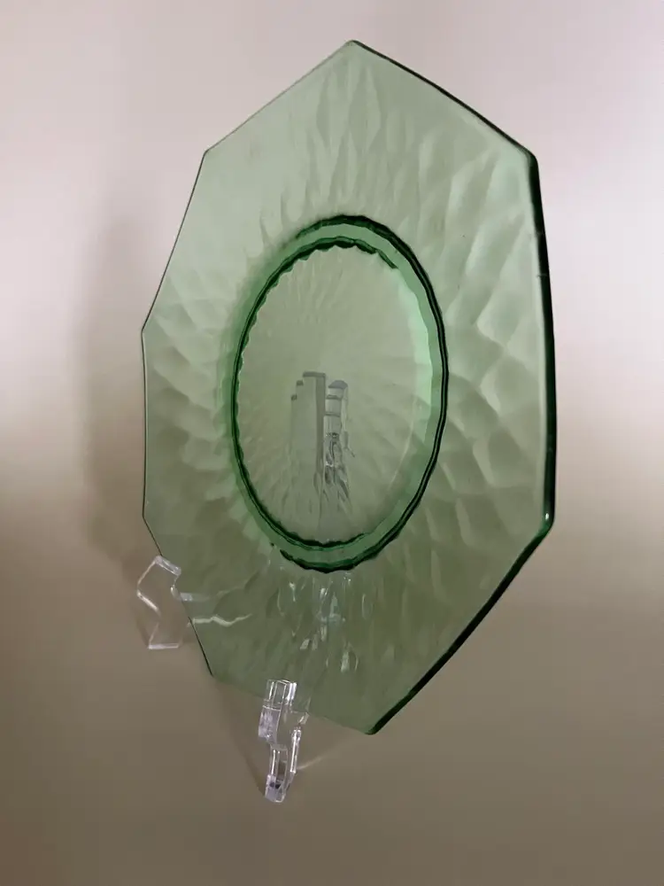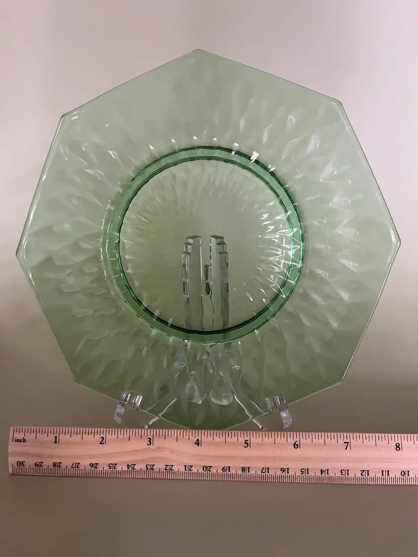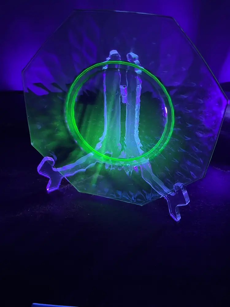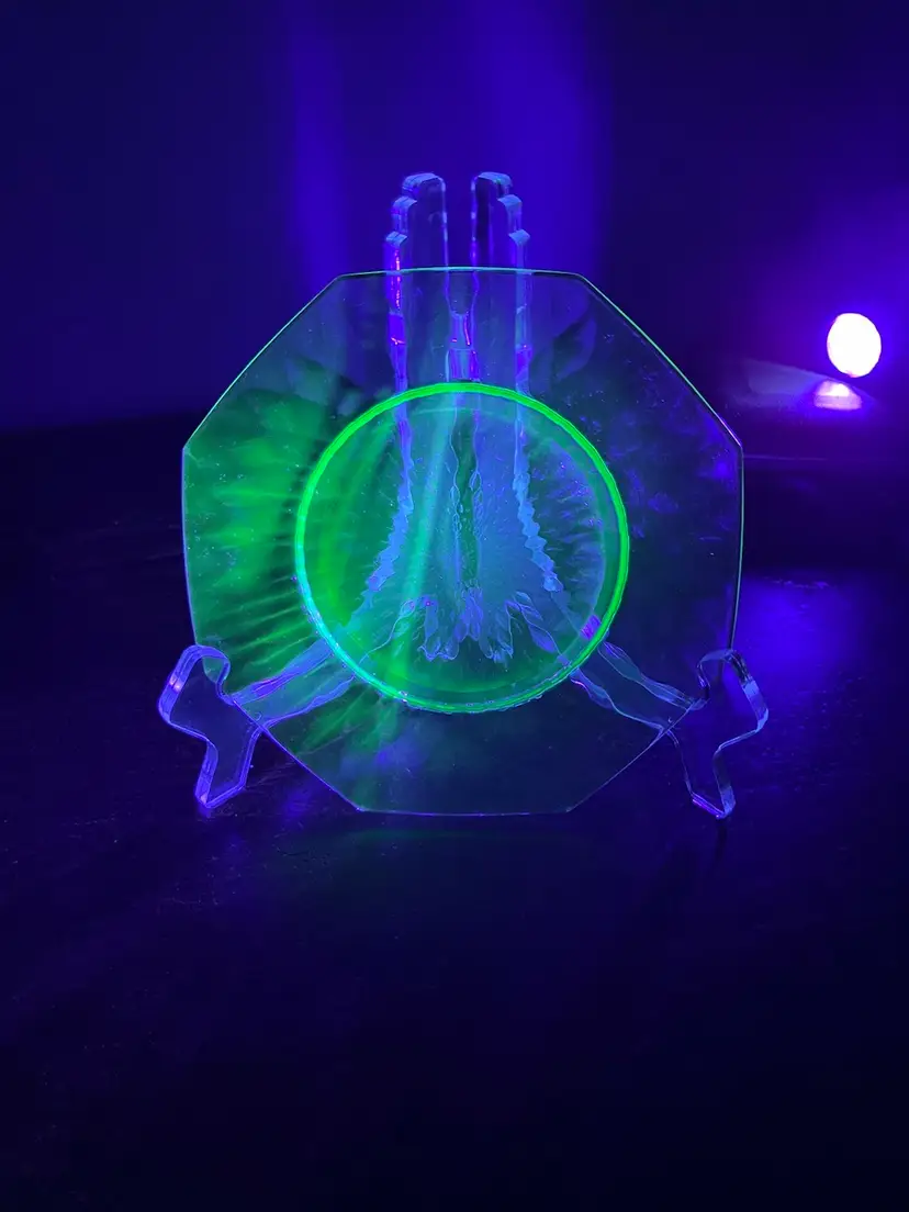 Elevate your dining experience with the vintage charm of Fenton Art Glass's Uranium Glass Diamond Optic salad plates. This two-piece set, originating from West Virginia in 1935, showcases the exquisite craftsmanship of the Depression Era. The octagonal shape and distinctive Diamond Optic pattern offer a unique touch to any table setting. Crafted from uranium glass, these plates produce a stunning green glow under UV light, adding a spectral twist to your mealtime. Measuring 8 inches and 6 inches in diameter, these plates blend functionality with elegance, perfect for all occasions.