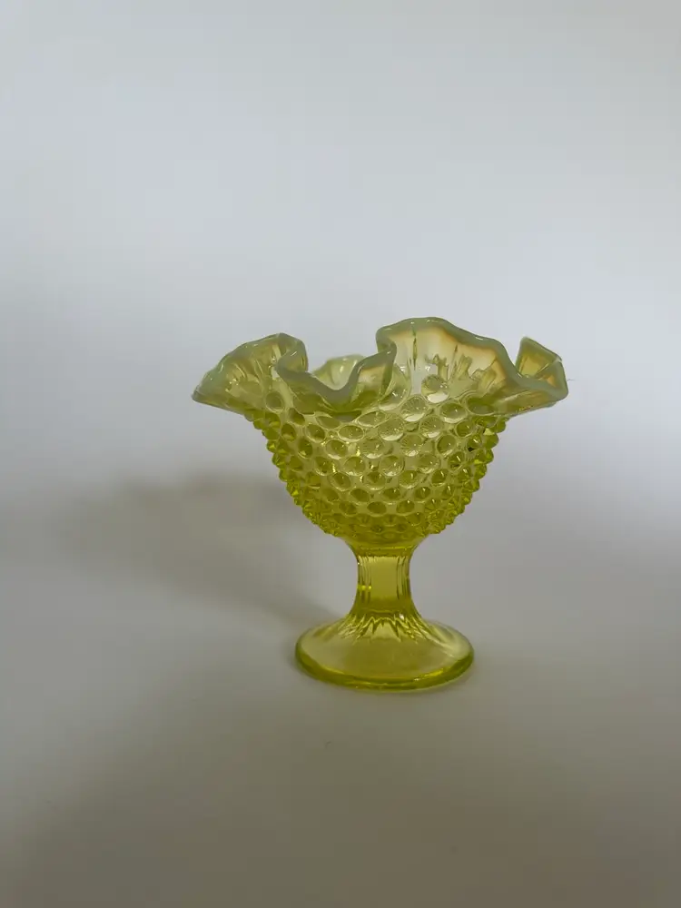 Fenton Vaseline Opalescent Candy Pedestal Ruffle Dish. It glows green!!!