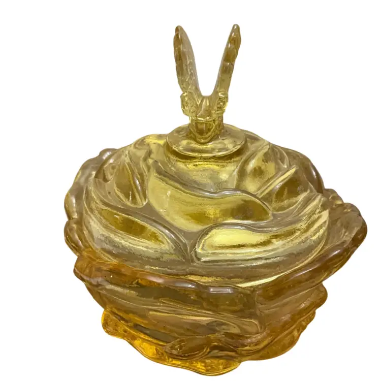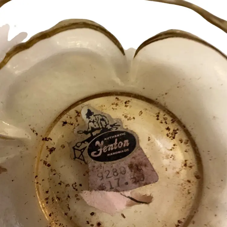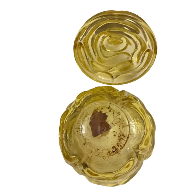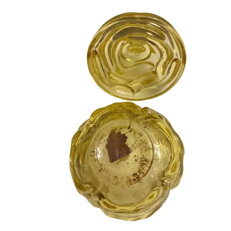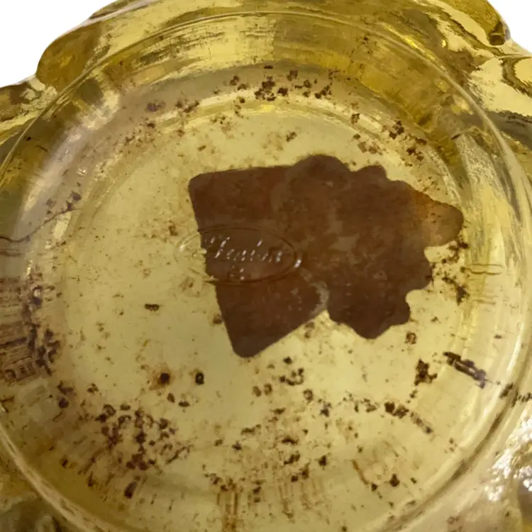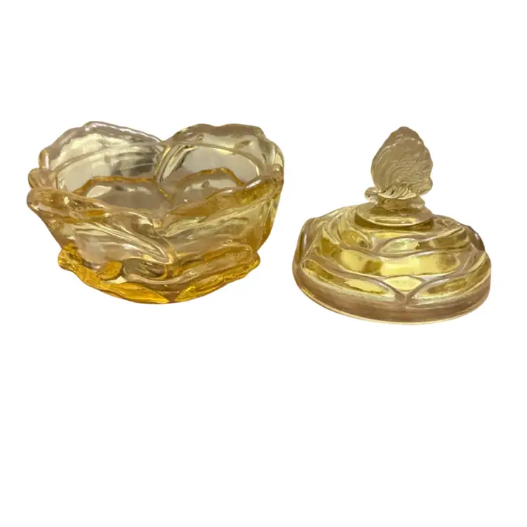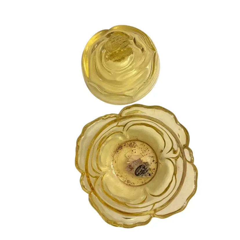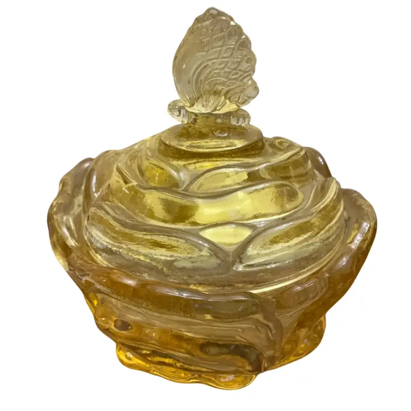 Beautiful yellow colored glass in the cabbage rose pattern and butterfly finial lid. This piece has the original sticker and store sticker still in piece. It also has the Fenton stamped logo with the number 8 depicting the decade of 1980’s in which it was manufactured. The base dish needs a good wash. I did not clean it as I did not want to disturb the stickers.