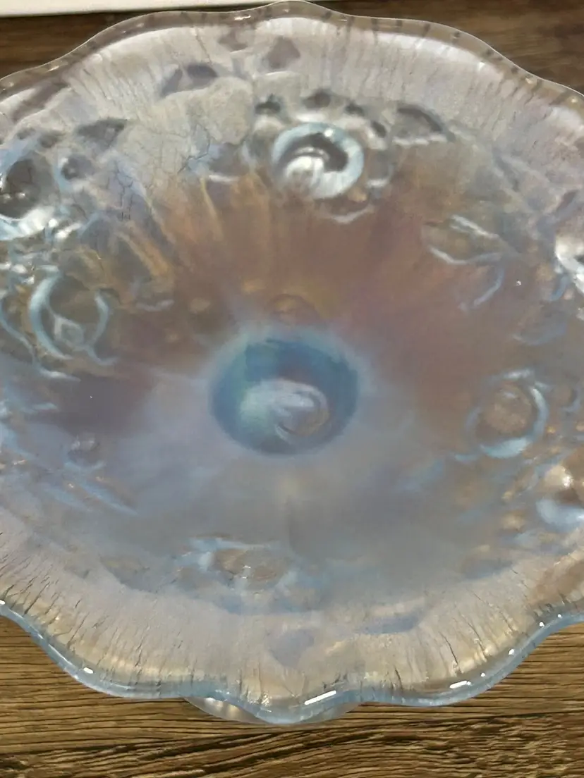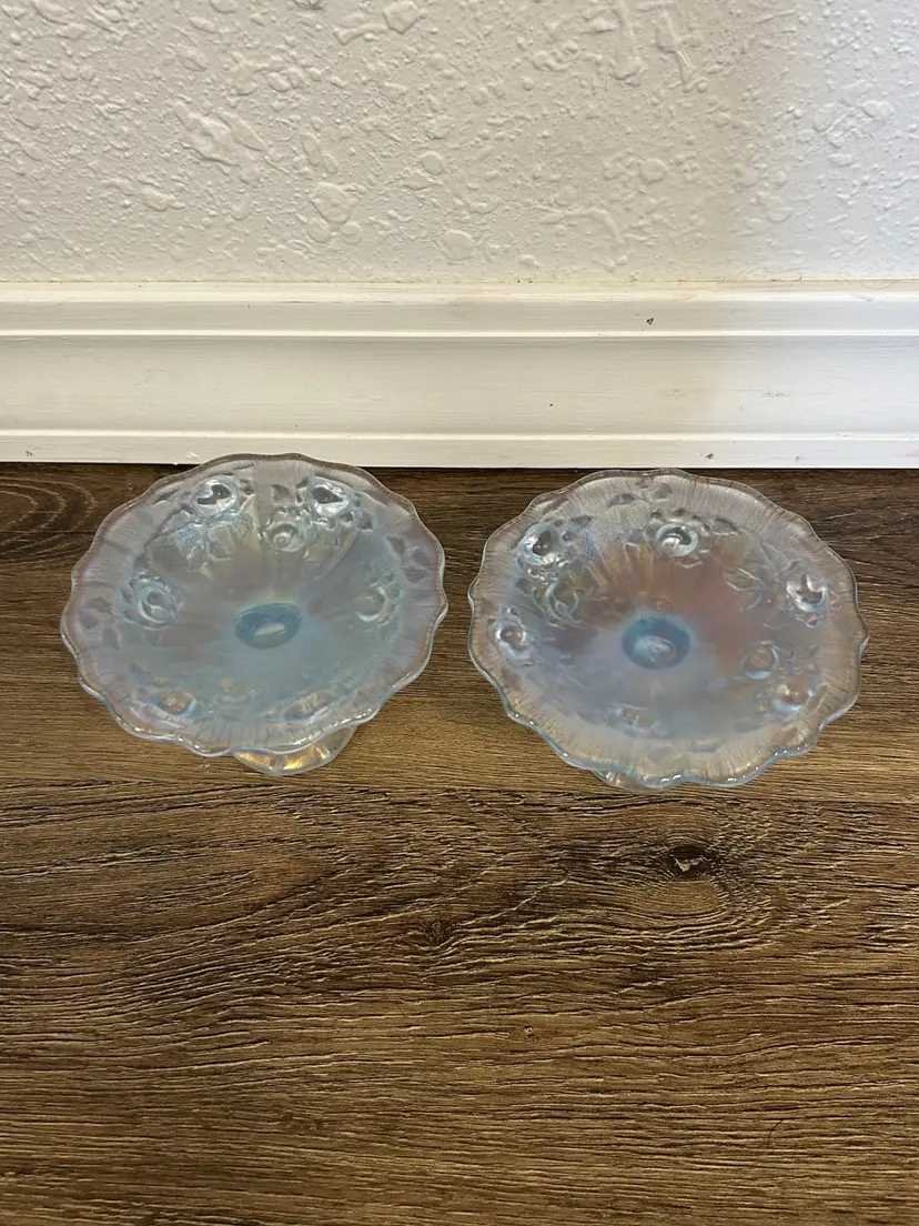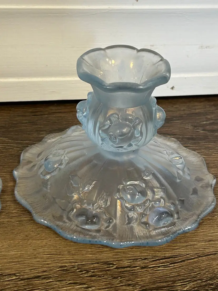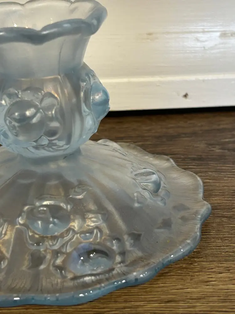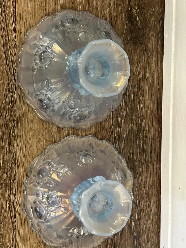Fenton Vintage Irridesent Powder Dusty Blue Roses Candlestick Holders Set of 2