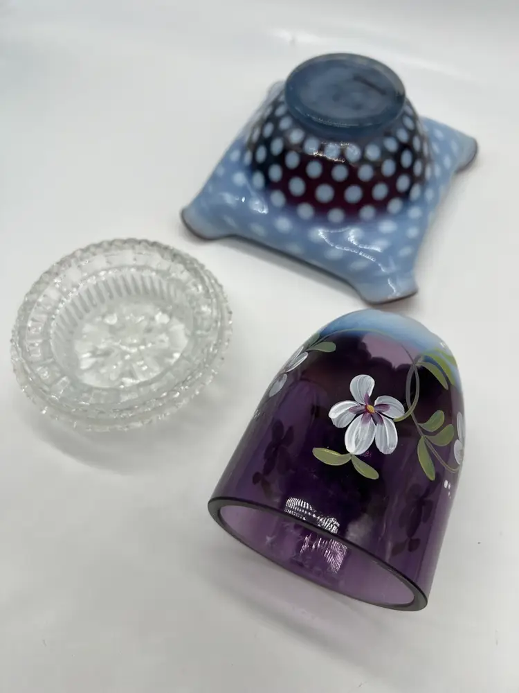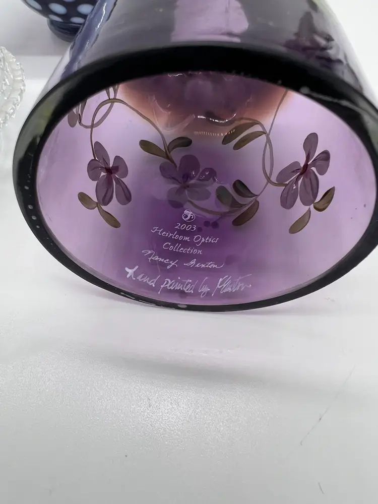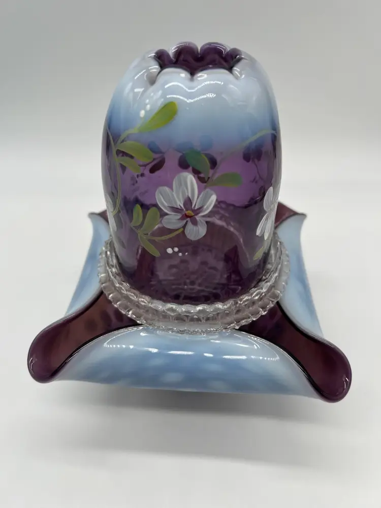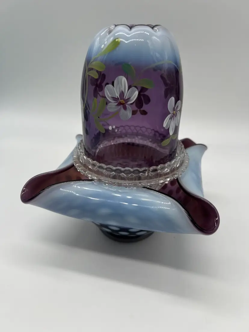 This beautiful Fenton Vintage Fairy Lamp, crafted in 2003, features a stunning plum opalescent color that adds a touch of elegance to any setting. The lamp is designed as a three-piece set, showcasing a draped pattern complemented by charming coin dot detailing. The soft glow emitted when lit creates a warm and inviting atmosphere, making it the perfect accent piece for your home. Whether displayed on a shelf, mantel, or table, this collectible fairy lamp is not only functional but also a work of art that embodies the quality and craftsmanship synonymous with Fenton glassware. Ideal for collectors and those who appreciate vintage decor, this piece is a lovely addition to any glass collection.