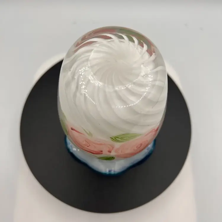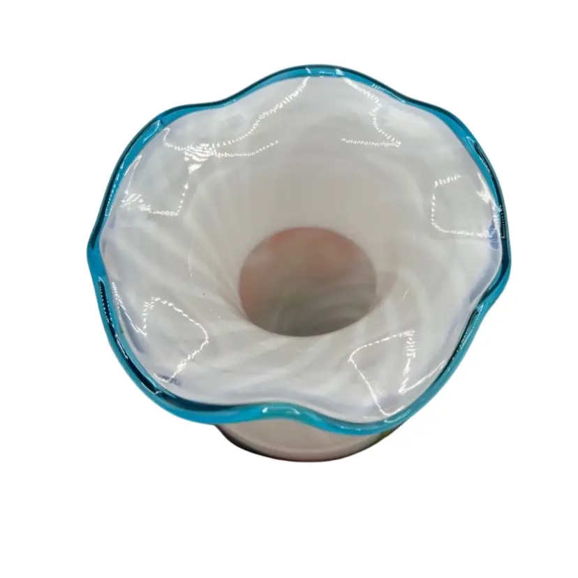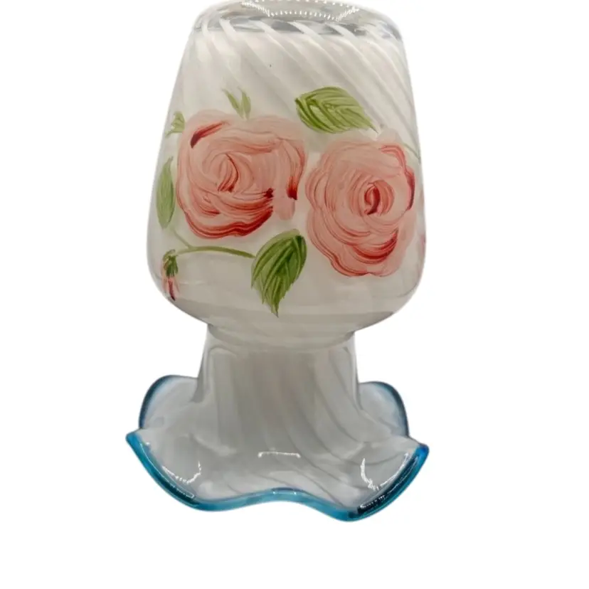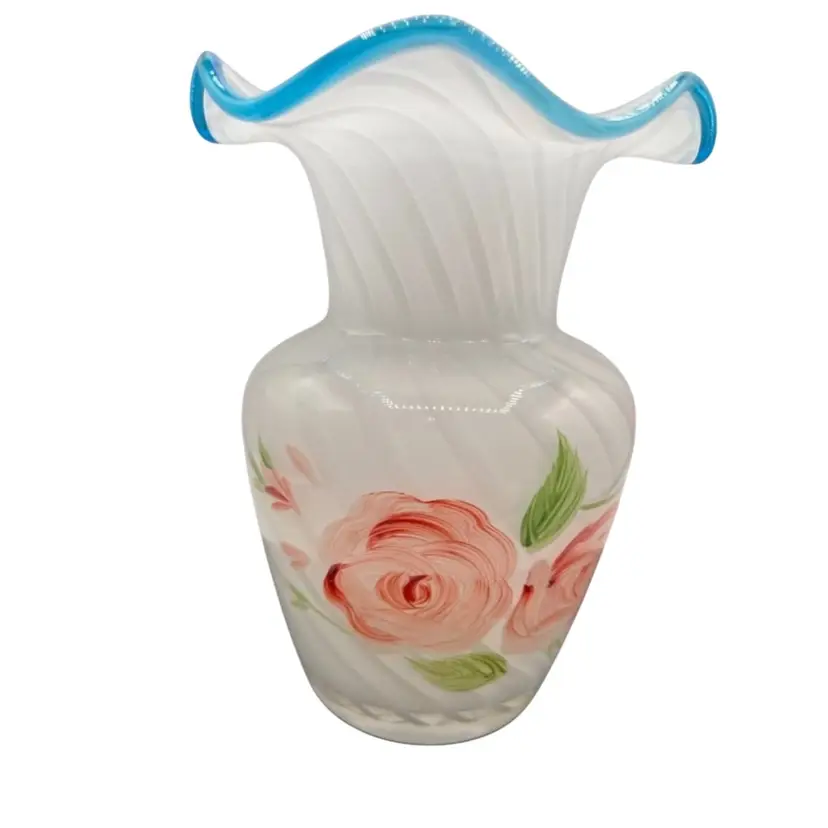 VTG OPALESCENT SWIRL VASE BLUE CREST RUFFLE RIM, VICTORIAN STYLE AND ART GLASS WITH BEAUTIFUL HAND PAINTED ROSES.