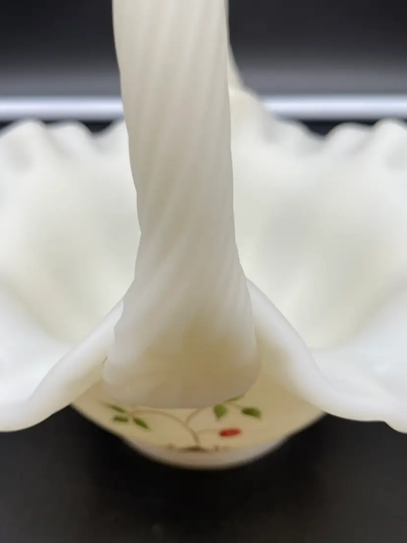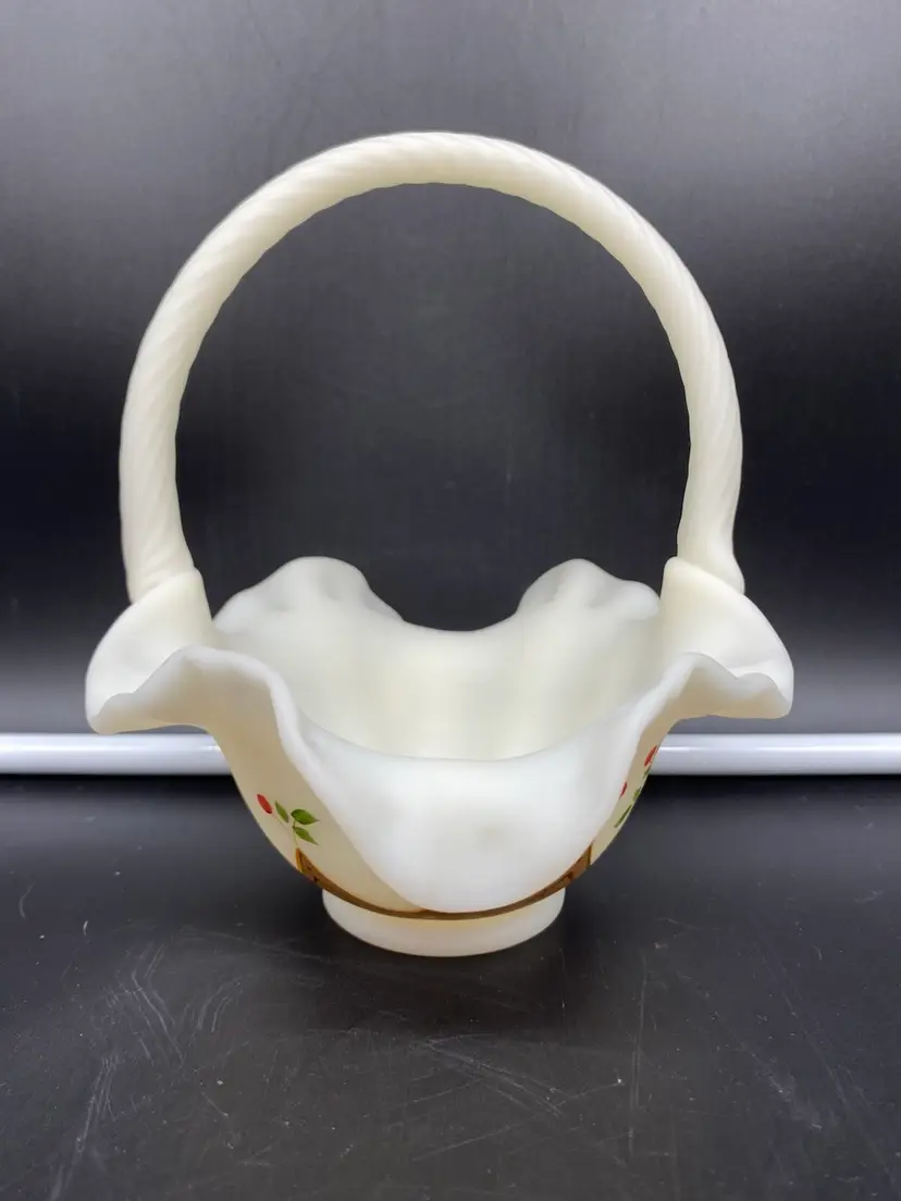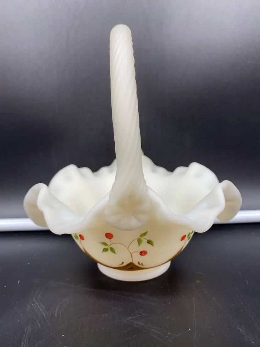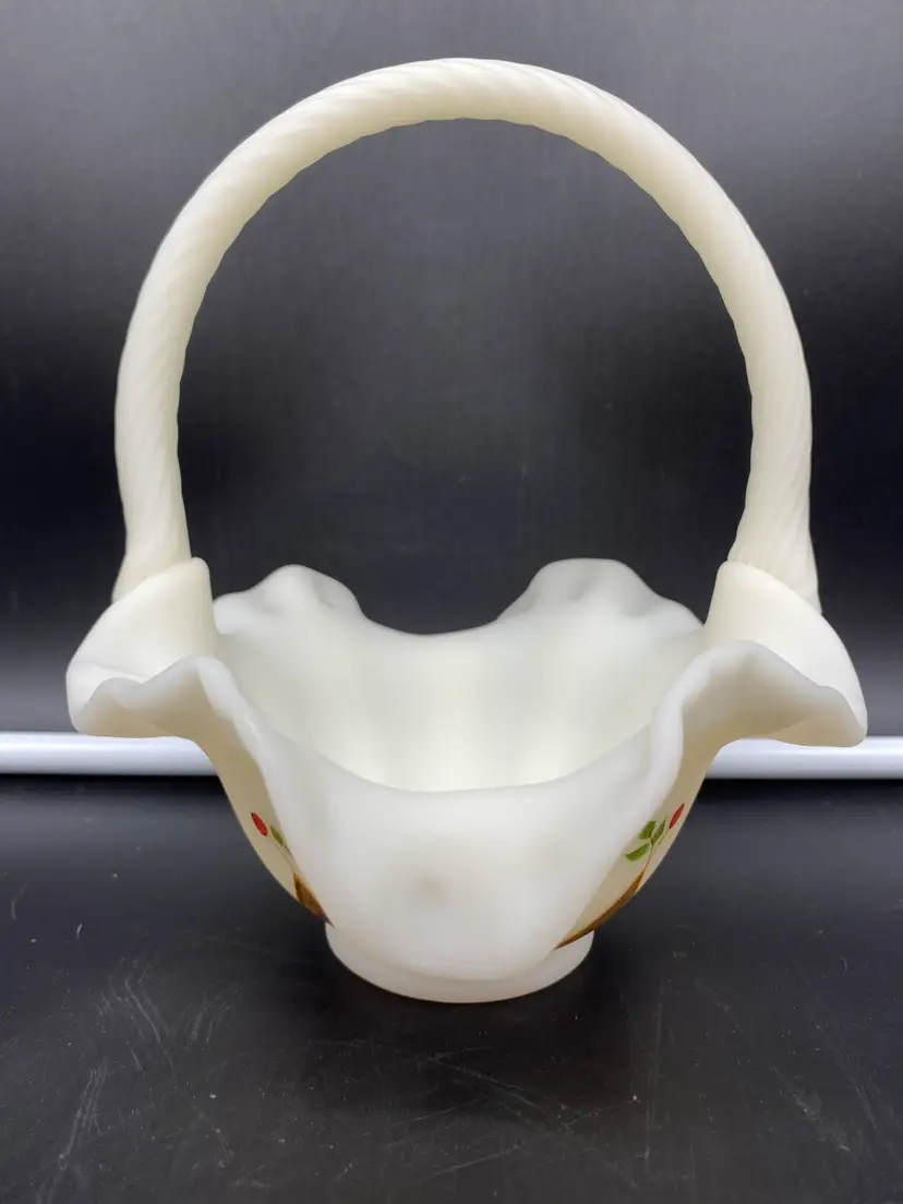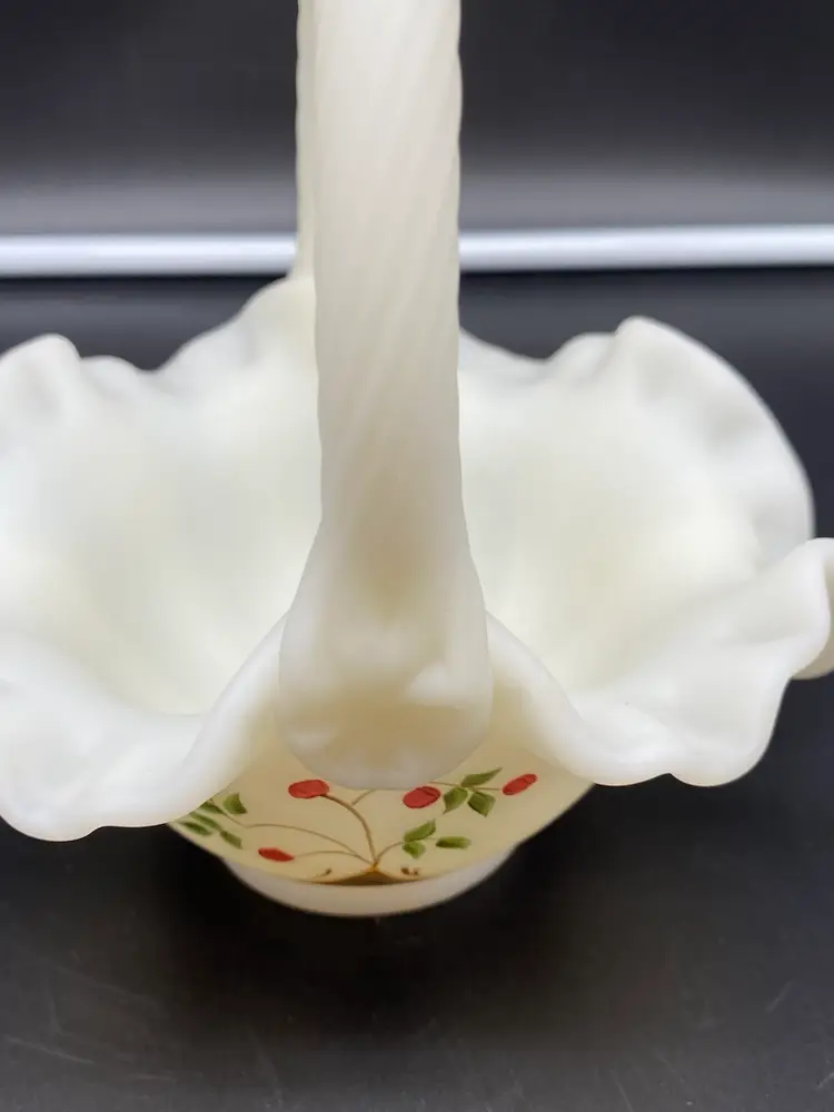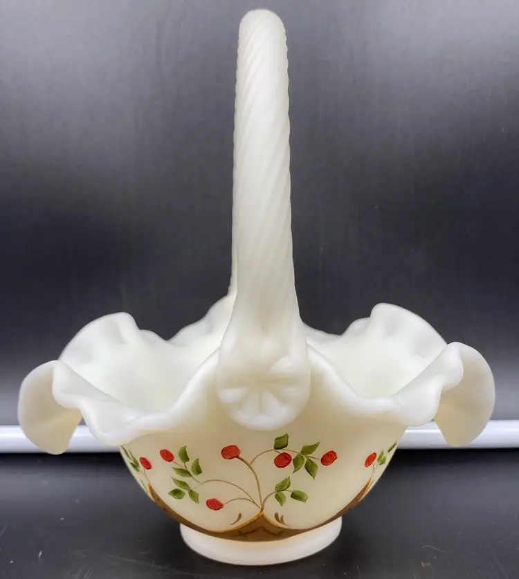 This is in very good condition. There are no chips, cracks or scratches. It is approximately 7" tall and 6-1/2" across the ruffles. It is beautifully painted with Red berries and leaves. It is signed by artist A. (Alice) Farley. The applied handle was designed by Fenton artist Dave Vincent.