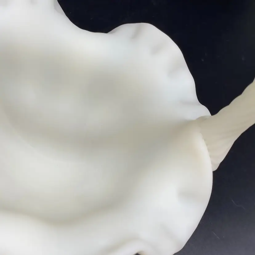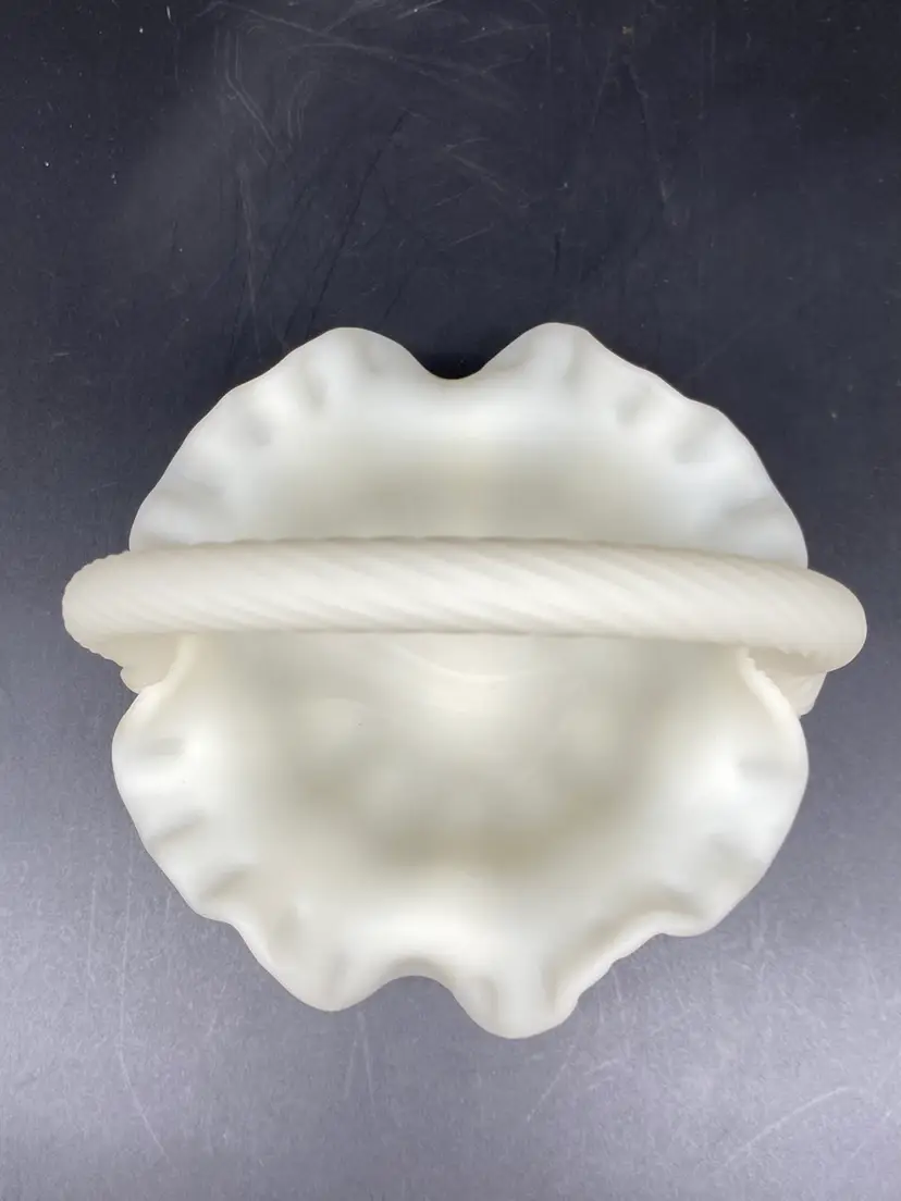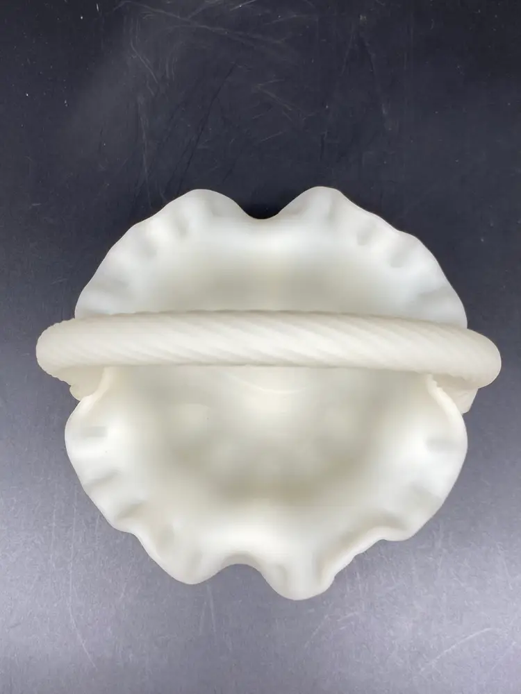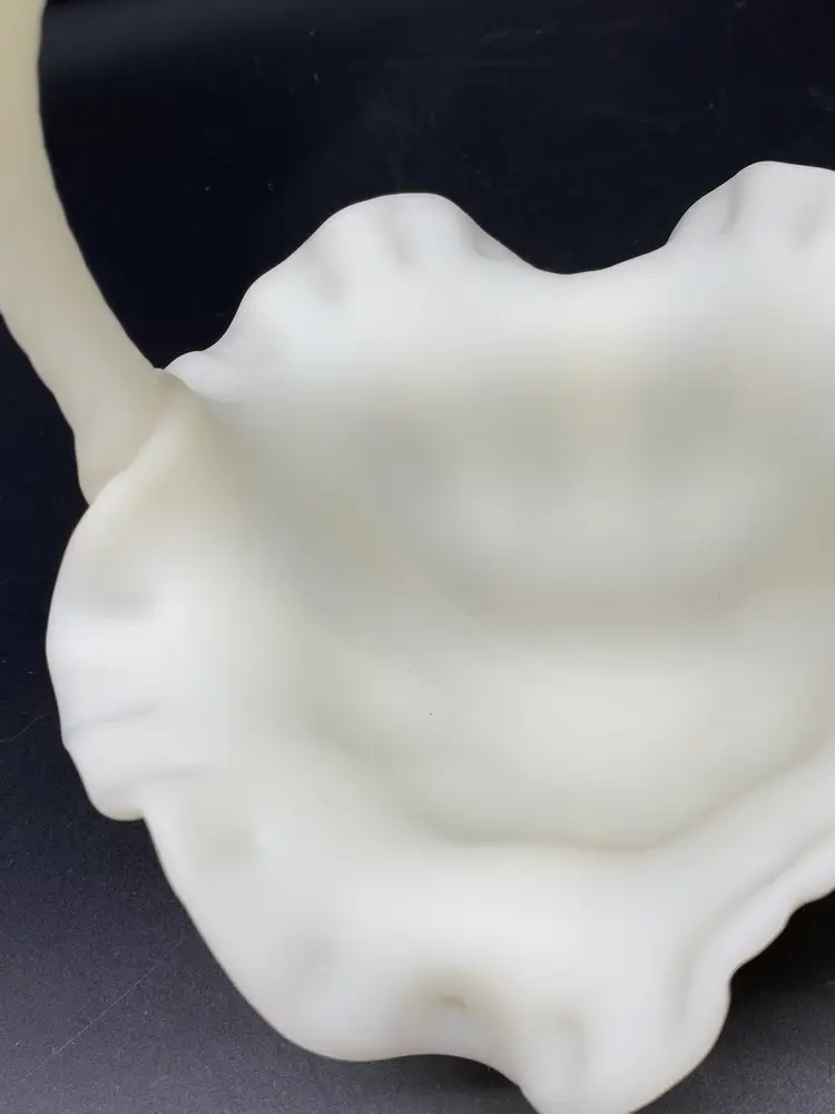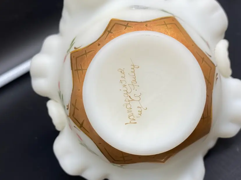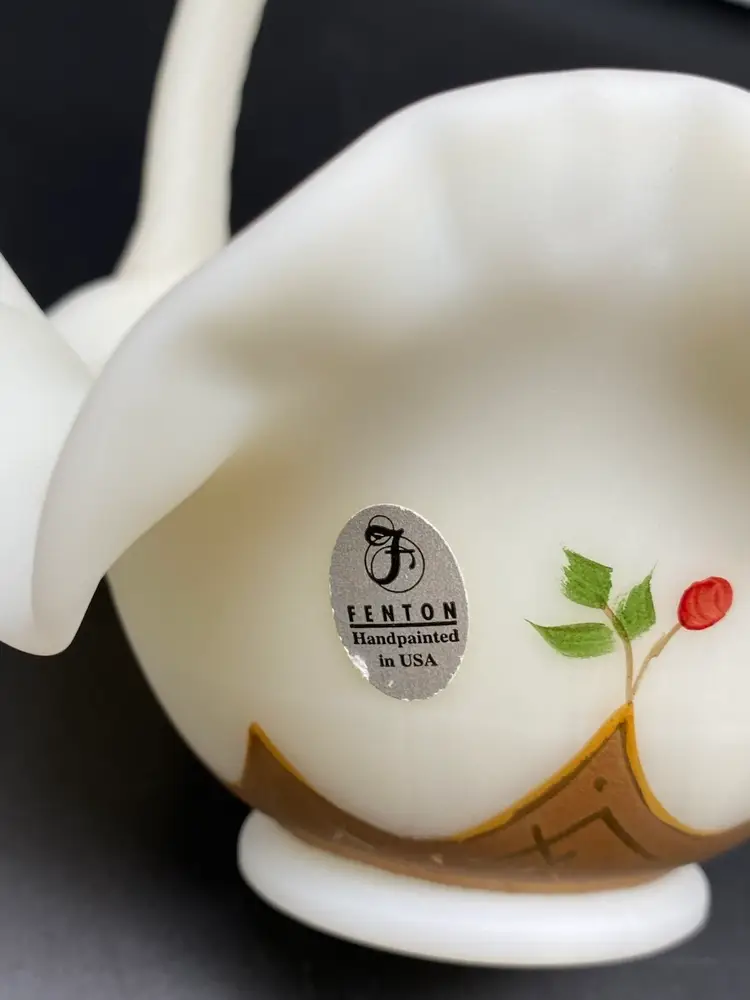 This is in very good condition. There are no chips, cracks or scratches. It is approximately 7" tall and 6-1/2" across the ruffles. It is beautifully painted with Red berries and leaves. It is signed by artist A. (Alice) Farley. The applied handle was designed by Fenton artist Dave Vincent.