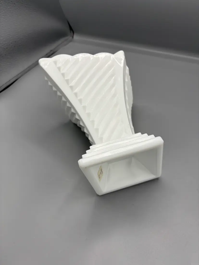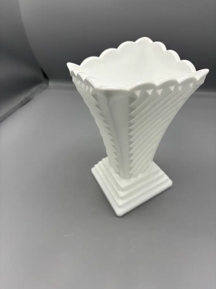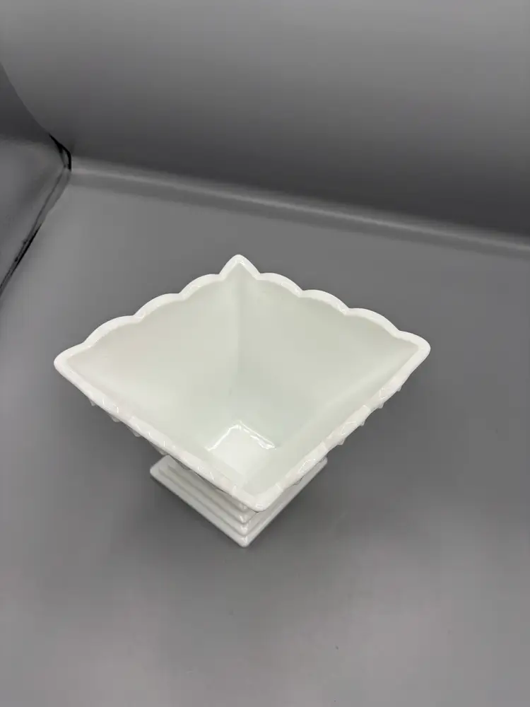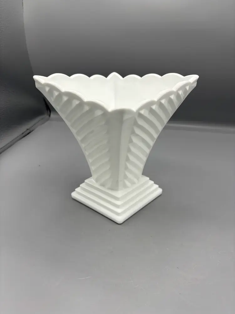 This elegant Fenton creation showcases the geometric sophistication of the Art Deco movement, rendered in pristine white glass. Standing 7 inches tall, it exemplifies the refined craftsmanship Fenton is renowned for, with clean lines and balanced proportions that complement both traditional and contemporary interiors. A distinguished piece for collectors and design enthusiasts alike.
