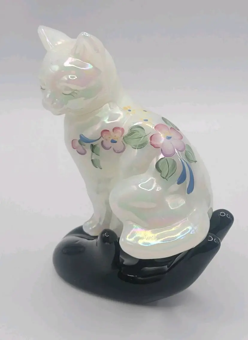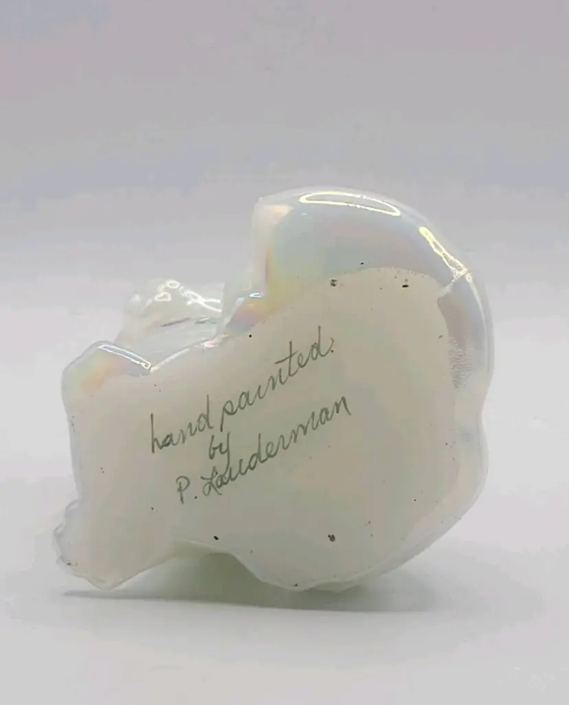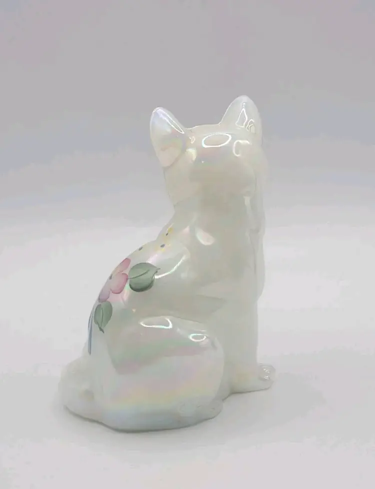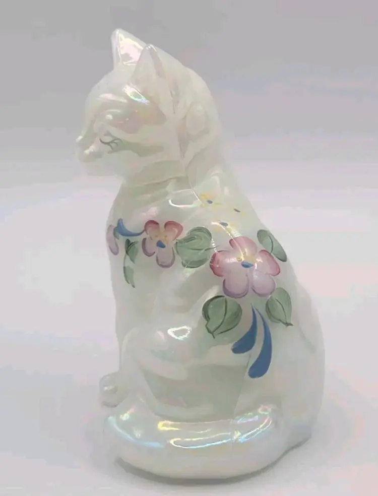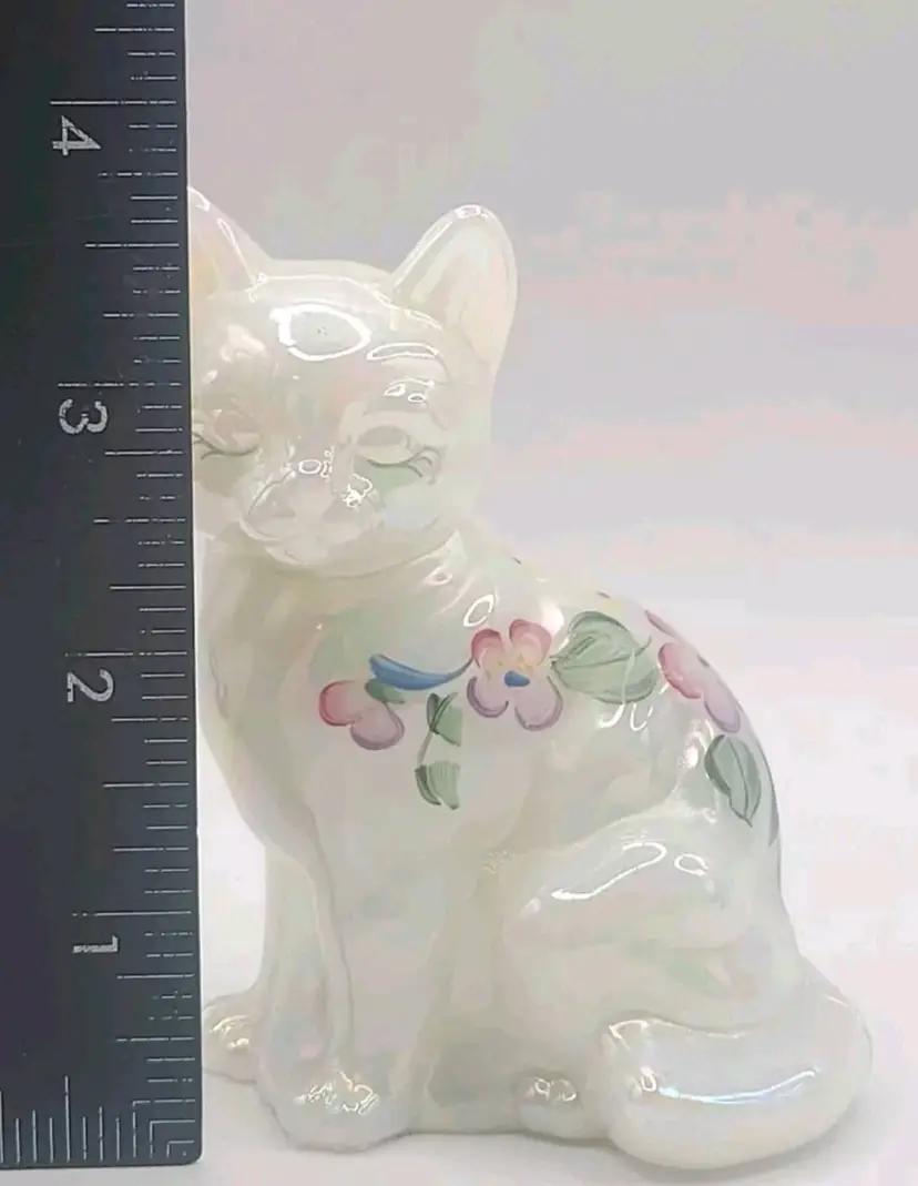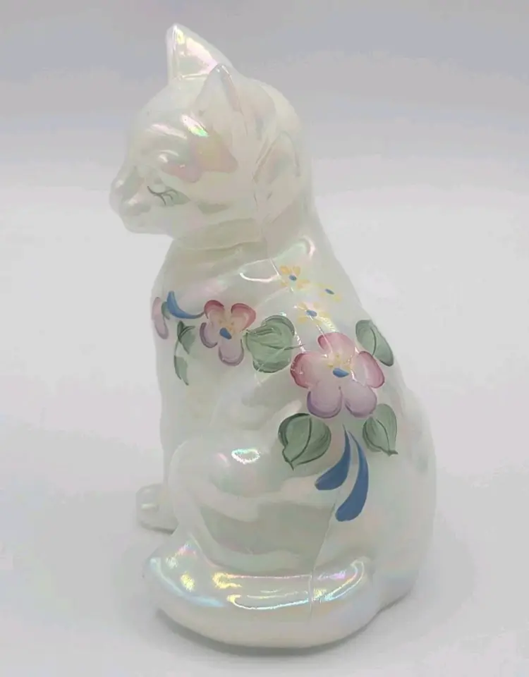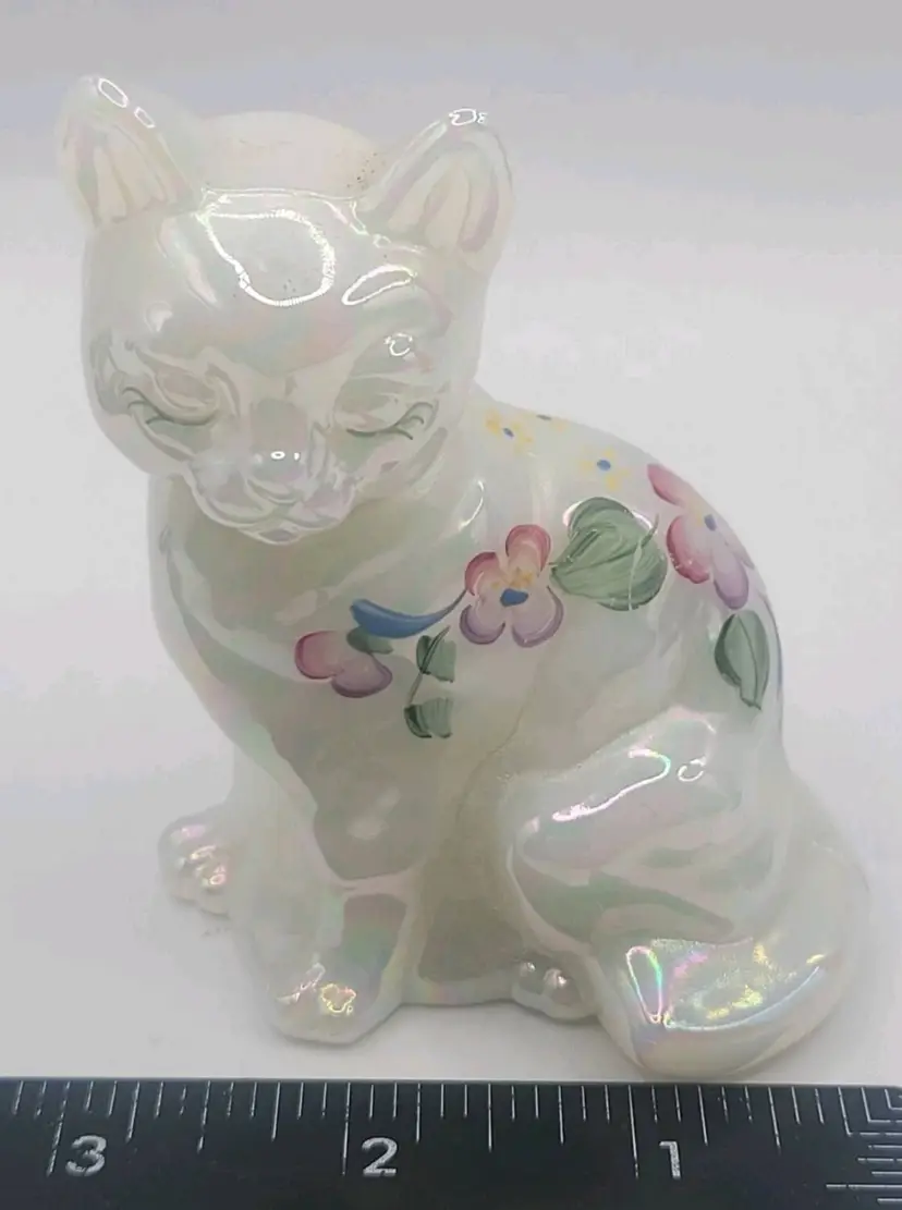 Fenton White Iridescent Handpainted Florals Glass Cat • P. Lauderman • 3.75"H Very good condition. Minimal paint wear. No chips, cracks, or breaks. Minimal surface wear. View pictures Approx. 3.75" H