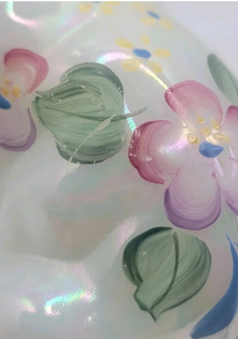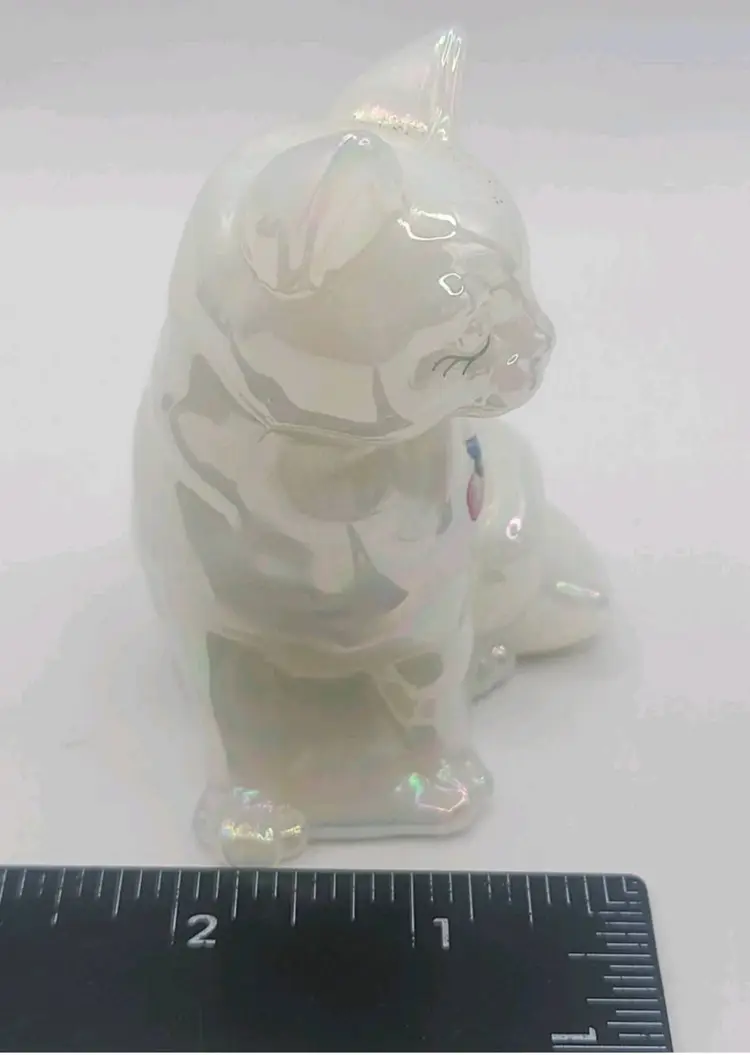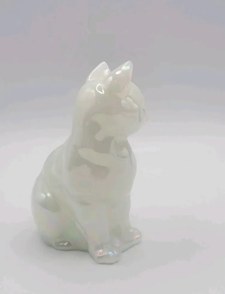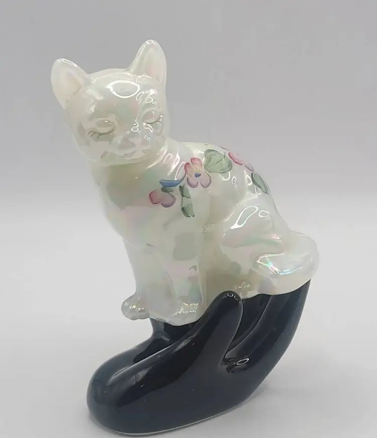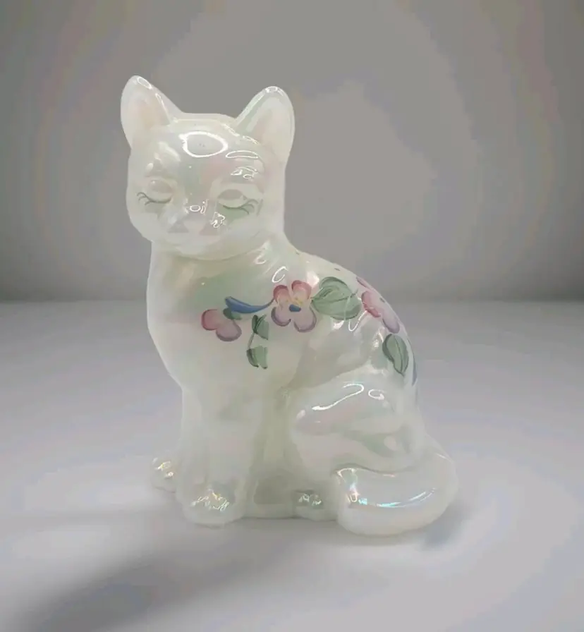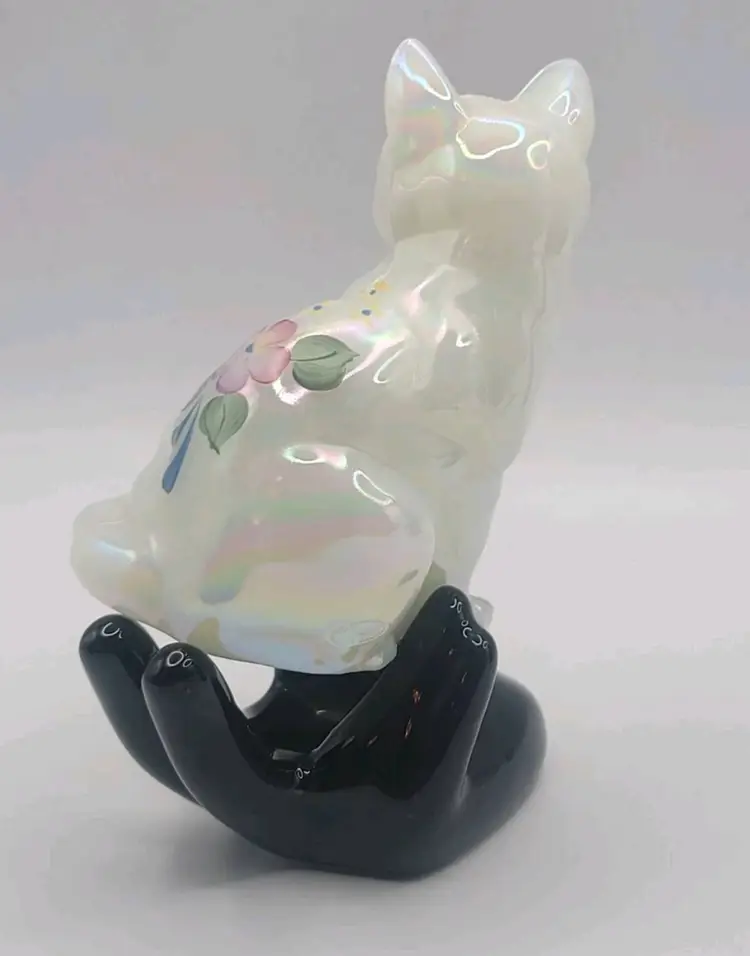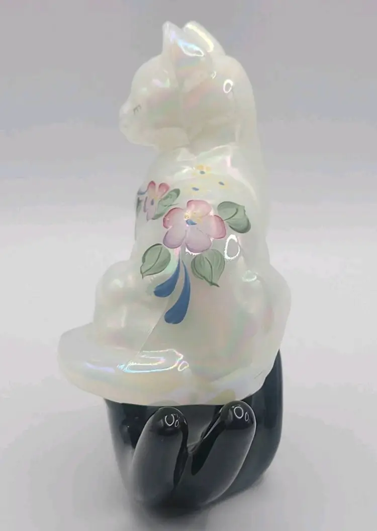 Fenton White Iridescent Handpainted Florals Glass Cat • P. Lauderman • 3.75"H Very good condition. Minimal paint wear. No chips, cracks, or breaks. Minimal surface wear. View pictures Approx. 3.75" H