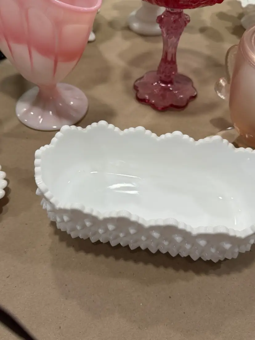 035. Fenton White Milk Glass Hobnail Scallop Top Oval Dish