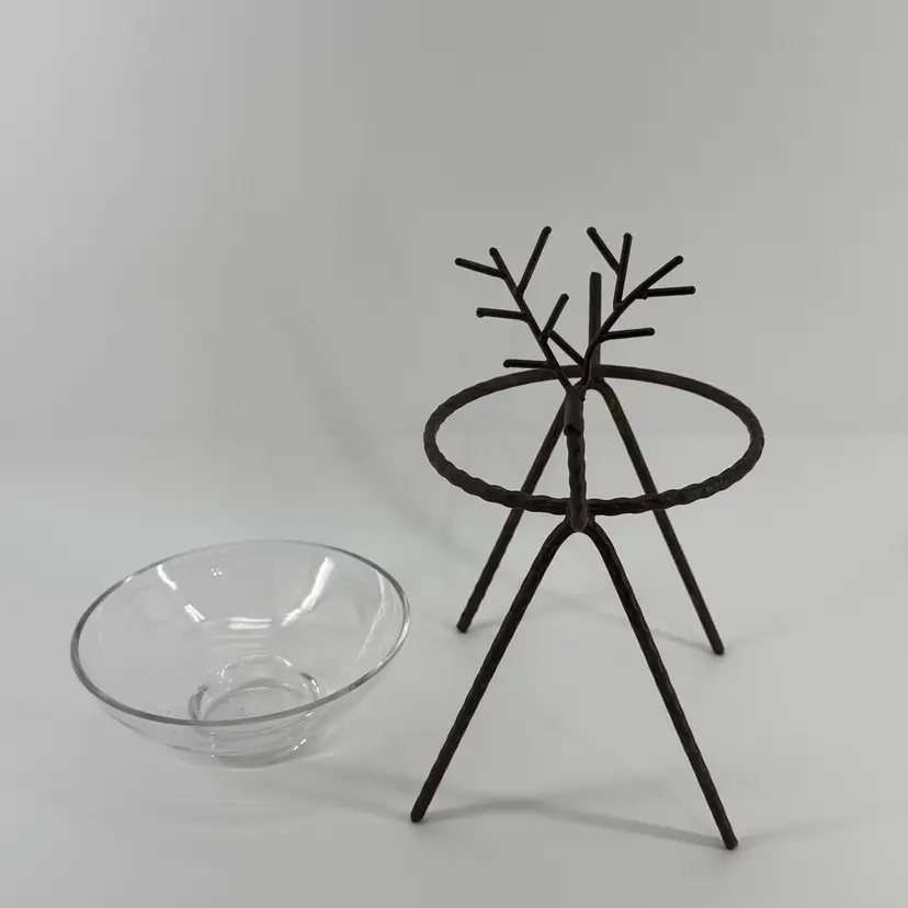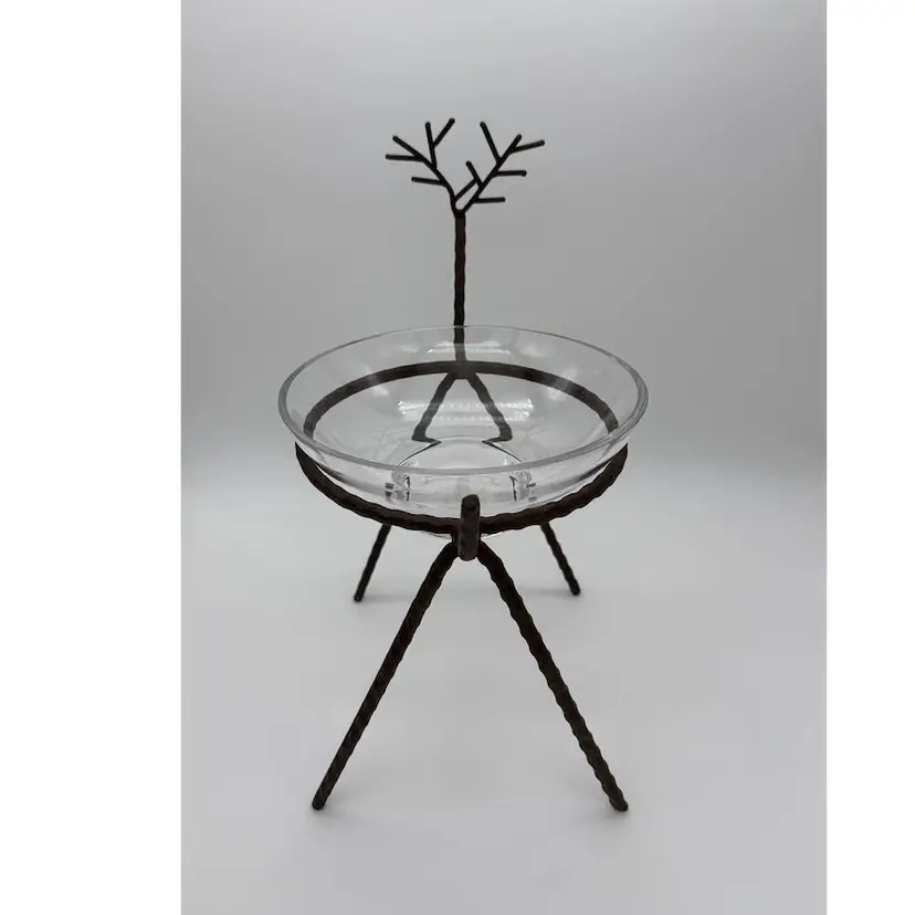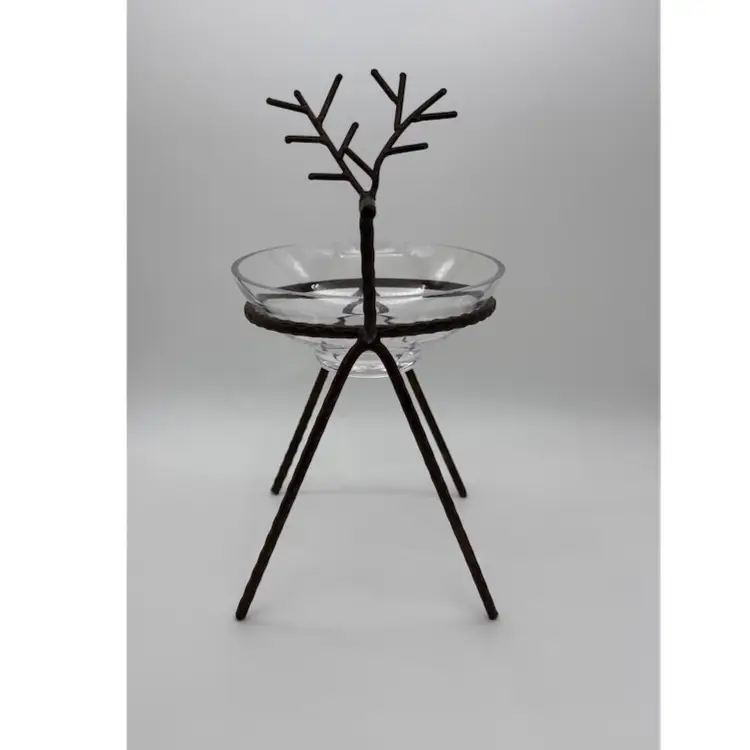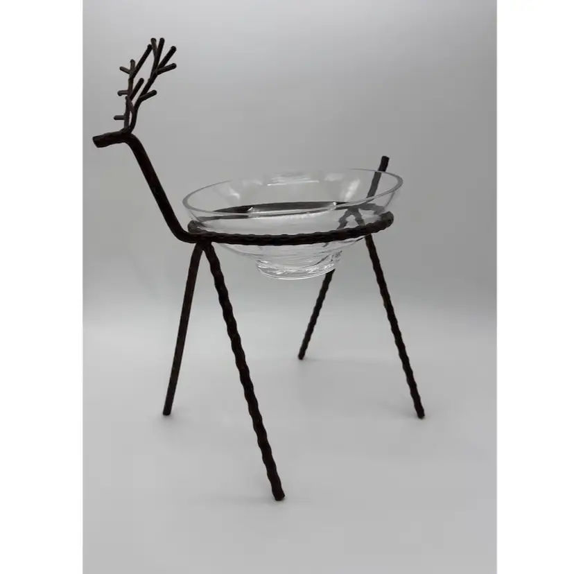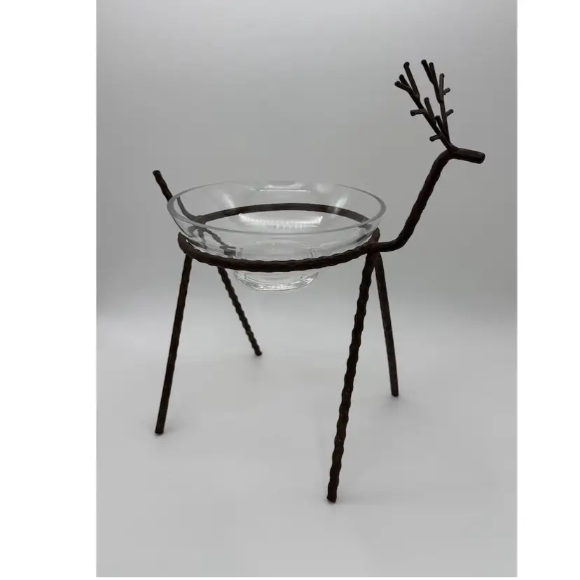 This 2-piece iron reindeer shape centerpiece with a glass bowl is a festive and charming addition to your holiday decor. The rustic bronze finish and glass bowl complement each other perfectly, creating a contemporary and seasonal look. The reindeer design adds a touch of whimsy, making it suitable for various rooms in your home including the living room, kitchen, bedroom, and more. This centerpiece is not only decorative but also functional, weighing 3 lbs and measuring 13” in length, 14” in height, and 8” in width. Bring a touch of cabin charm into your space with this unique and eye-catching piece. Very Good Condition. Lightly Used.