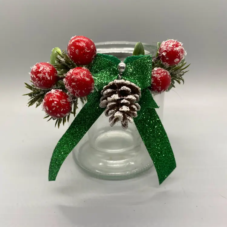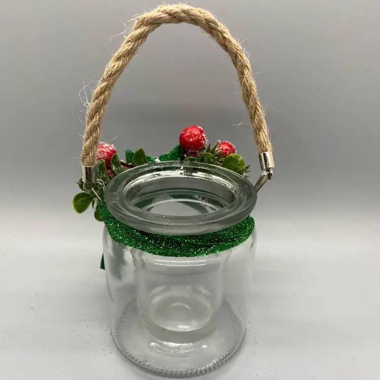 Brighten up your holiday decor with this charming glass jar votive candle holder, adorned with a glittery green bow, frosted pinecone, and vibrant red berries. Perfect for adding a touch of festive cheer to any room. Includes glass votive/tealight candle holder insert and Jute rope hanger. Measures 3.5"