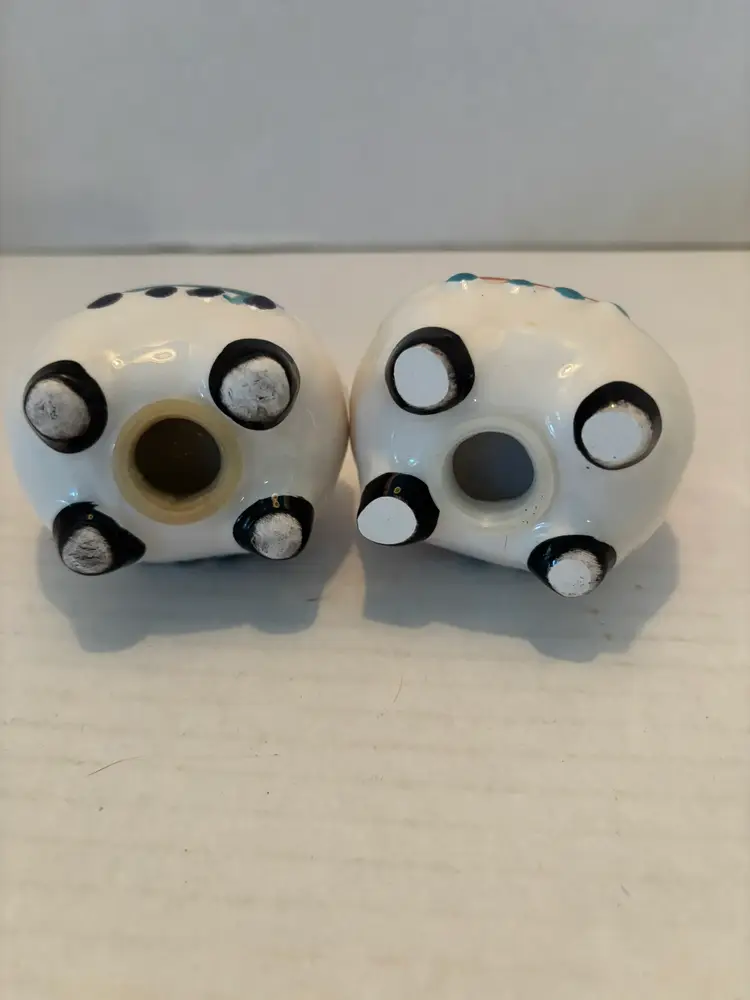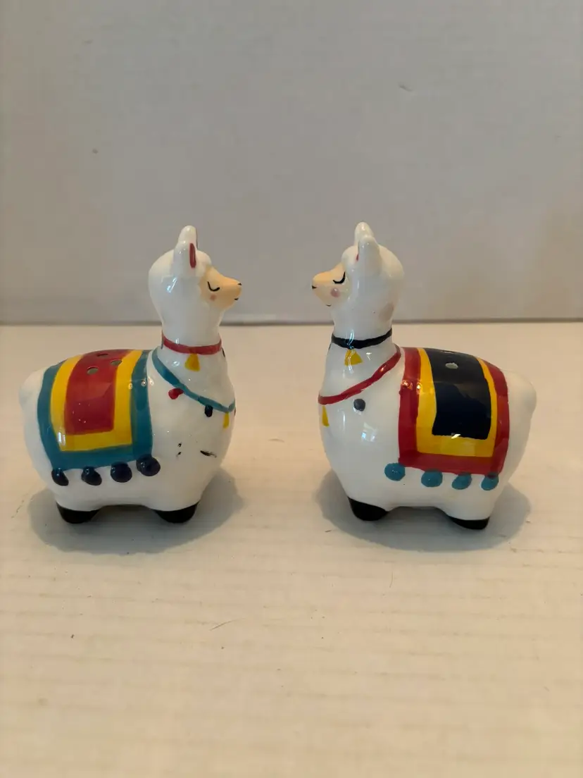 This product is a set of two hand-painted llama salt and pepper shakers. The ceramic shakers are small in size, multicolored, and come with stoppers for easy storage. Perfect for all occasions, this original set is a fun addition to any kitchen or dining table, adding a touch of whimsy to meal times.