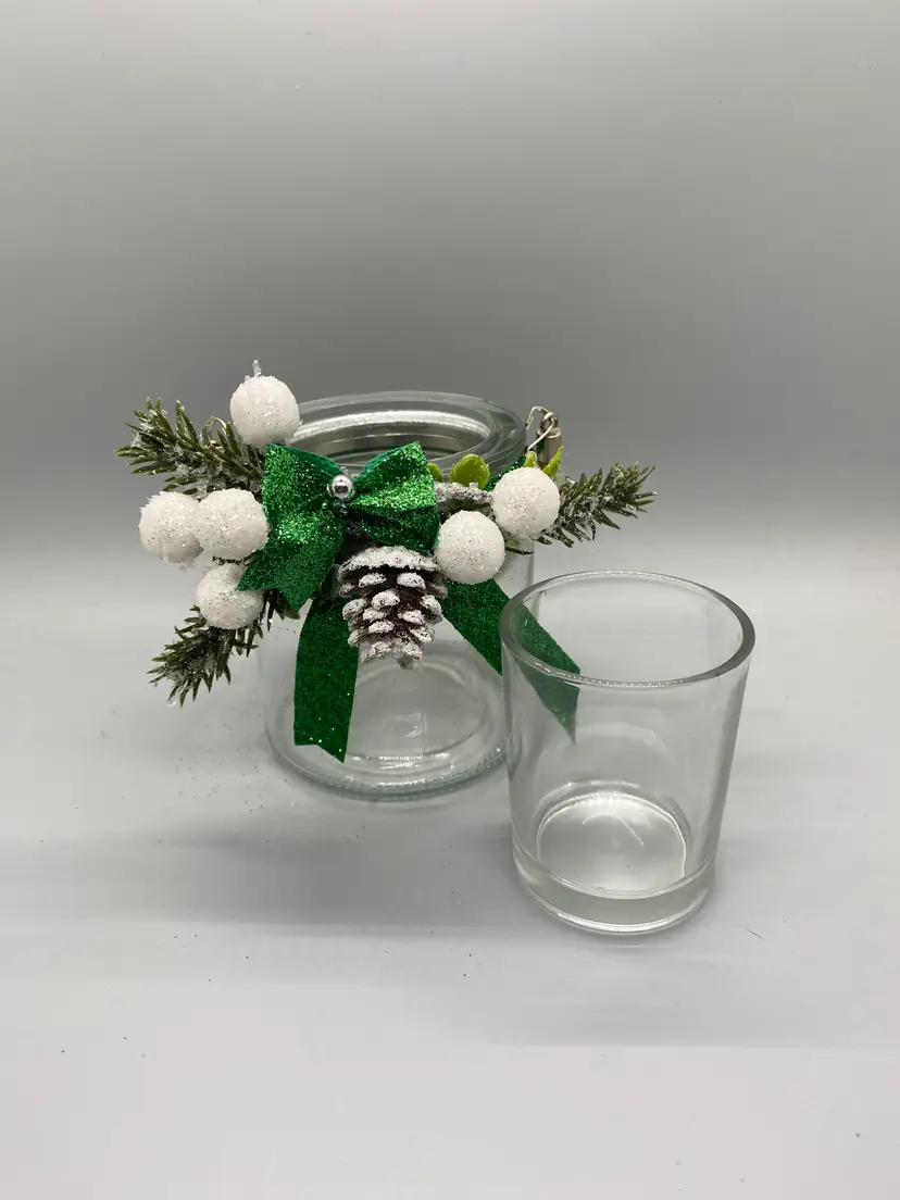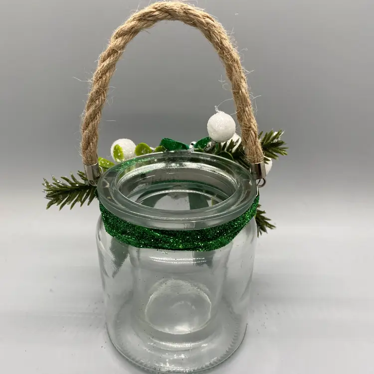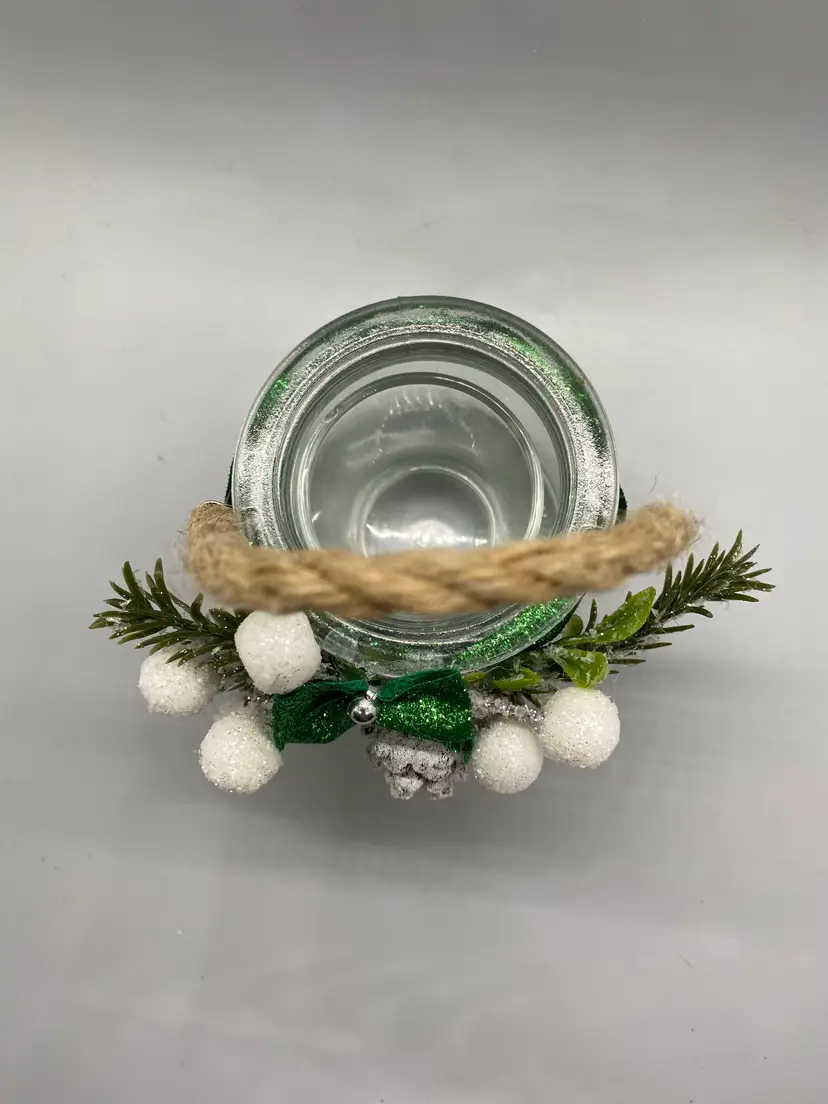 Brighten up your holiday decor with this charming glass votive candle holder. Adorned with a glittery green bow, frosted pinecone, and festive white berries, it's perfect for adding a cozy touch to any room. Ready to hang with a rustic rope handle. Includes glass votive/tealight candle holder insert. Measures 3.5" Tall