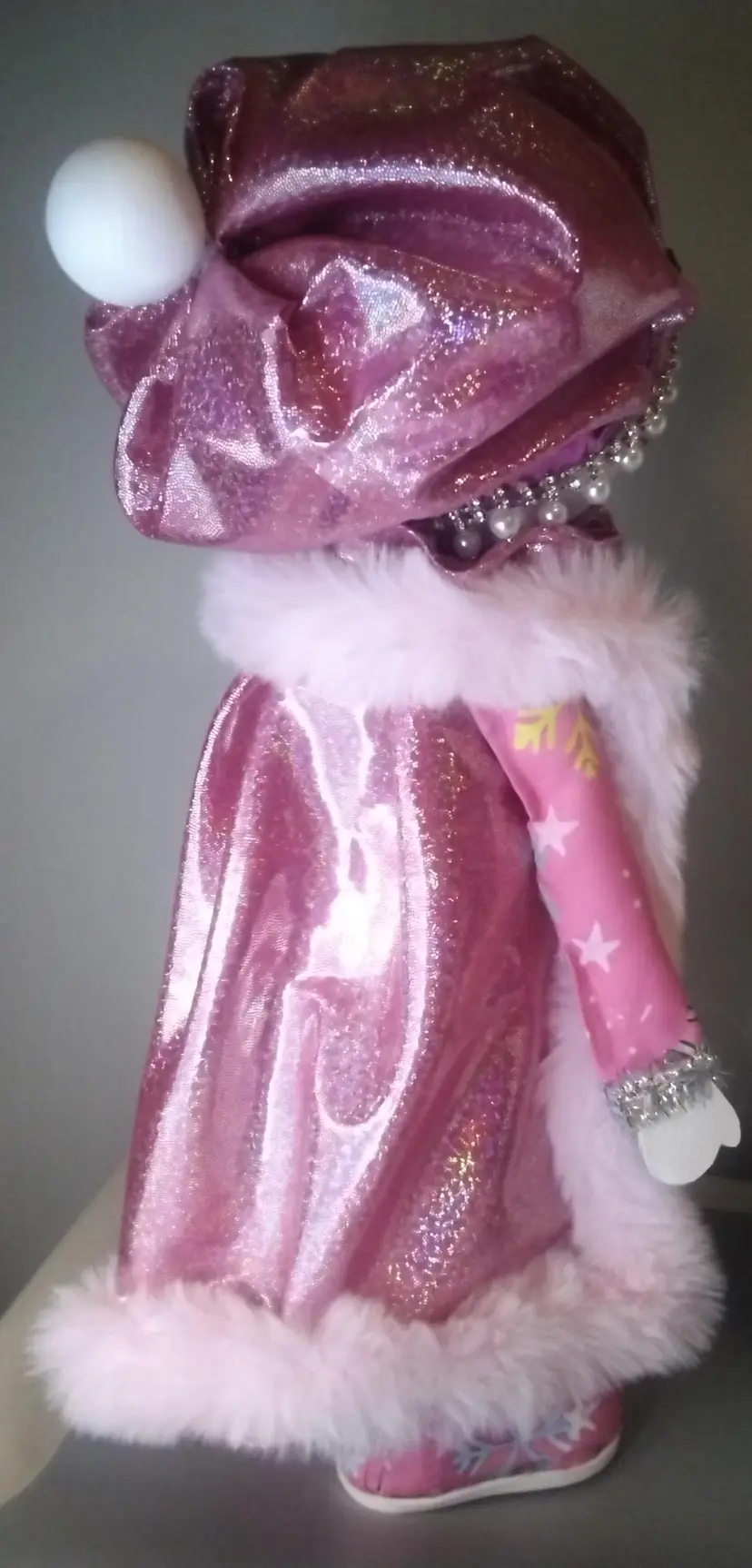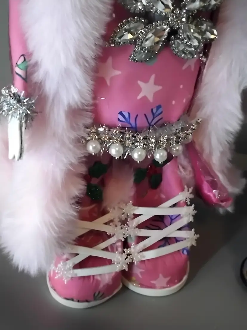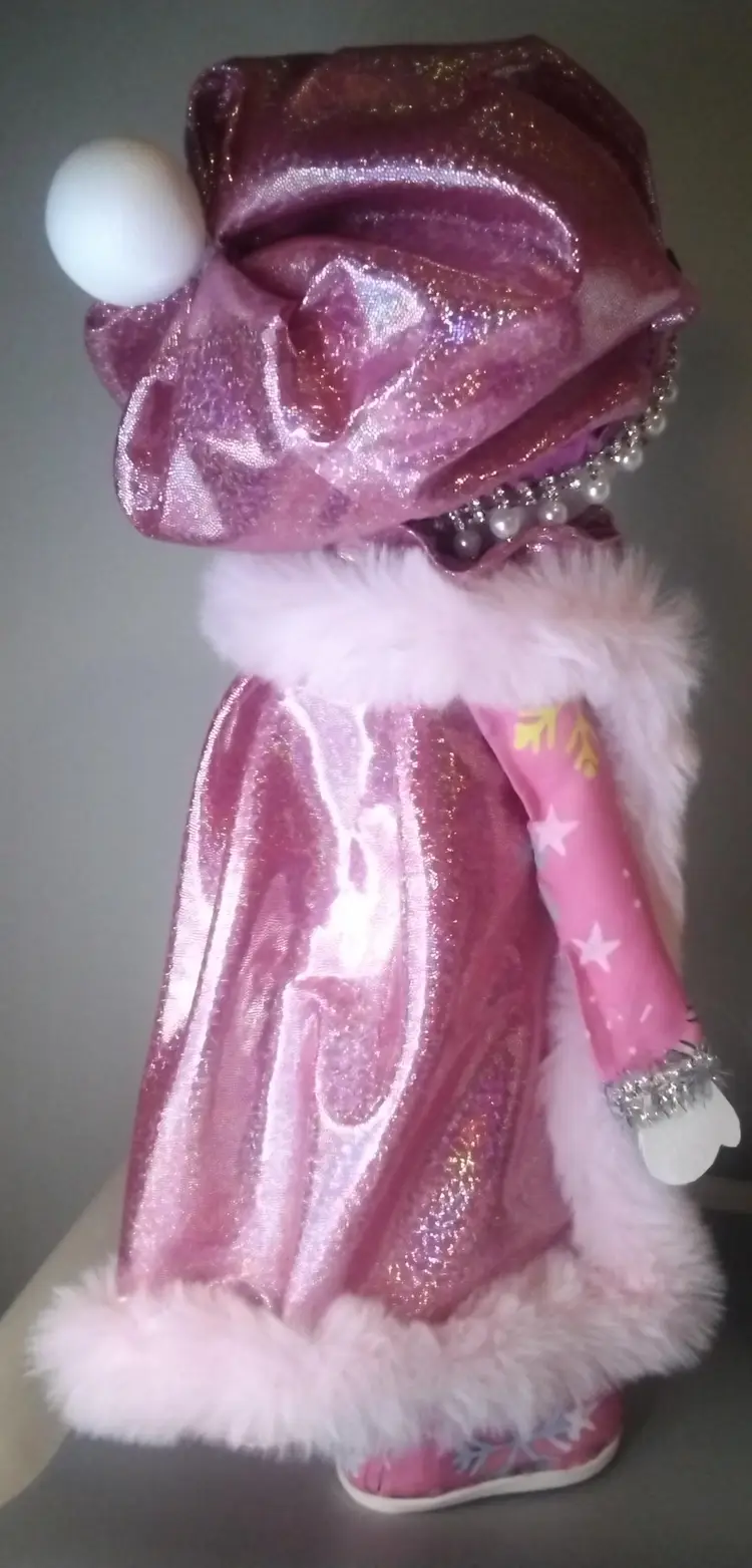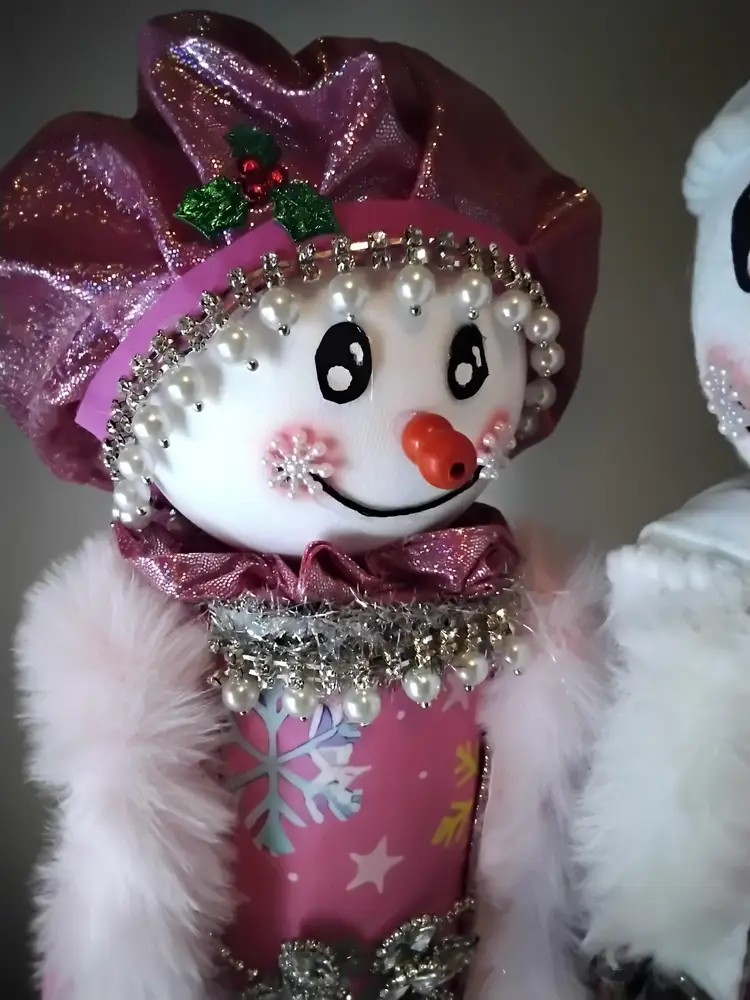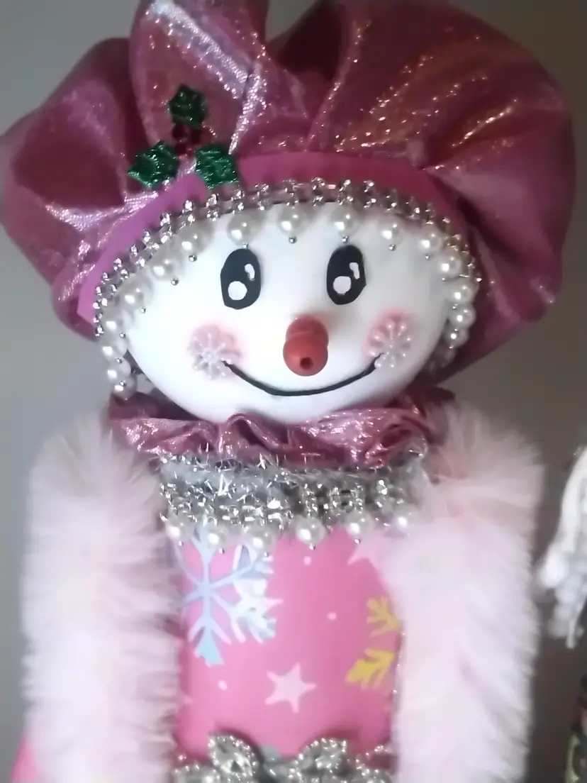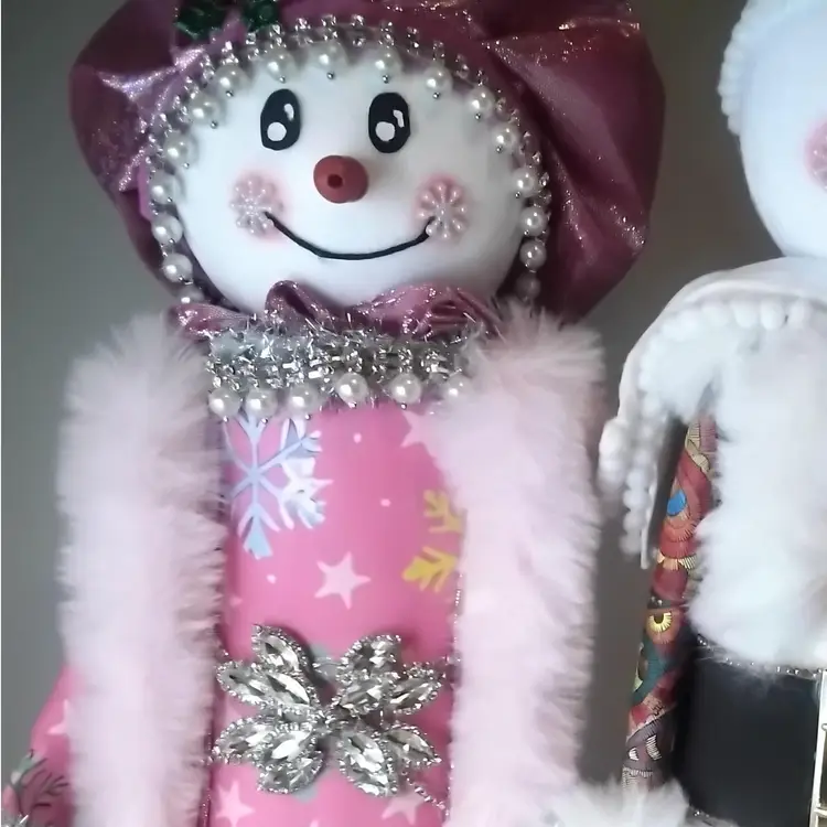 Add a touch of whimsy to your holiday decor with this charming snowman figure. Dressed in a pink outfit adorned with snowflakes and sparkling embellishments, this piece is perfect for bringing festive cheer to any room.
