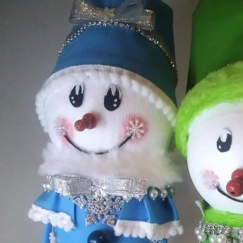 Add a touch of whimsy to your holiday decor with this handcrafted snowman duo. Dressed in vibrant blue and green outfits, these cheerful figures are adorned with sparkling details and charming accessories. Perfect for bringing festive cheer to any room.
