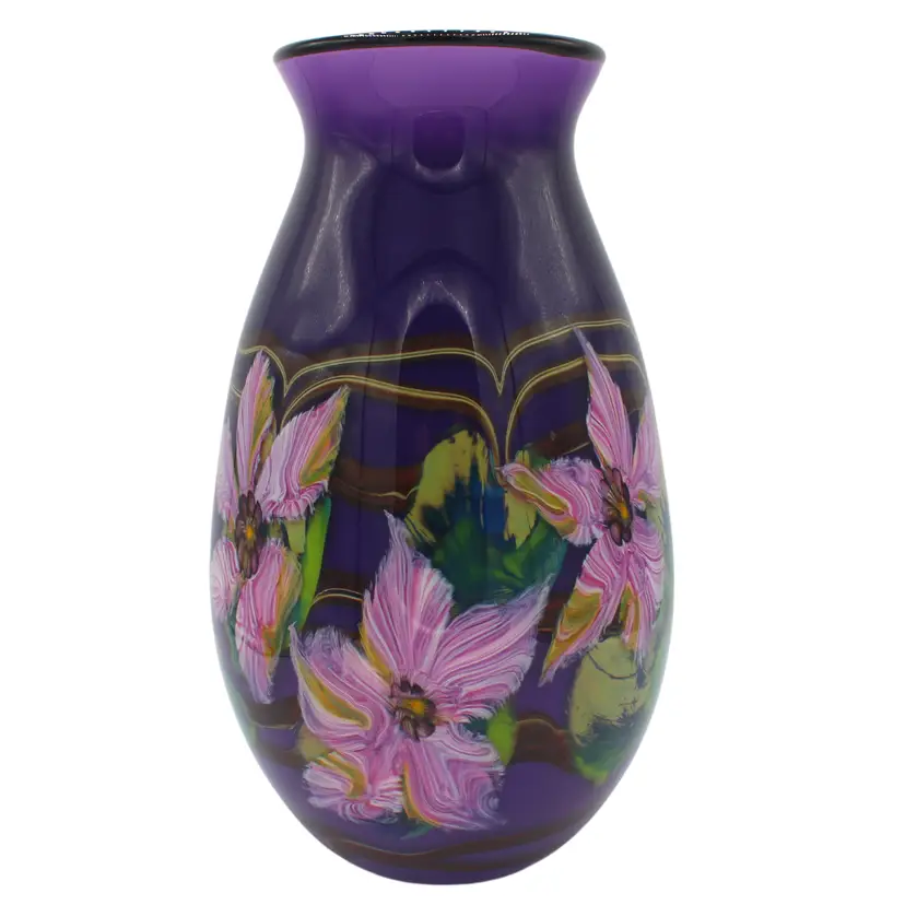 • Authentic Fields & Fields studio art glass vase, signed and dated 2002 • Hand-blown multi-layered glass featuring dogwood blossom design • Rich violet / amethyst body glass with pink, sage, amber, and white tones • Beautiful painterly floral petals encased within clear glass layers • Signed on polished base: “Fields & Fields 2002” • A striking example of modern American studio glass artistry • Ideal for collectors of botanical art glass, floral décor, or contemporary glass sculpture