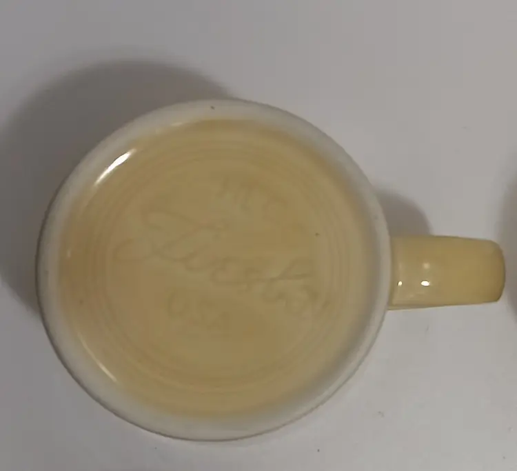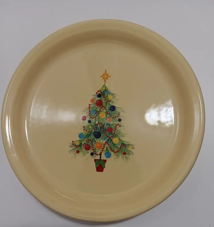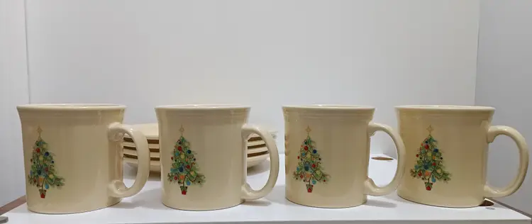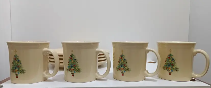 Fiesta Ware Cream Colored Christmas Holiday Pattern Set of Four 12 oz Mugs and Set of Four 9 Inch Plates; All Mugs Signed HLC Fiesta USA; All Plates are Marked Homer Laughlin Co. Fiesta (see pics); Excellent Condition; No Chips, Cracks or Scuffing! Just in Time for Christmas Cookies and Hot Chocolate!! Mugs 3.75" T x 3.5" Diameter