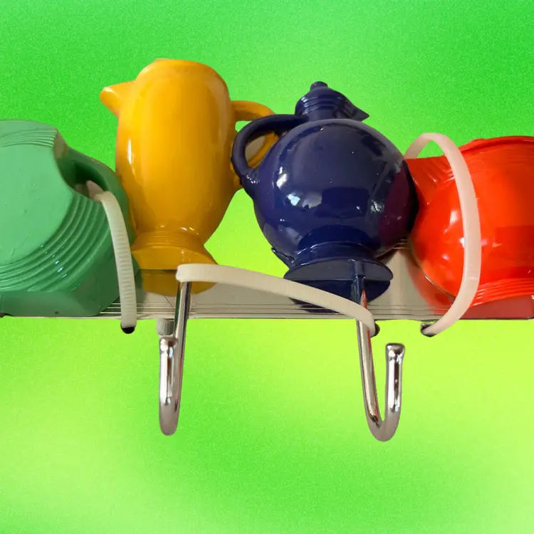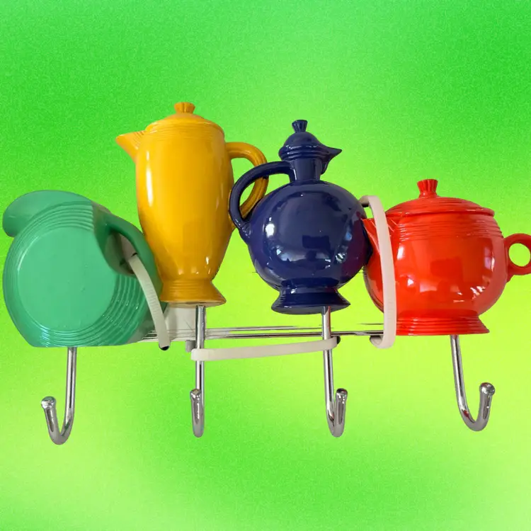 Fiesta brand wall hook embellished with some of their famous kitchenware pieces. The holds are metal and the decorative pieces are hard plastic/resin. Never used and in original box, but the zip ties have been cut at some point. The hardware is provided and unopened.