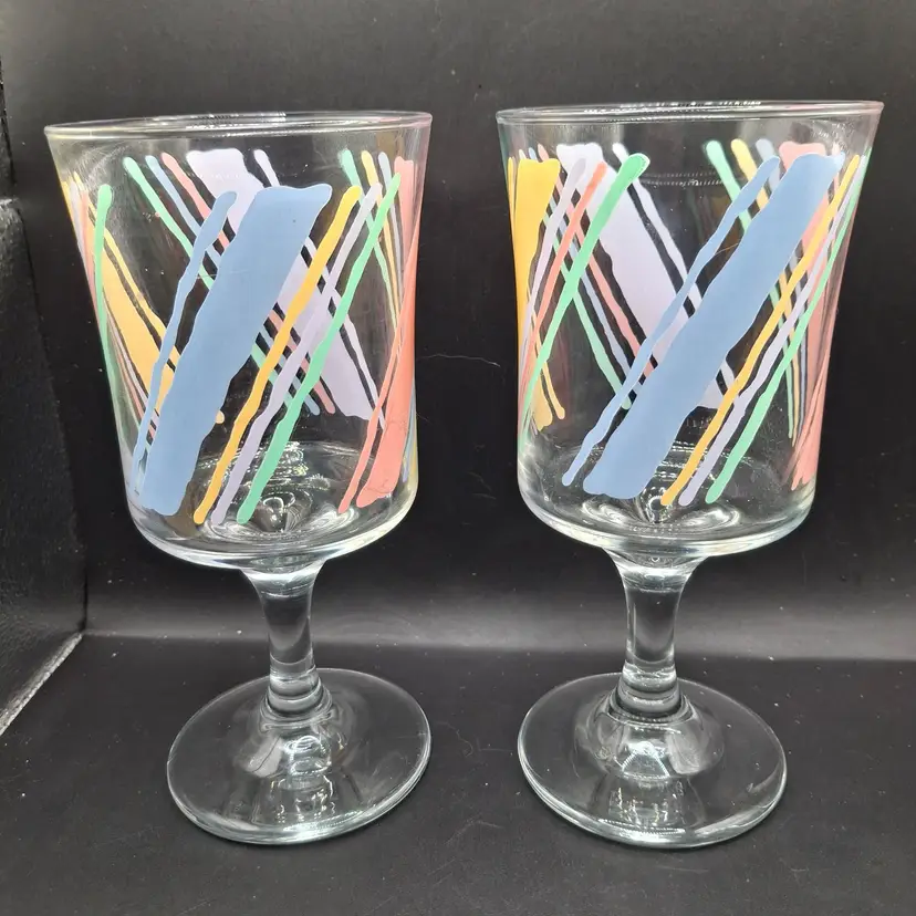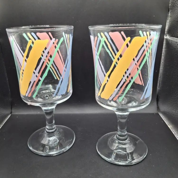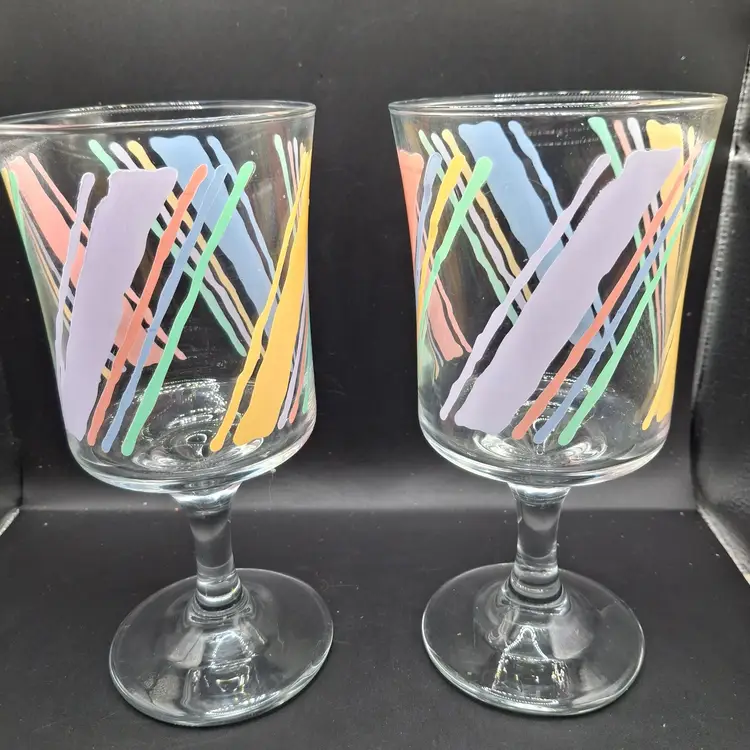 Once upon a time, in the heart of a vibrant kitchen, these vintage goblets awaited their adventures. Each goblet boasts a unique, hand-painted abstract design, ready to add a splash of color to any gathering. Crafted with care, they whisper tales of past celebrations, promising to join in many more.