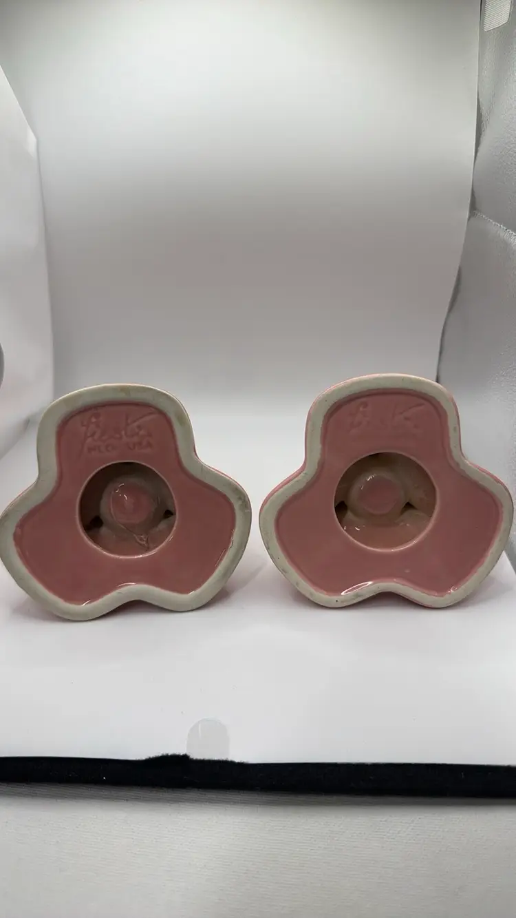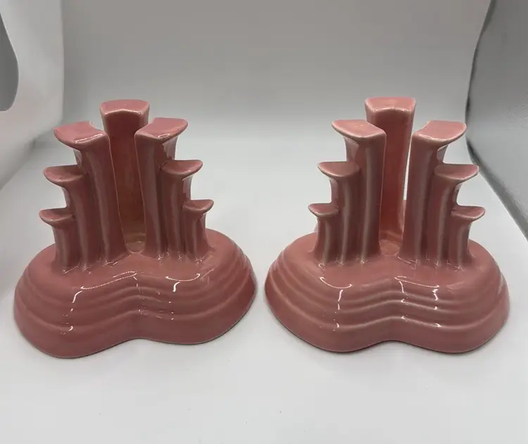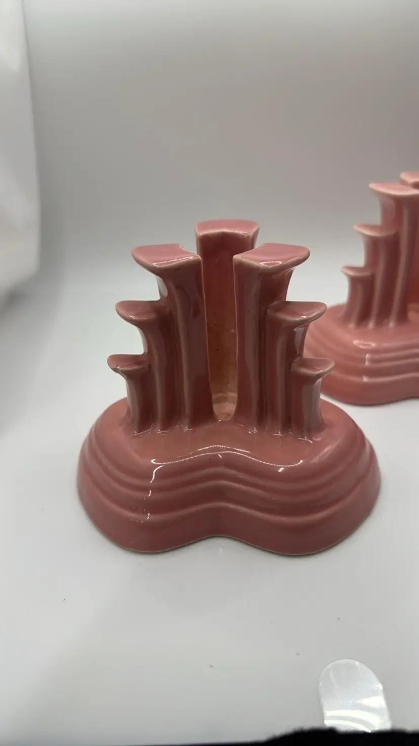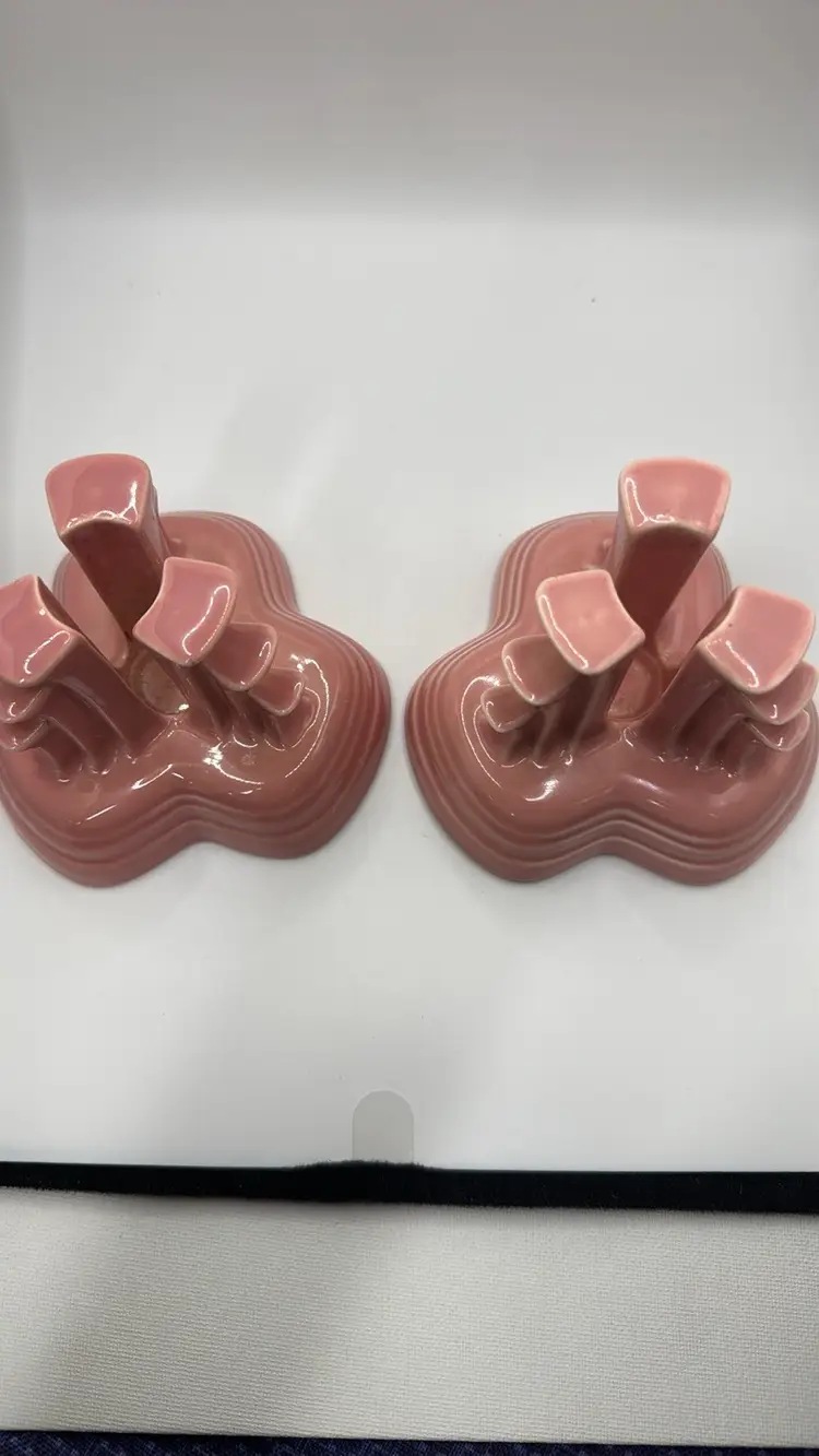 Fiesta Tripod Pyramid CANDLE HOLDERS rose a retired color 3.5” tall Excellent condition one is perfect but the other one has a chip under one of the smallest pyramids (44041125a)