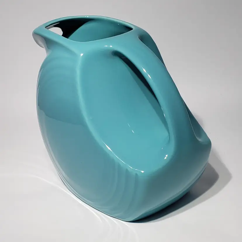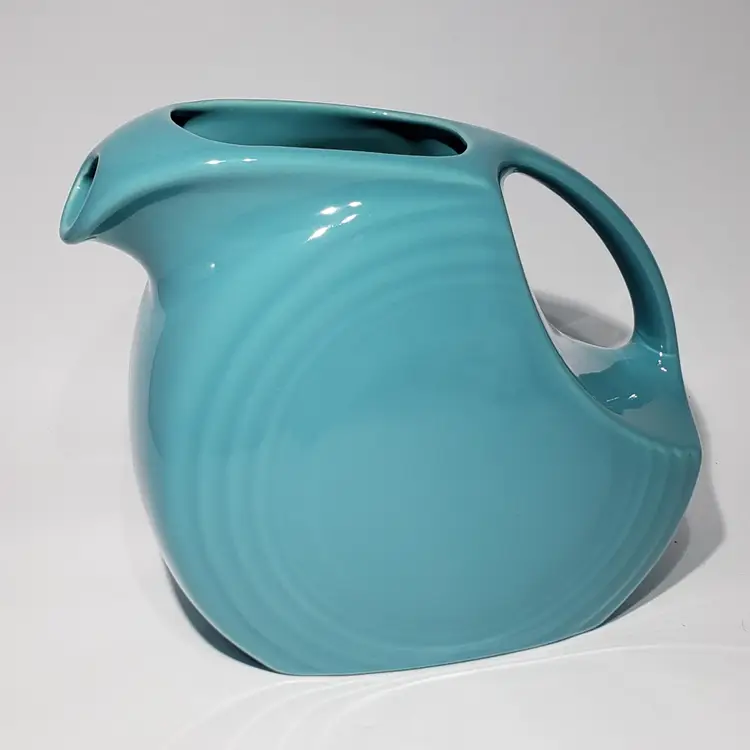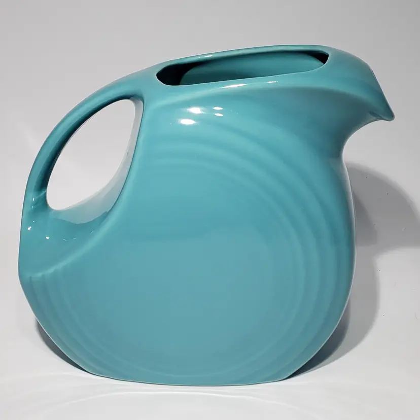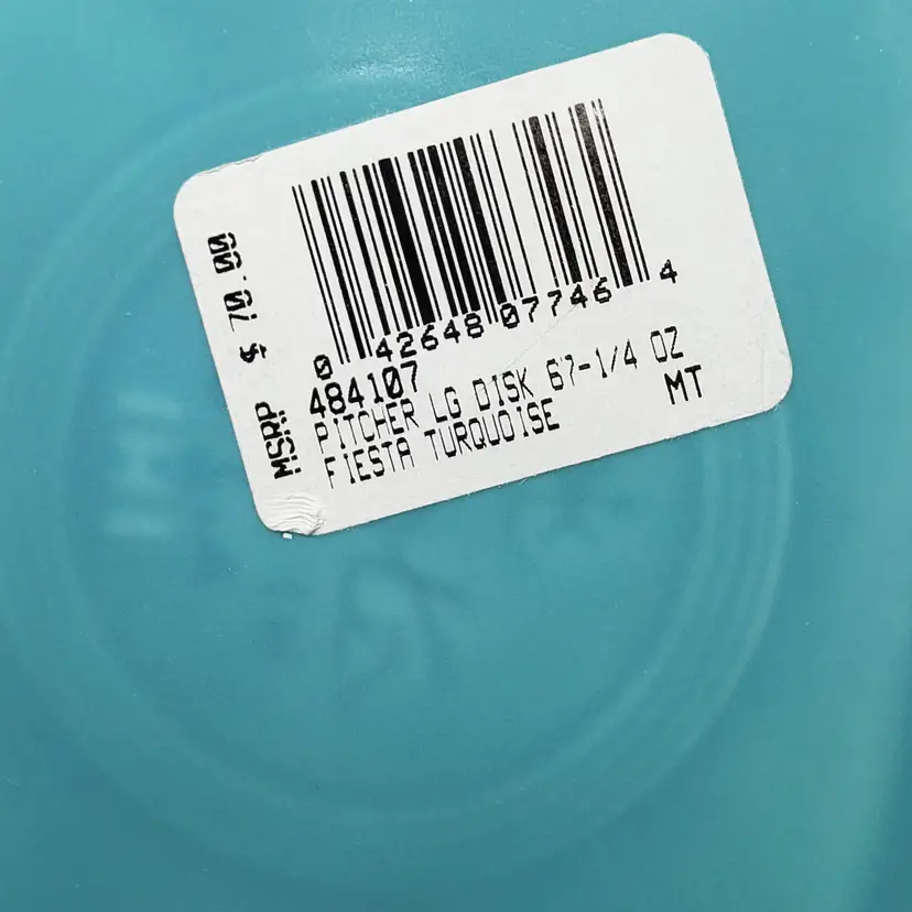 Fiesta Ware Large Disc Pitcher Turquoise Art Deco 64 oz Original Price Sticker on base. Indicates 67 1/4 fl oz Microwave, Oven, and Dishwasher Safe Measures: 8” x 5” x 7.5” Pre-owned, but like new. No chips or cracks.