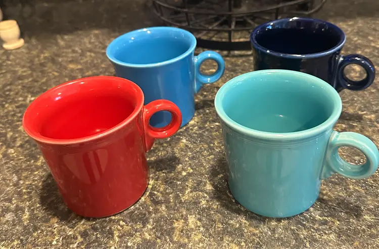 Add some fun and color to your morning routine with this group of four Fiesta Ware coffee mugs. With a variety of colors to choose from, these round ceramic mugs hold 8 oz and feature a classic O ring Tom Jerry handle. They are suitable for hot beverages and are both microwave and dishwasher safe, making them an ideal addition to any household. These mugs are perfect for all occasions and have a glossy finish with an impressed backstamp. Upgrade your coffee game today with these stylish and practical coffee mugs!