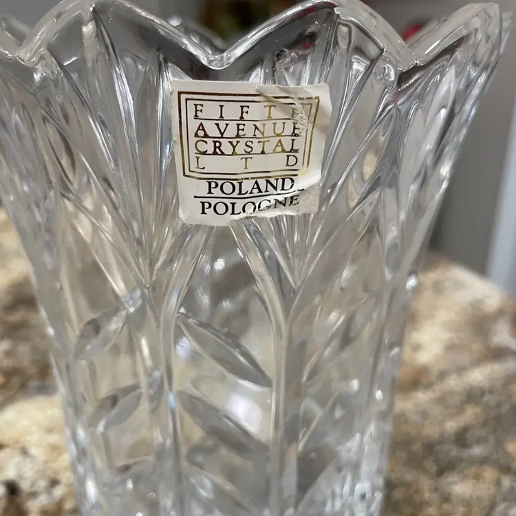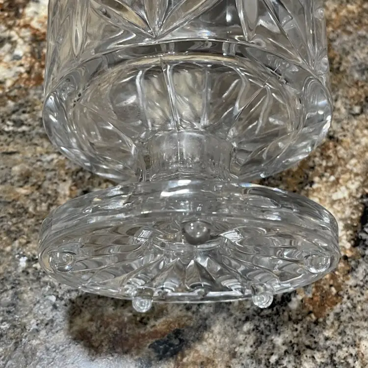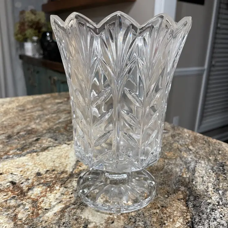 Footed, clear crystal item, often made of 24% lead crystal, featuring a distinctive leaf or paneled design.