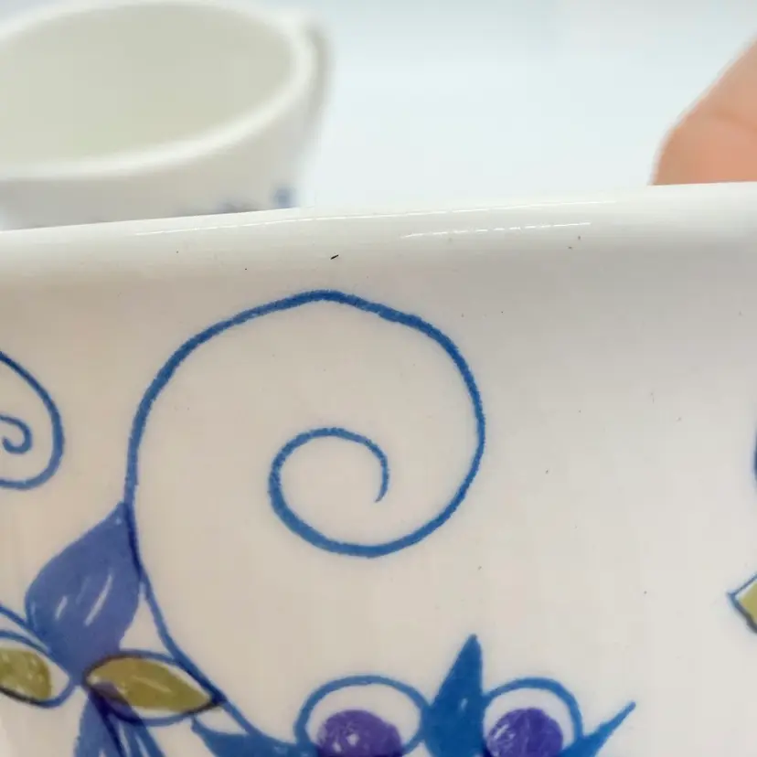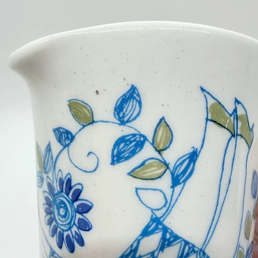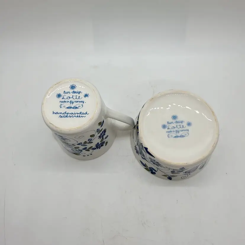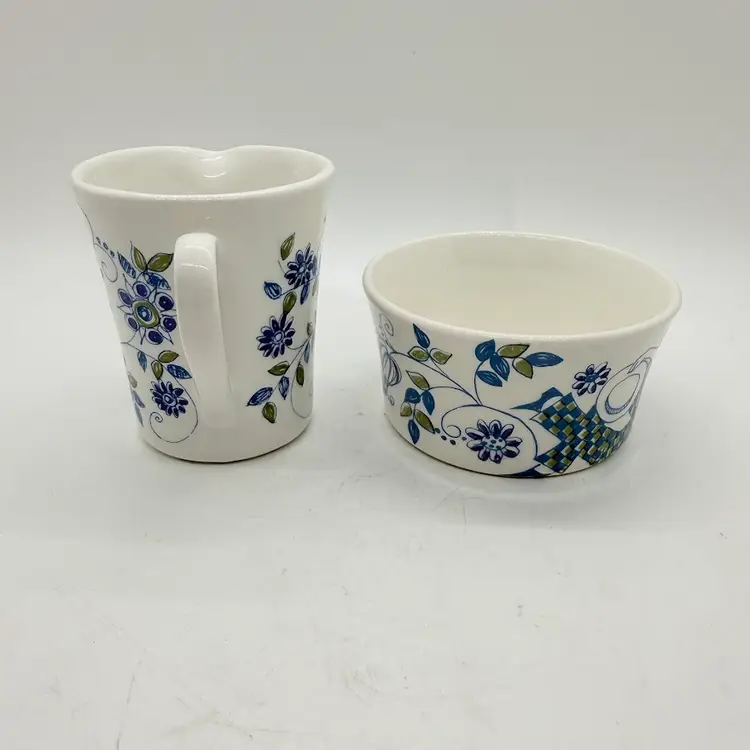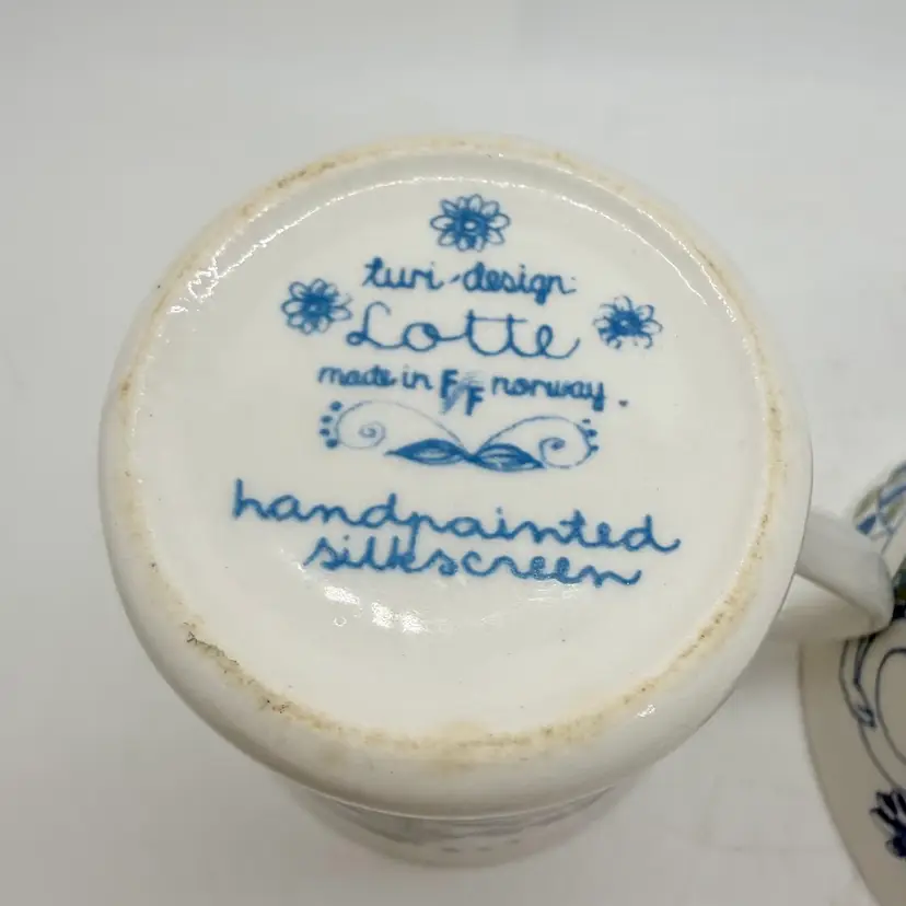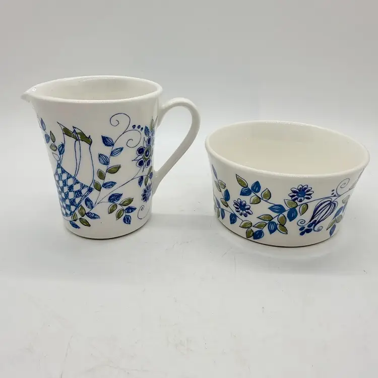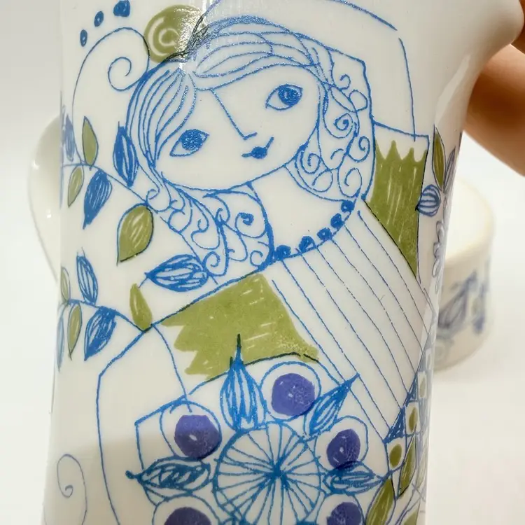 Keywords: mid-century modern, MCM, retro, Norwegian, Scandinavian, ceramic, porcelain, pastel, white, blue, green, purple, people, floral, coupe, tea, coffee, pitcher, open sugar, discontinued, cute, maximalist, country, cottage, cottagecore, fairycore