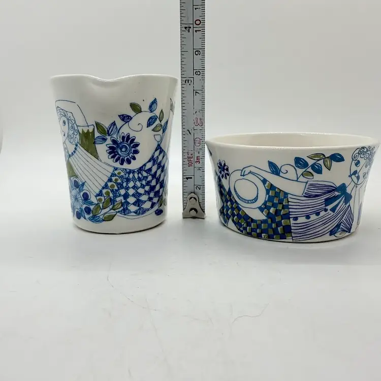 Vintage 1970s Figgjo Norway Lotte Turi Creamer & Sugar Bowl Woman & Man Design. No chips or cracks. Missing mid for sugar dish. Signs of wear and use. There are speckled black spots on the creamer and some light staining on the inside. Light scratches and scuffs. Please see pictures.