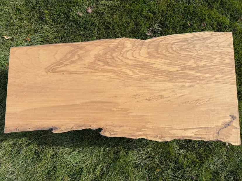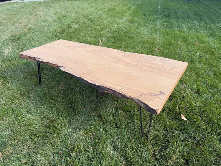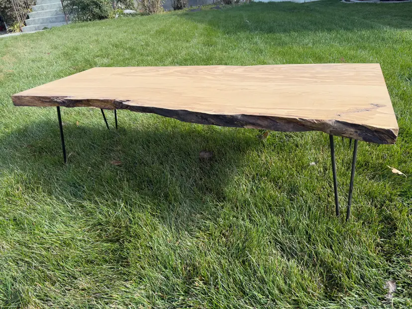 This coffee table is made from a single slab of Ash, this piece has incredible grain with wavy figure throughout the top and small bits of spalting along the live edge. There is a ton of color variety in the grain. The shape of the table follows the grain of the wood, on one side, there’s a live edge that follows where the bark had been on the outside of the three. The other edge is from a crack down the center of the tree that split it in two. The legs are simple black hairpin legs that fit into any home and don’t distract from the beauty of the wood above them