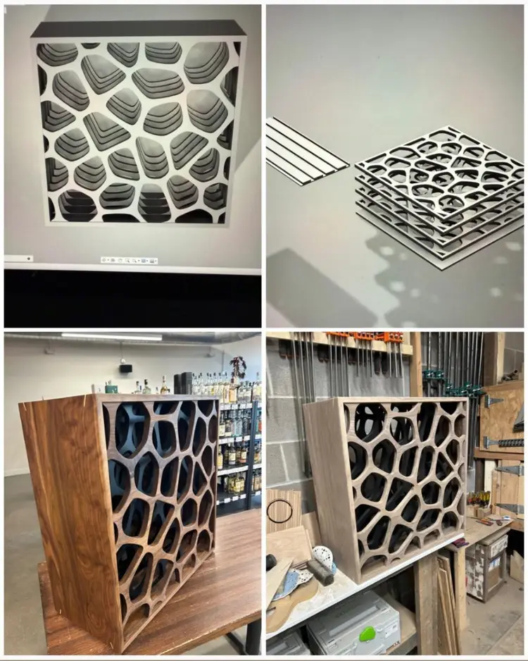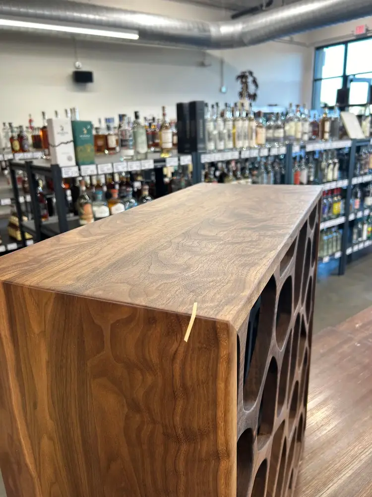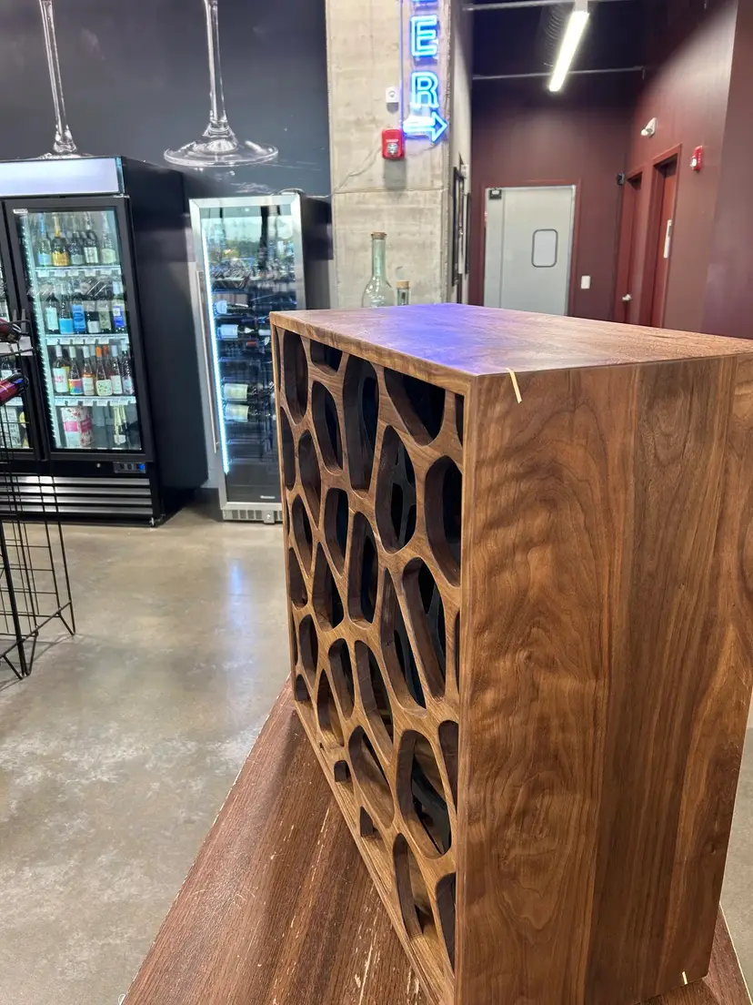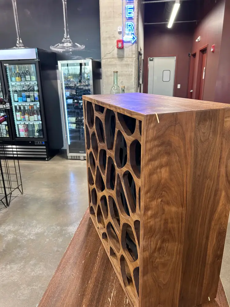 Crafted from rich walnut wood, this wine rack features a unique honeycomb design that combines functionality with modern style. Each organically shaped cell offers secure storage for individual bottles, optimizing space while creating an eye-catching display. The warm tones of the walnut and the organic pattern add a sophisticated touch to any kitchen, dining room, or wine cellar. Durable and thoughtfully designed, this wine rack is perfect for organizing your collection with elegance and ease!