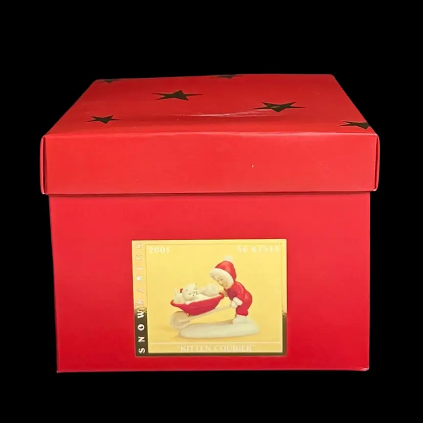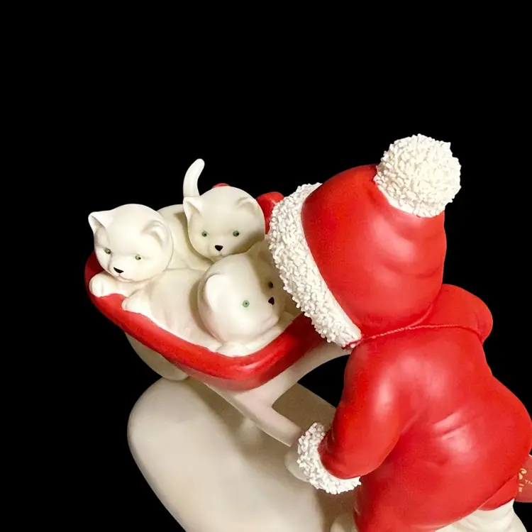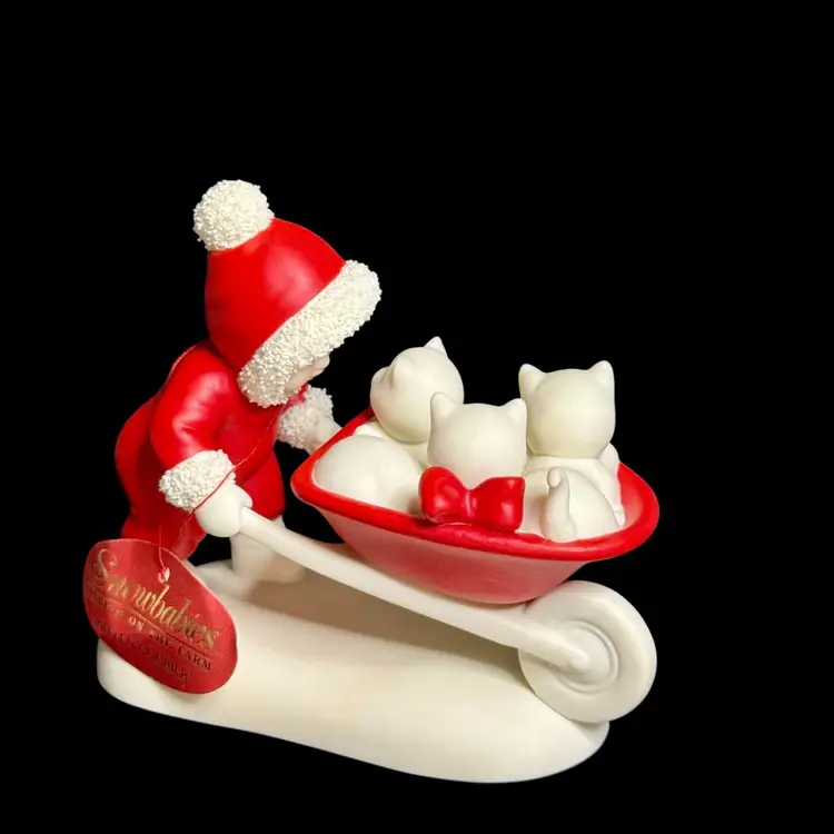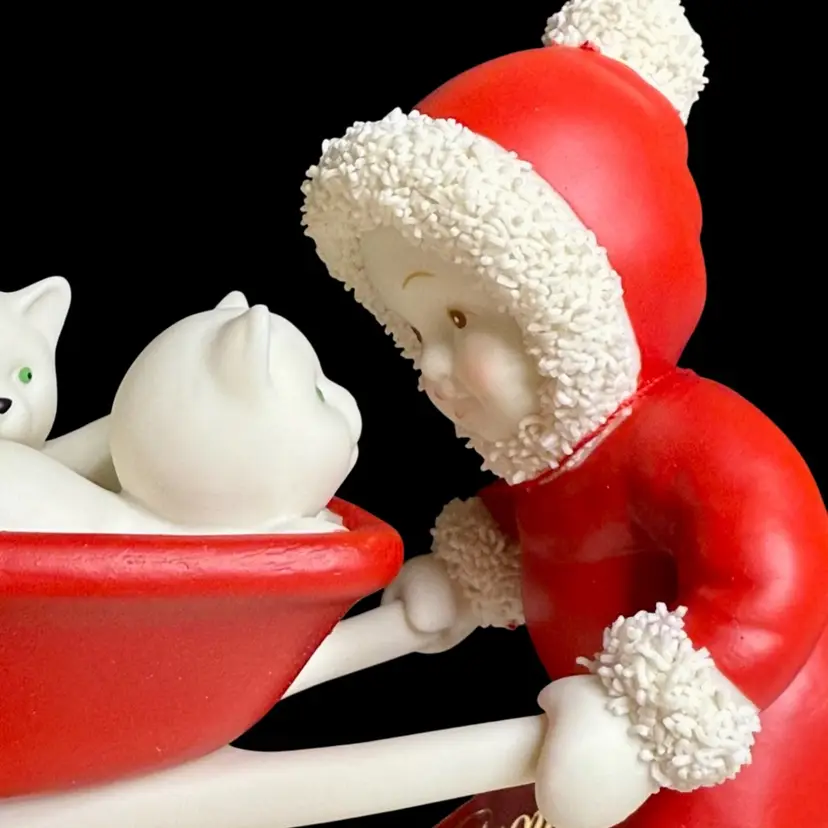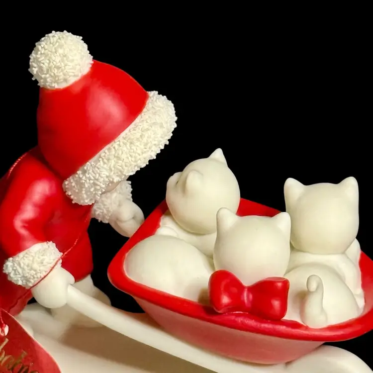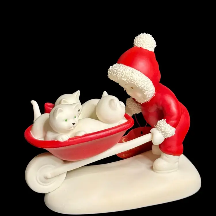 Embrace the charm of winter with the Department 56 Snowbabies 2001 "Kitten Courier" figurine. This delightful piece features the beloved Snowbaby character accompanied by her three feline friends, all crafted from fine bisque porcelain.